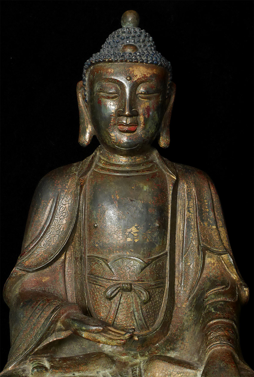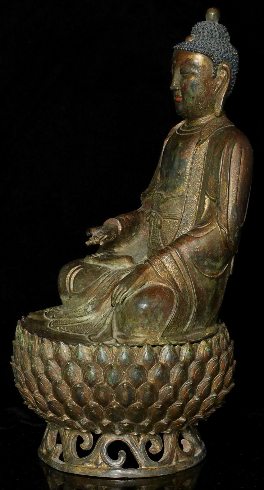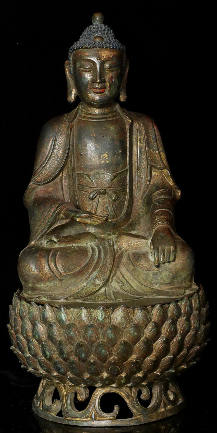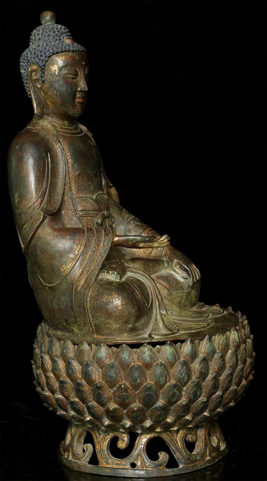 Finely cast Ming style Bronze Buddha. I do not believe it is as old as it appears. If it were, at 20 inches tall, it would be likely sell for $30,000 or more. I purchased it early in my collecting for an extremely high price, and never have been able to bring myself to post it on my website until now., I now believe it is that it is 20th century. It is a Buddha with a strong presence and tremendous beauty. Price is less than 20% of what it would cost if it were a 16th century example. Very impressive at 20 inches tall, 9 inches in diameter, and extremely heavy.