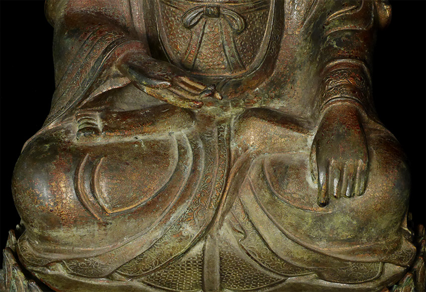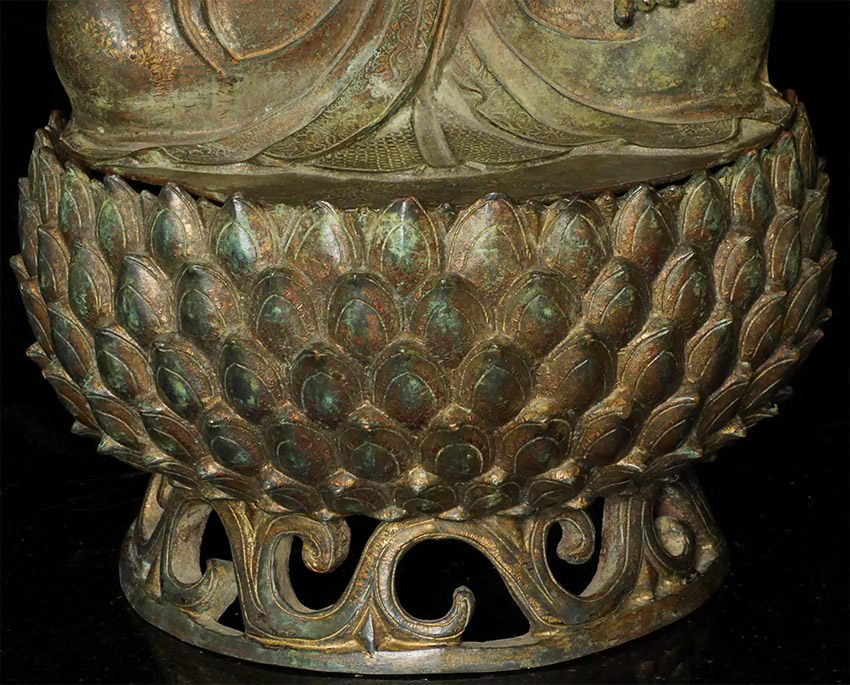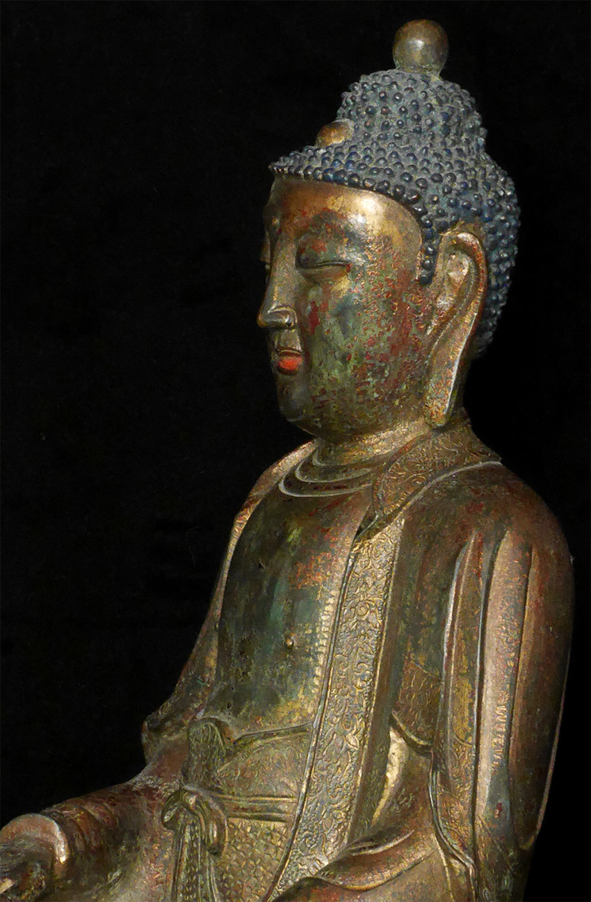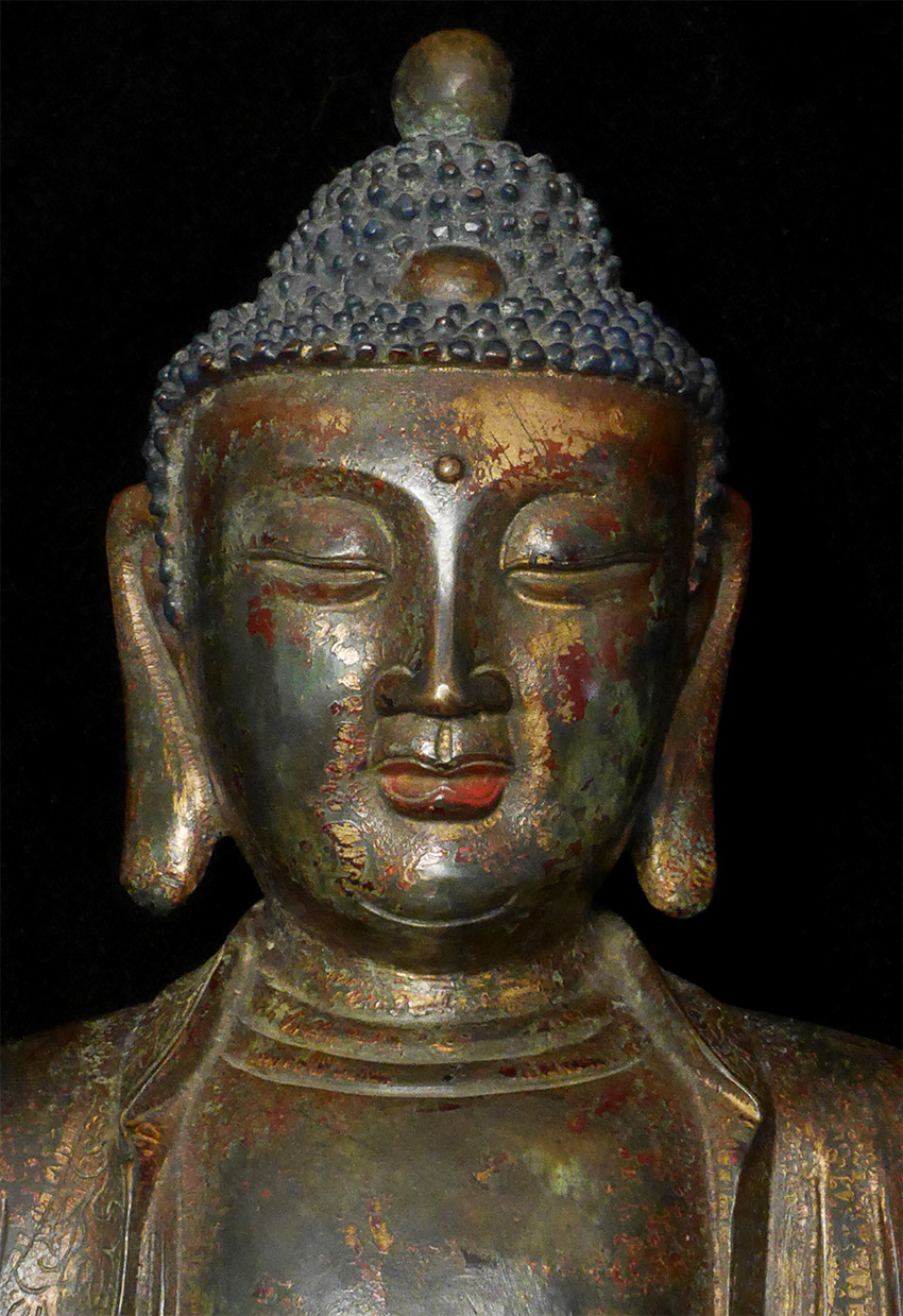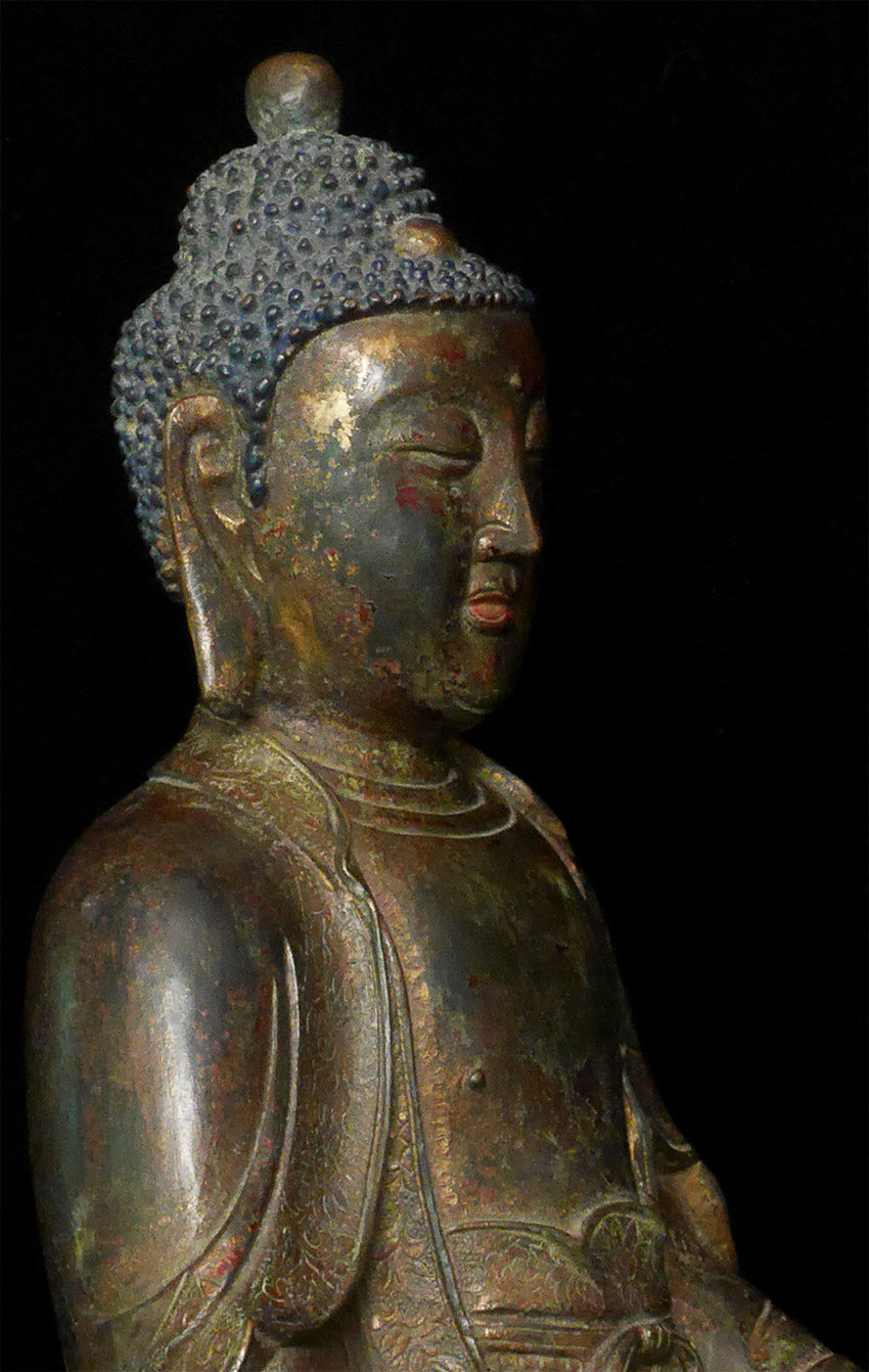 Finely cast Ming style Bronze Buddha. I do not believe it is as old as it appears. If it were, at 20 inches tall, it would be likely sell for $30,000 or more. I purchased it early in my collecting for an extremely high price, and never have been able to bring myself to post it on my website until now., I now believe it is that it is 20th century. It is a Buddha with a strong presence and tremendous beauty. Price is less than 20% of what it would cost if it were a 16th century example. Very impressive at 20 inches tall, 9 inches in diameter, and extremely heavy.