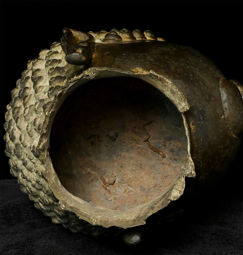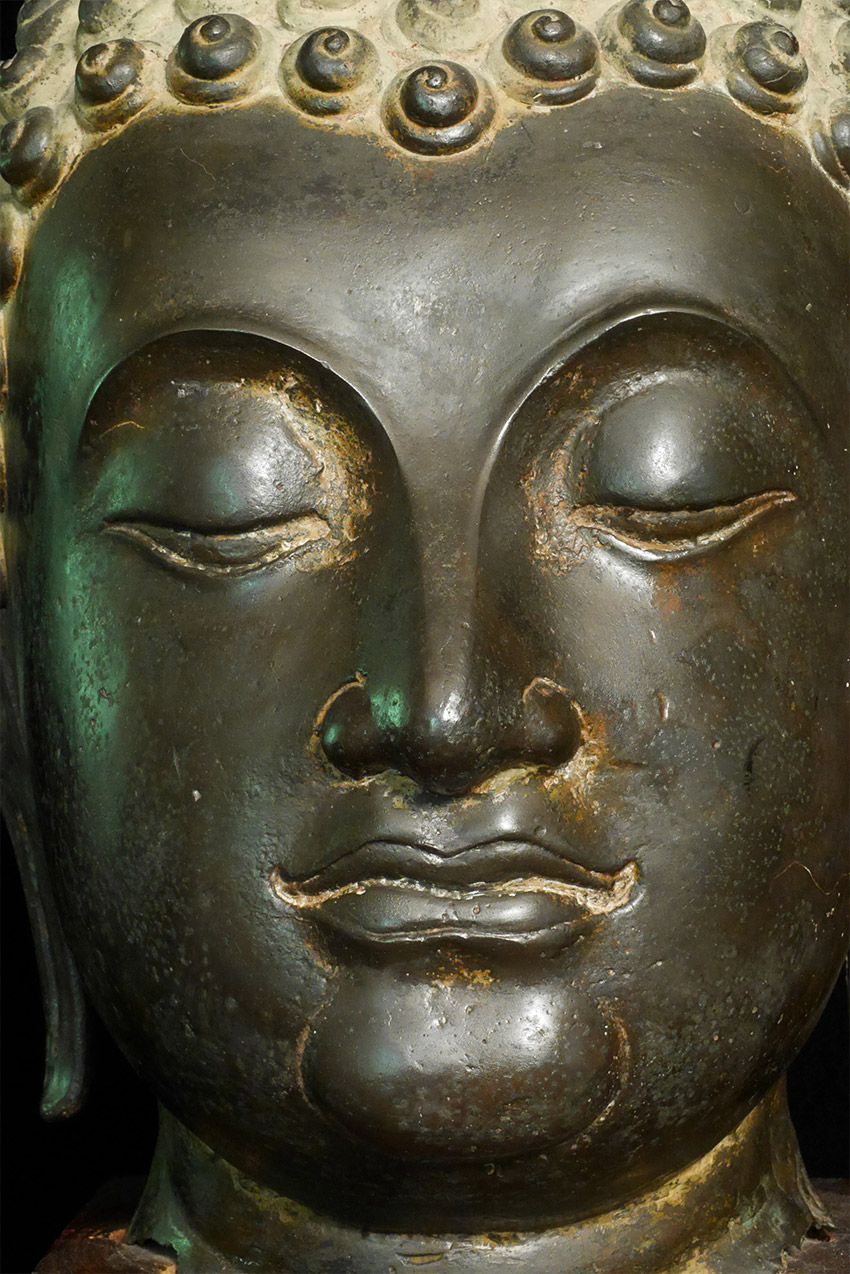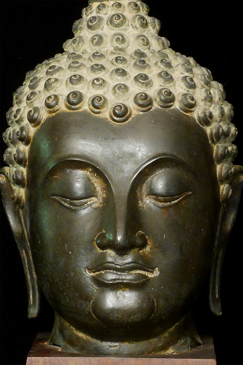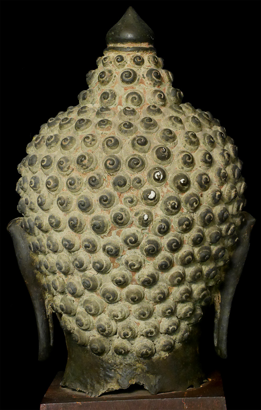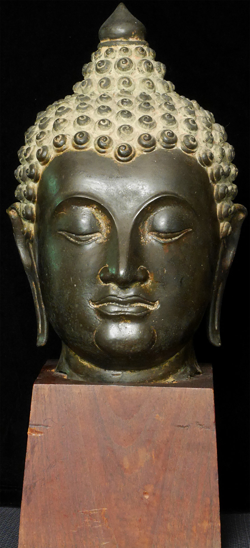 Superb near monumental antique Thai Buddha head. Size of bronze alone is 14.75 inches tall, 21.5 inches on base. Bottom of base measures 7.5 x 7 5/8 inches. Dating unclear, as this is either an 18/19thC example, or is one of the best 20th century examples I've seen. The corrosion in the eye sockets and mouth, and overall quality of casting suggest an earlier dating, the lack of wear, traces of lacquer, or evidence of being attached to a body at one time all point to it likely being 20th century. Either way it is large, beautiful, powerful, with great presence, and a great piece of sculpture. Priced as 20th century.