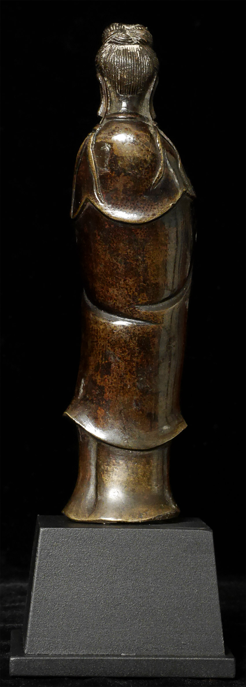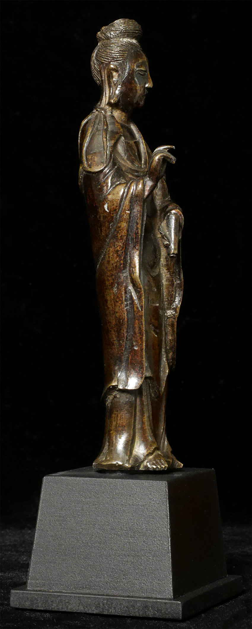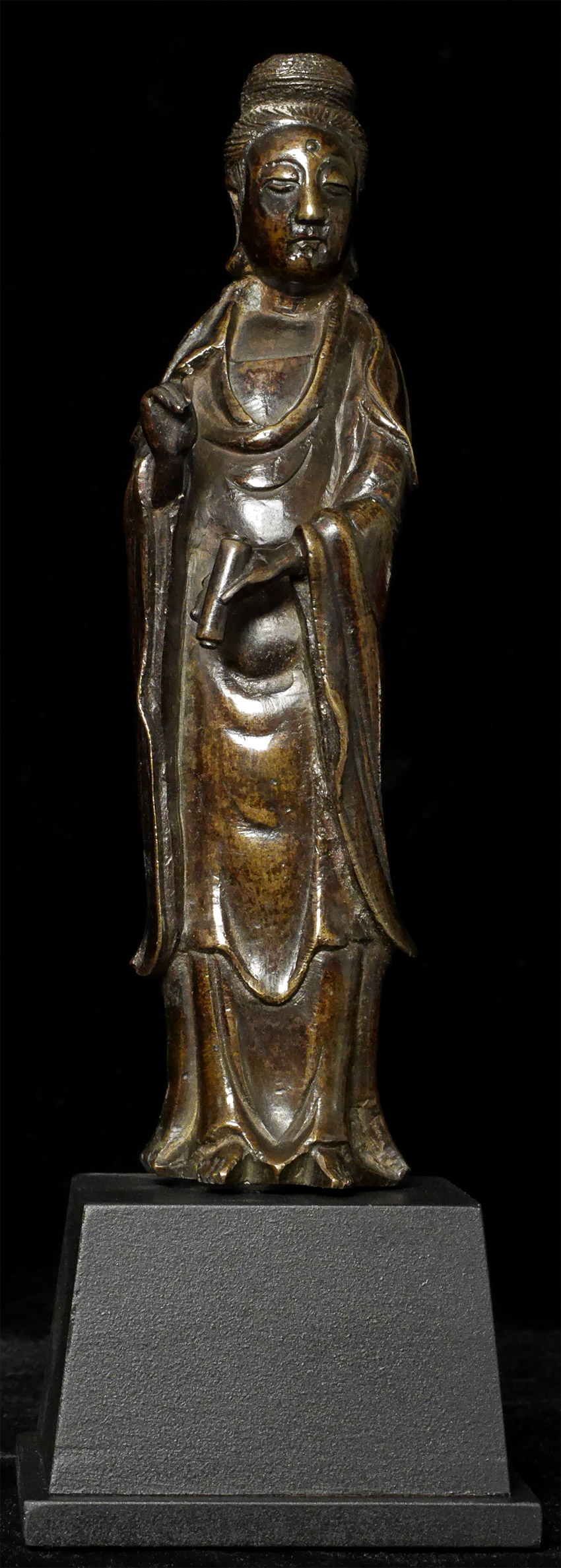 18/19thC Chinese Bronze Quanyin. Stands 6.25 inches tall, 8 inches on custom stand. Deeply serene countenance. Domestic shipping is included, and international shipping is $50.