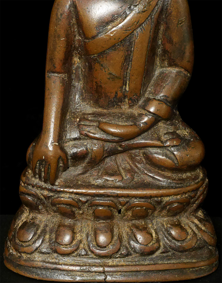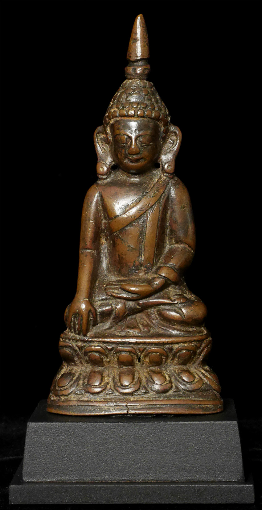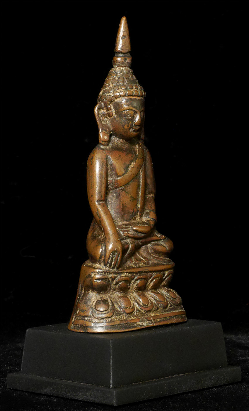 Very sweet 17/18thC South China (Yunnan) Buddha. It has influences from China and Southeast Asia combined. Sits happily at 5-1/8 inches tall, 6.25 inches on a custom stand. Very sweet! An uncommon and unique type of Chinese Buddha that bridges major areas of Buddhism in a single sculpture. Domestic shipping is included, and international shipping is $50.