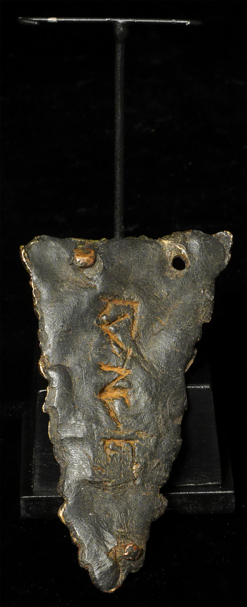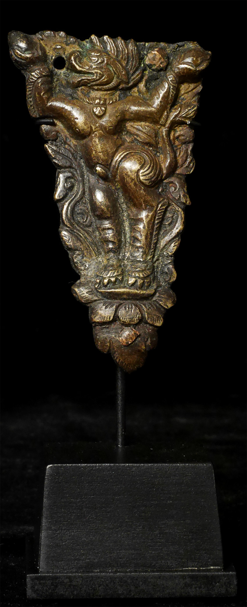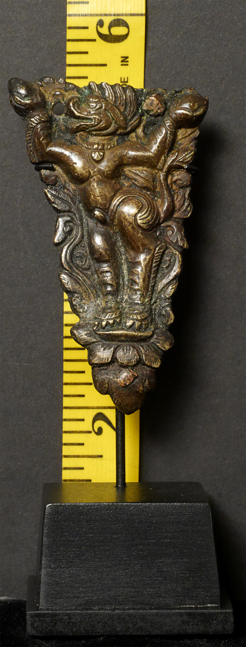 Lively antique bronze Snow Lion- appears to have originally been a leg for an altar or a stupa. Stands 3.5 inches tall, 5 3/8 inches on custom stand.Lots of energy in this figure.