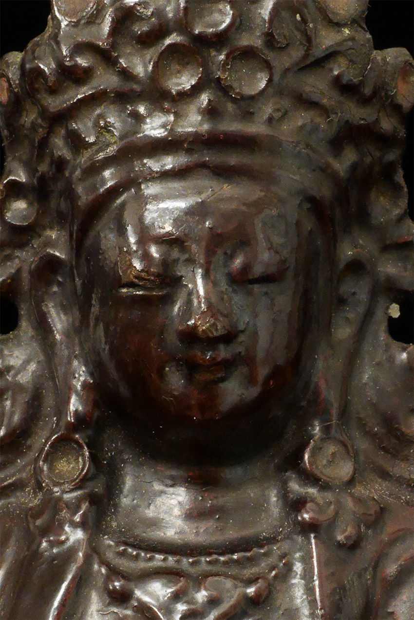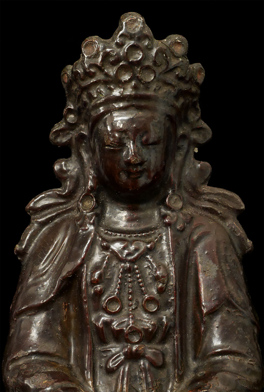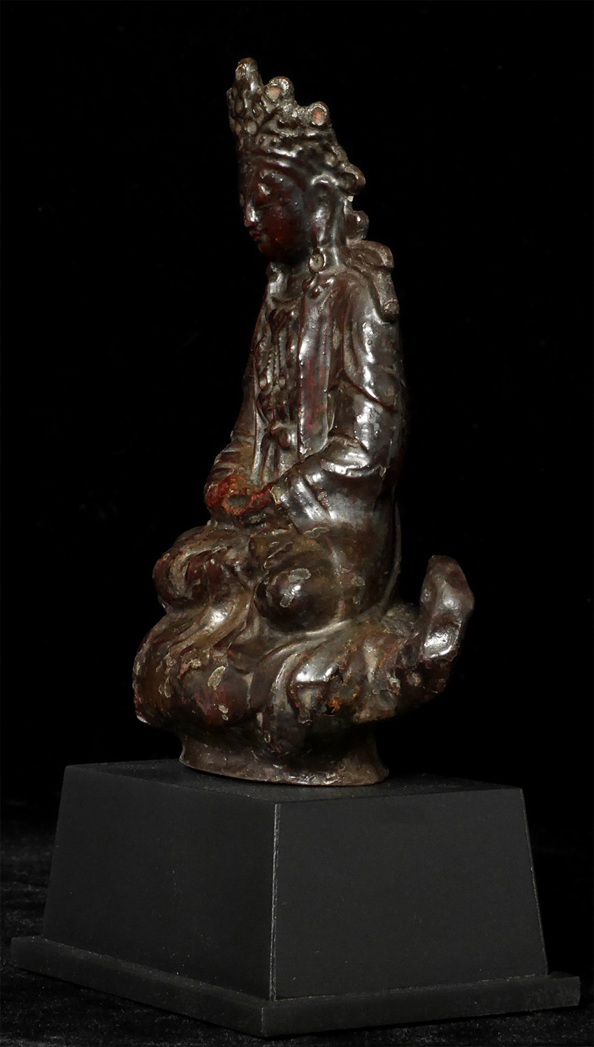 Lovely face, beautiful composition. Thick red-brown lacquer may be original or may have been re-lacquered early in its life. Overall a beautiful statue. May have had attendants (now missing, crude obvious repairs) 6 inches tall, 8 inches on a custom stand.