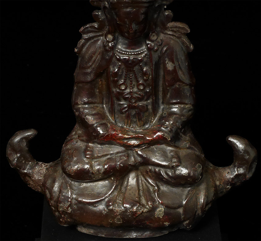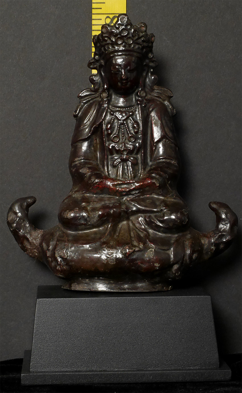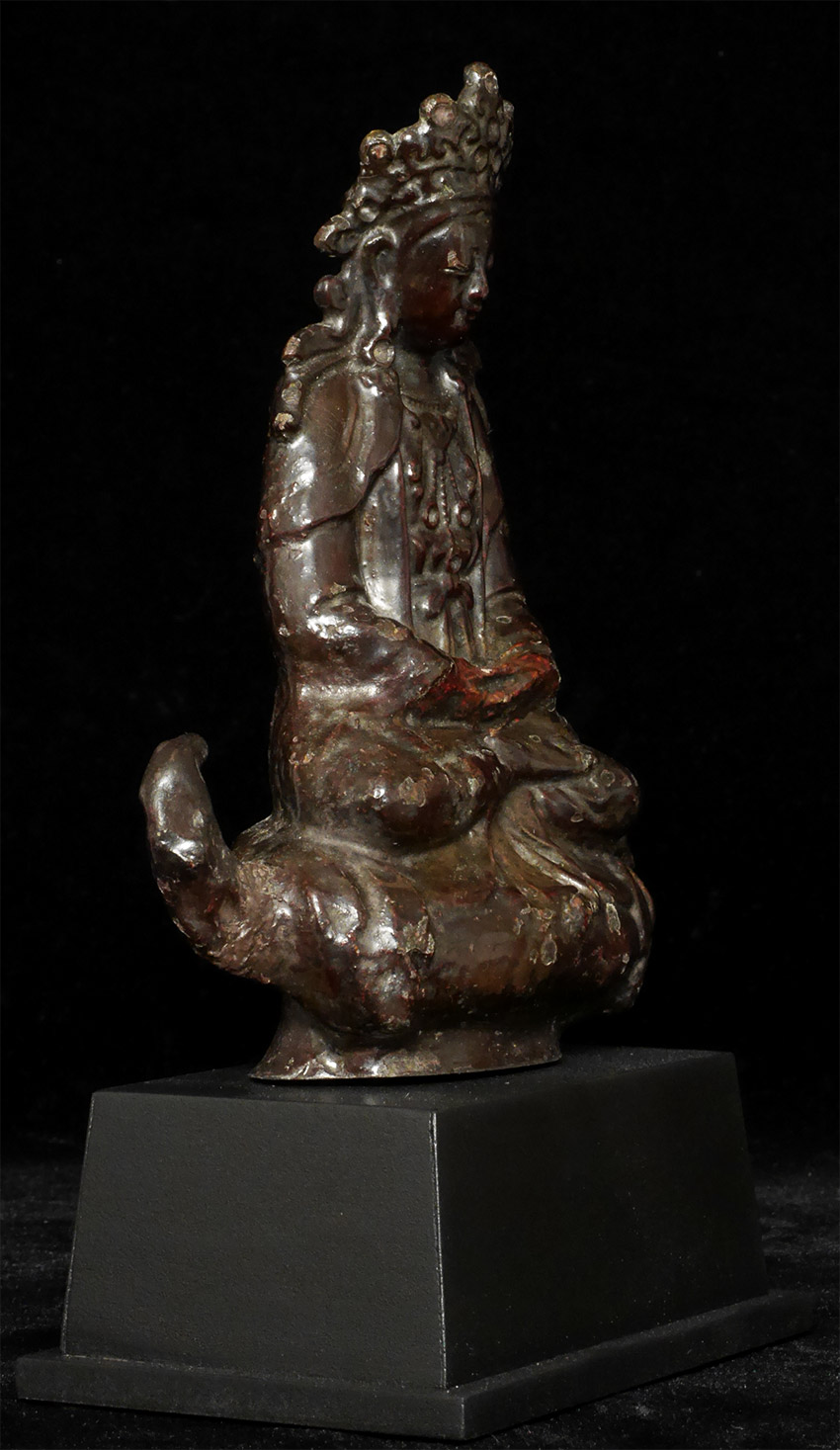 Lovely face, beautiful composition. Thick red-brown lacquer may be original or may have been re-lacquered early in its life. Overall a beautiful statue. May have had attendants (now missing, crude obvious repairs) 6 inches tall, 8 inches on a custom stand.