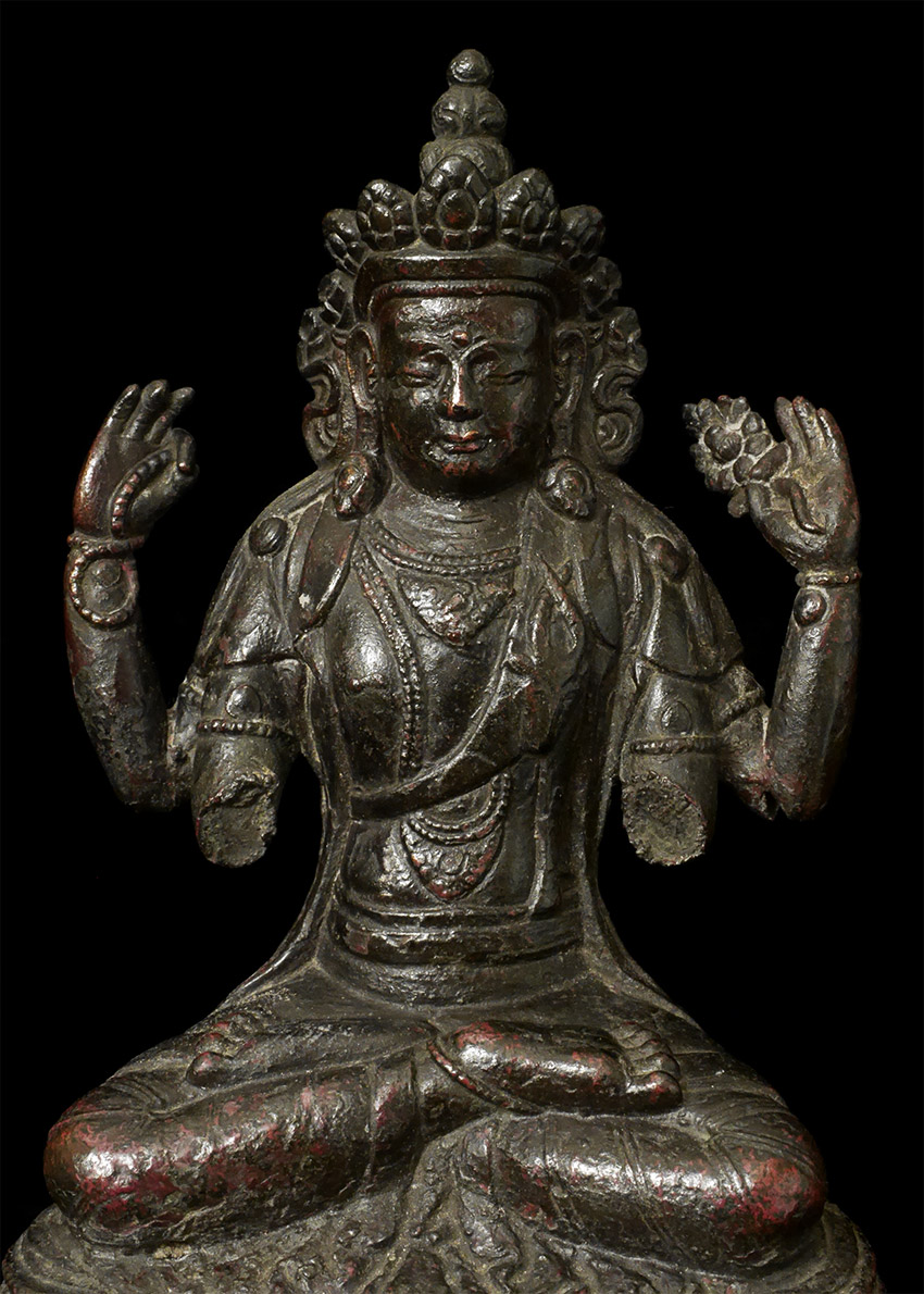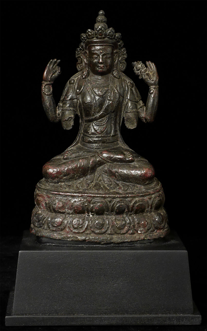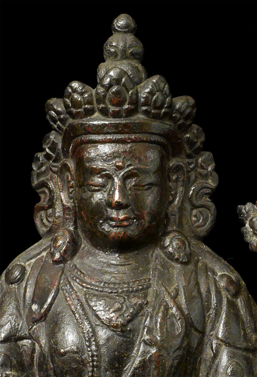 18thC or earlier Tibetan Bodhisattva. May have been in a fire. Very beautiful face, and deeply serene overall feel. 5 7/8 inches tall, 7 5/8 inches on custom stand. Losses as seen in the photos