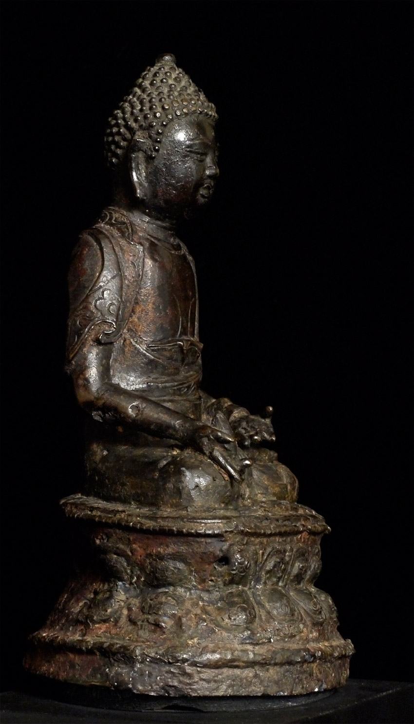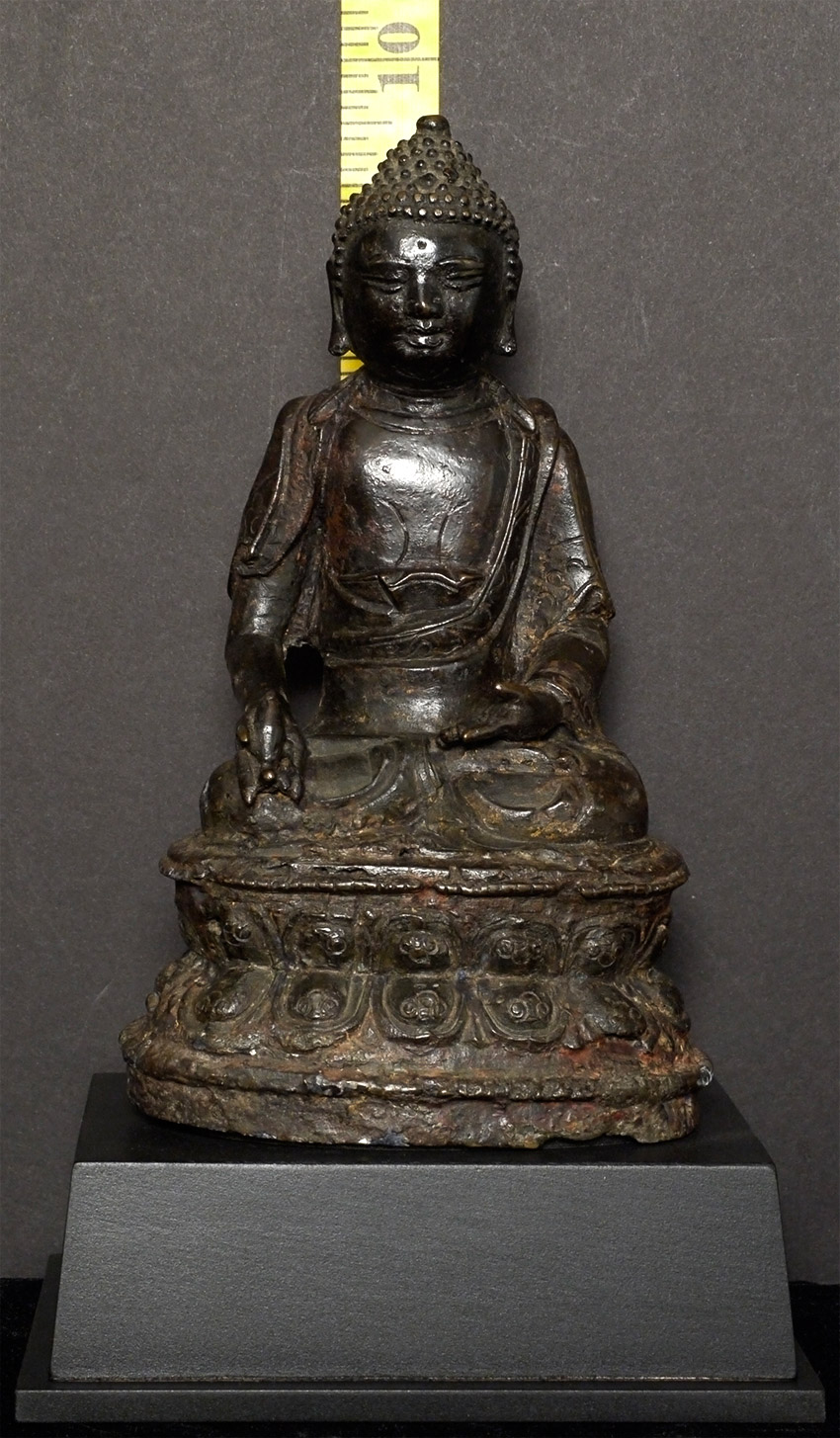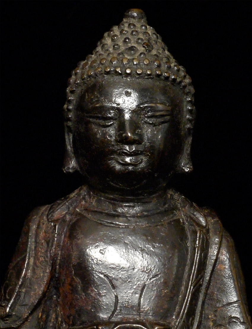 Good Chinese Ming Bronze Buddha. Nice example of its type, with a particularly nice face. Stands 8 inches tall, 9.5 inches on custom stand