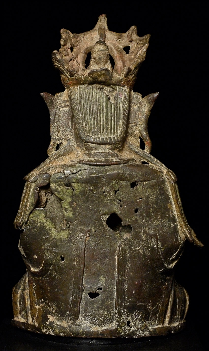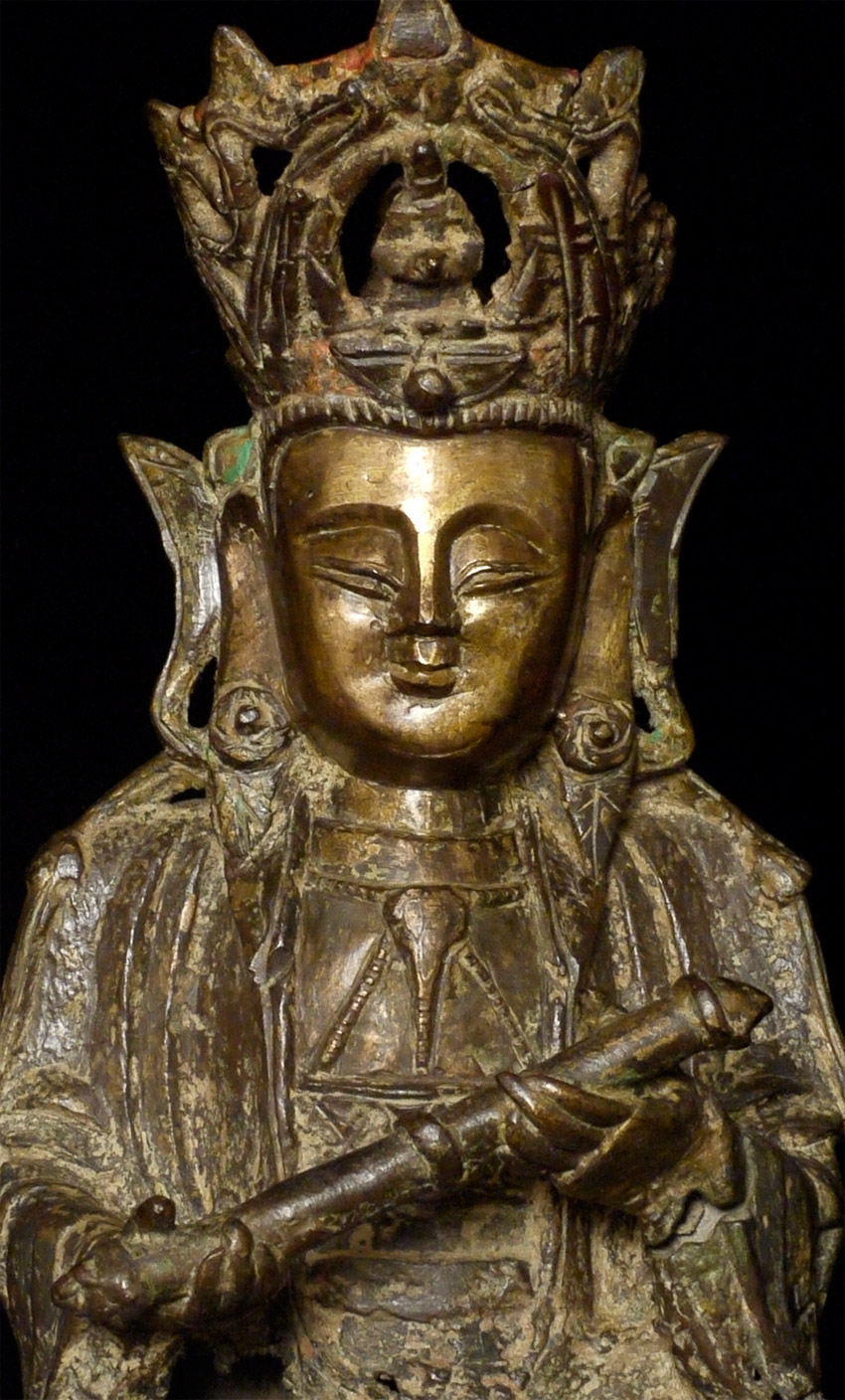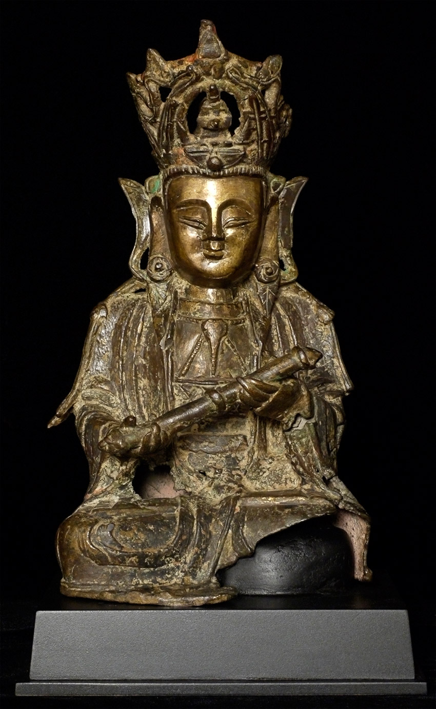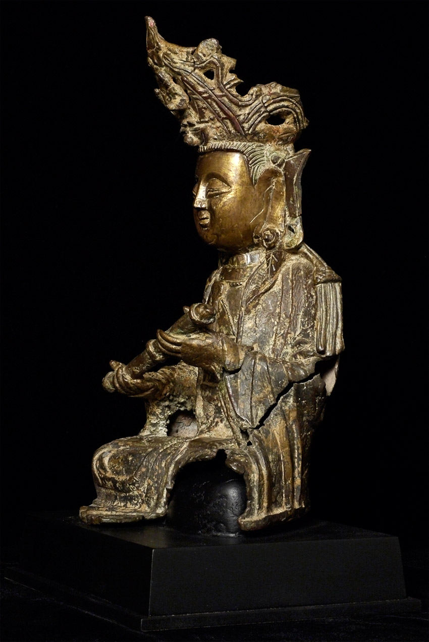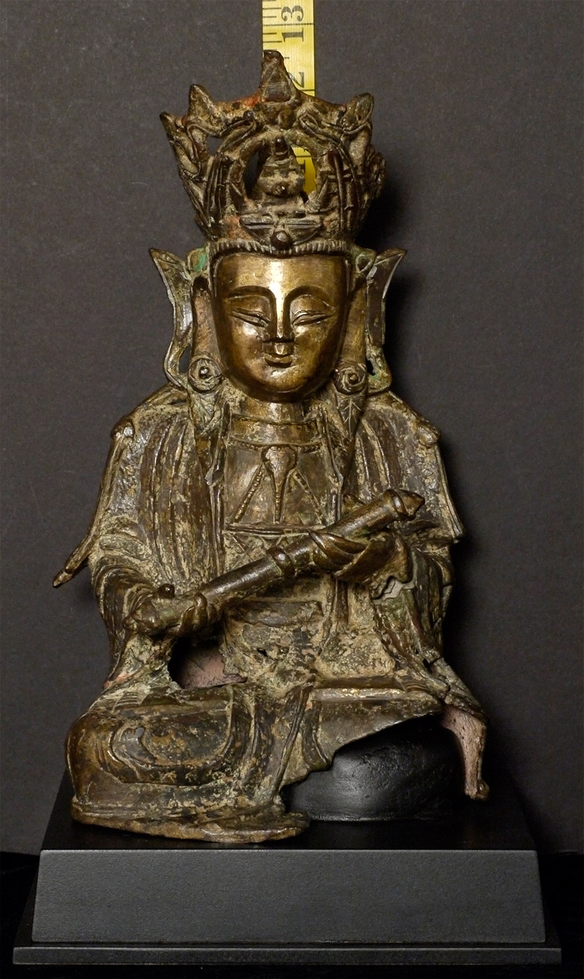 Large Ming Bronze Bodhisattva of Compassion with beautifully rolled scroll. Probably smashed and burned during the 1960's during the cultural revolution in China, and later resurrected from the debris with the advent of metal detectors 20 or 30 years later. On custom base. Losses and condition issues as seen in the photos. Of this quality and unusual hair scroll and other uncommon features, with this wonderful face and overall look, this piece would be amazing if perfect. It is still quite wonderful just as it is.