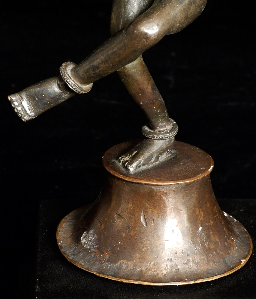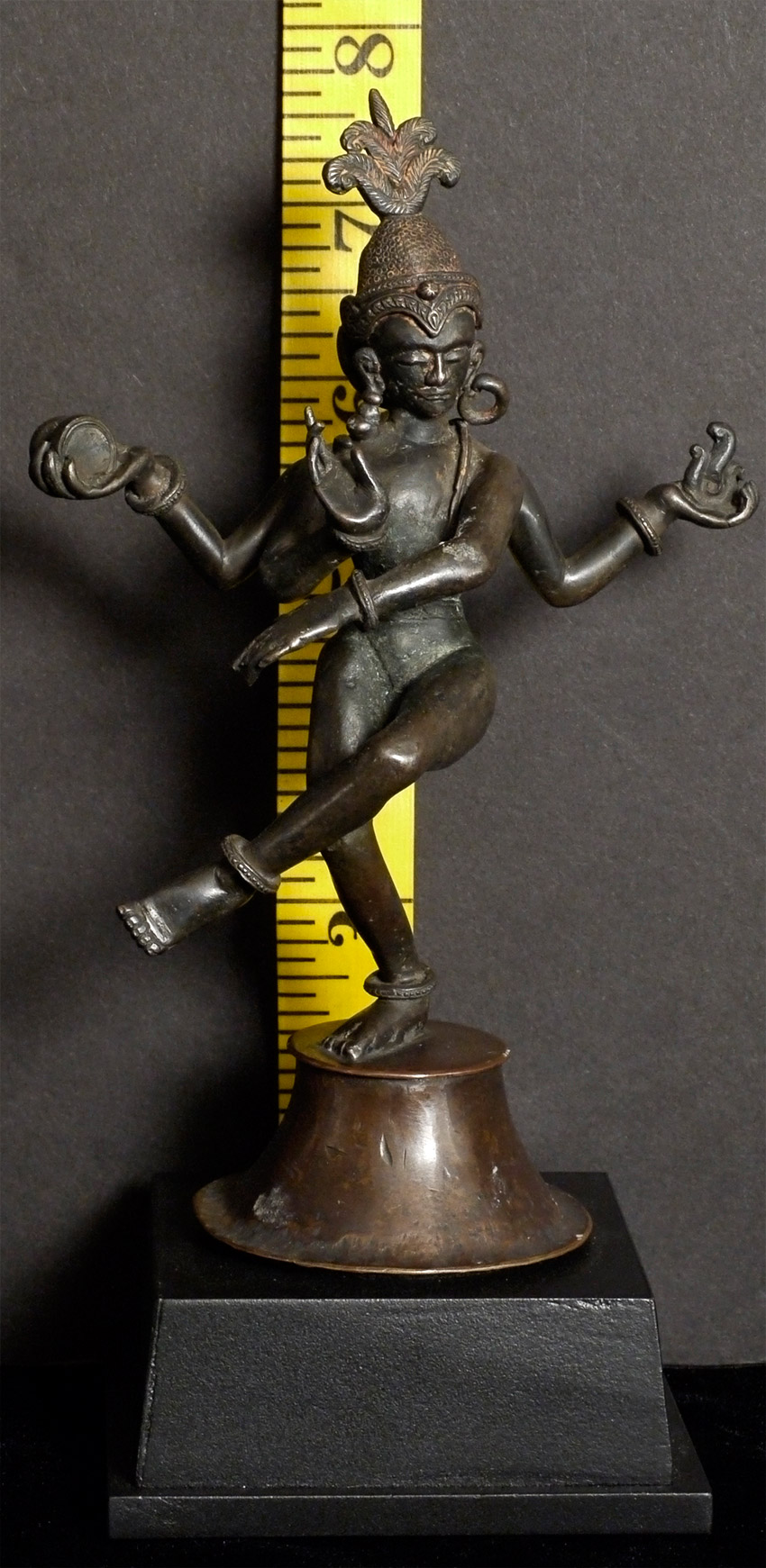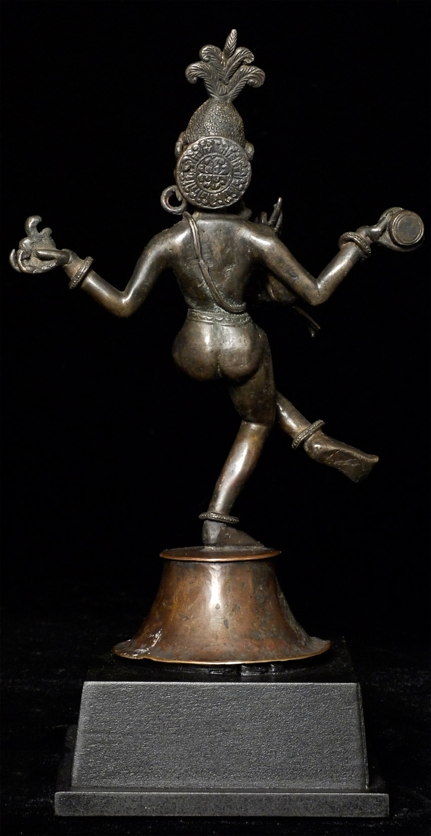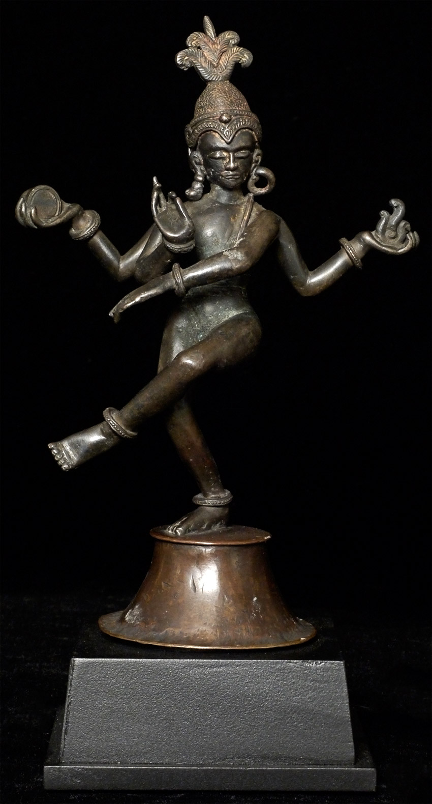 Indian Shiva Nataraj- Lord of the Dance- dancing the cosmic circle of creation and destruction. As with the best of this type, his face embodies equanimity and concentration. This piece is quite rare for several reasons. Silver body and head, base and possibly ornaments are bronze.