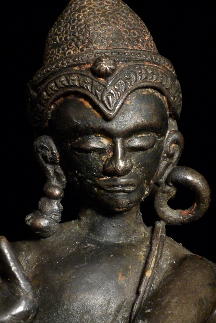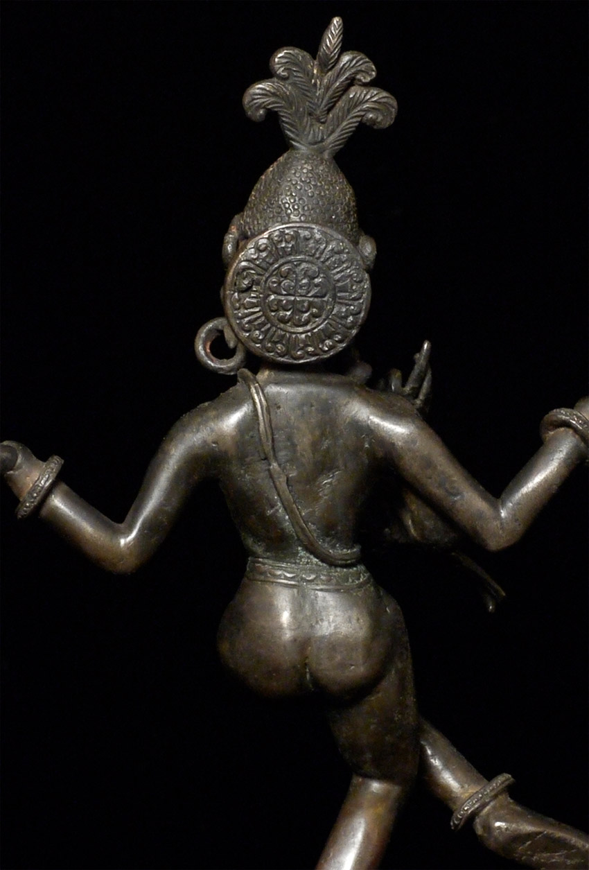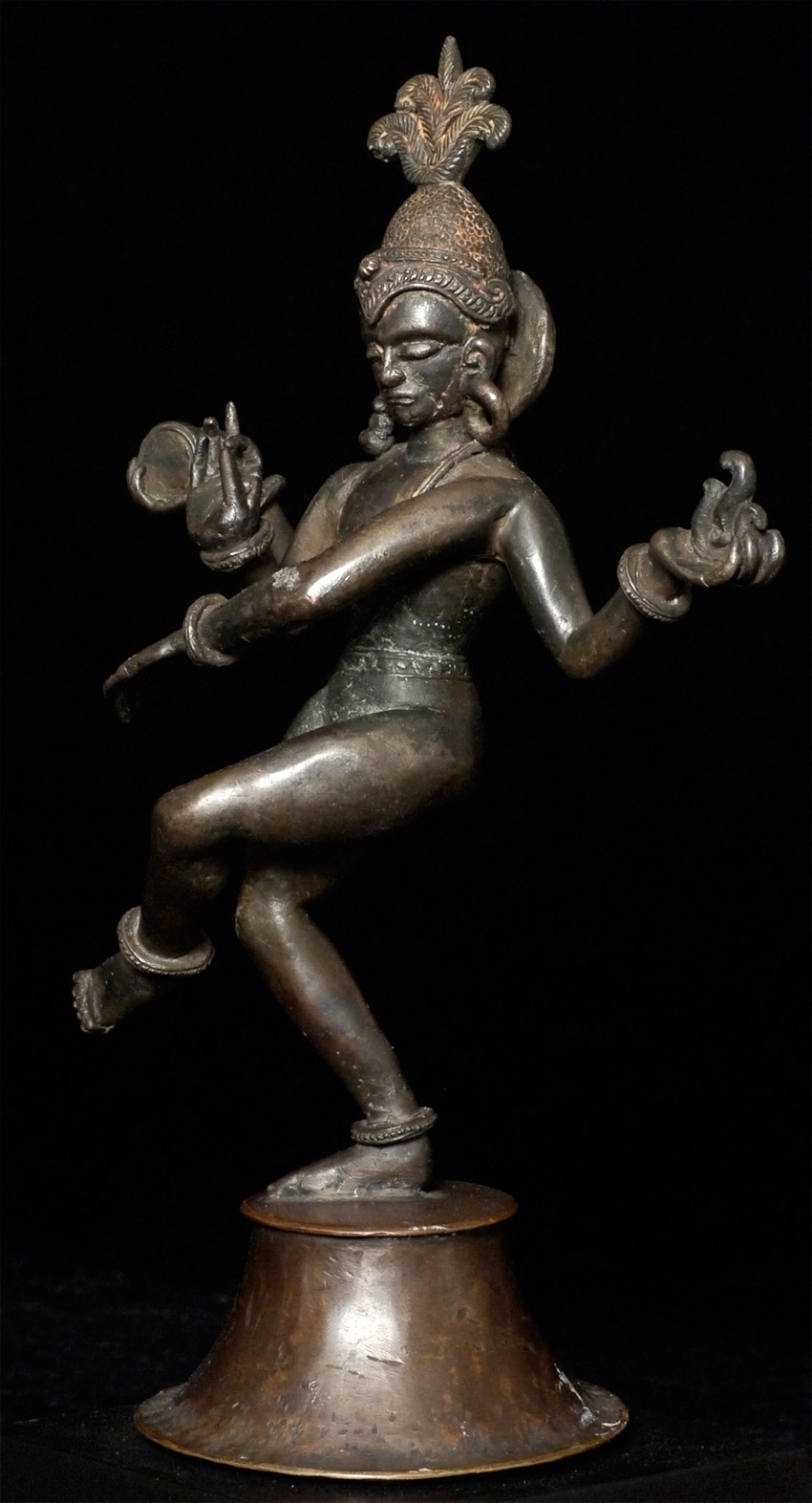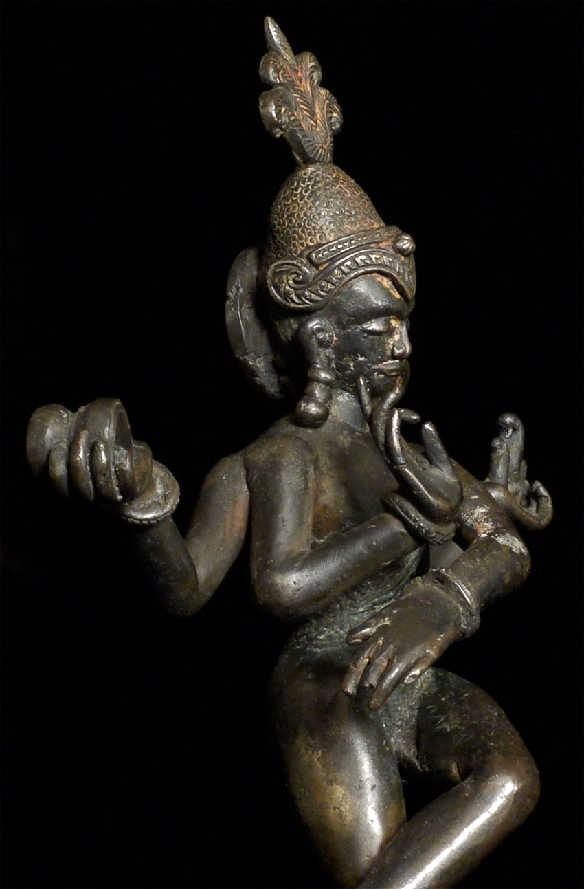 Indian Shiva Nataraj- Lord of the Dance- dancing the cosmic circle of creation and destruction. As with the best of this type, his face embodies equanimity and concentration. This piece is quite rare for several reasons. Silver body and head, base and possibly ornaments are bronze.