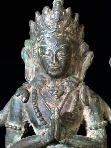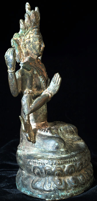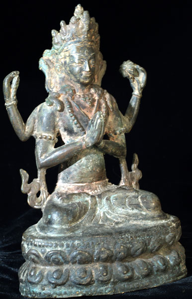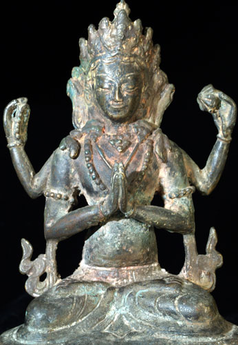 Delightful Bodhisattva of Compassion. Shows generations of devotion- obviously spent a long time on an altar- the traces of red are remins of old Puja powder. Sits 7.5 inches tall. Wonderful face and overall feel.