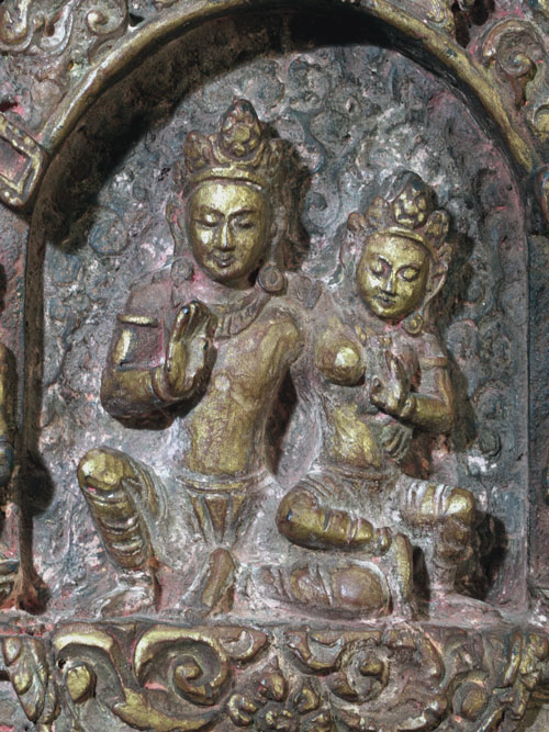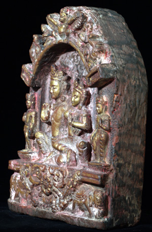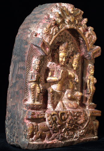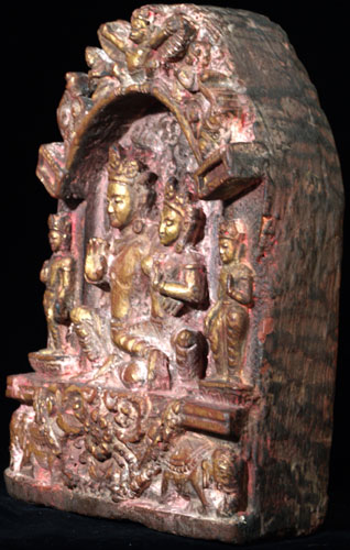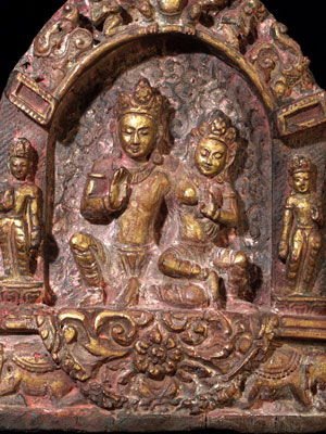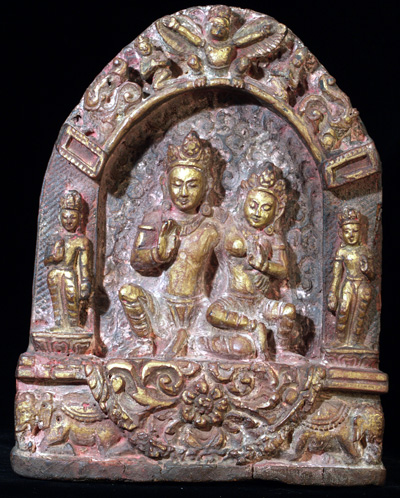 Finely and deeply carved stele of 2 Hindu or Buddhist Deities, with Garuda above, and attendants to either side. It comes from the collection of a gentleman who spent considerable time in Nepal while his wife worked on blindness prevention research. He felt that it probably spent much of its life in a niche inside a temple wall. He believed that it was very old.