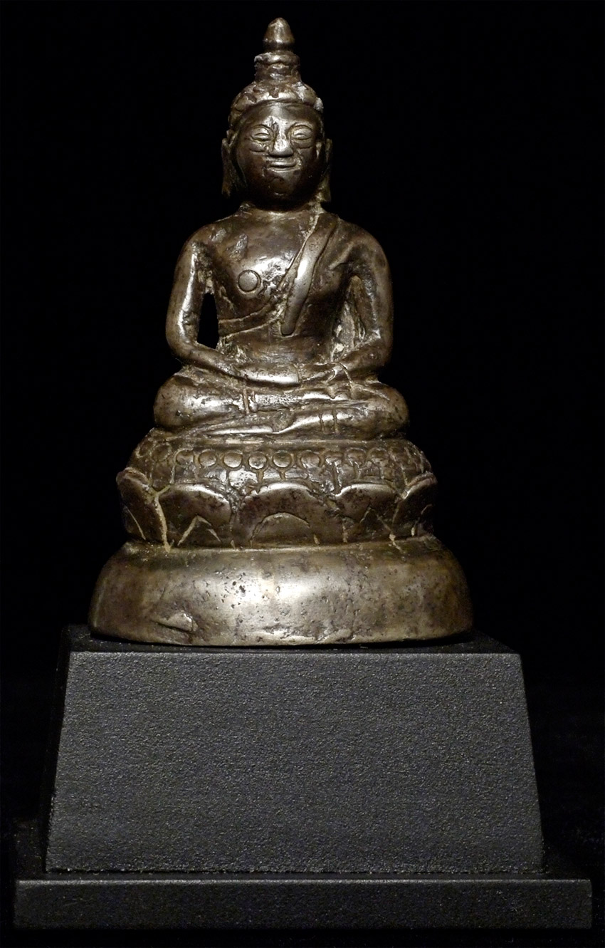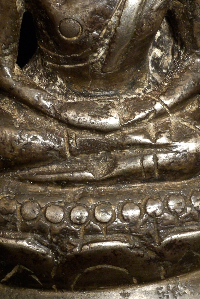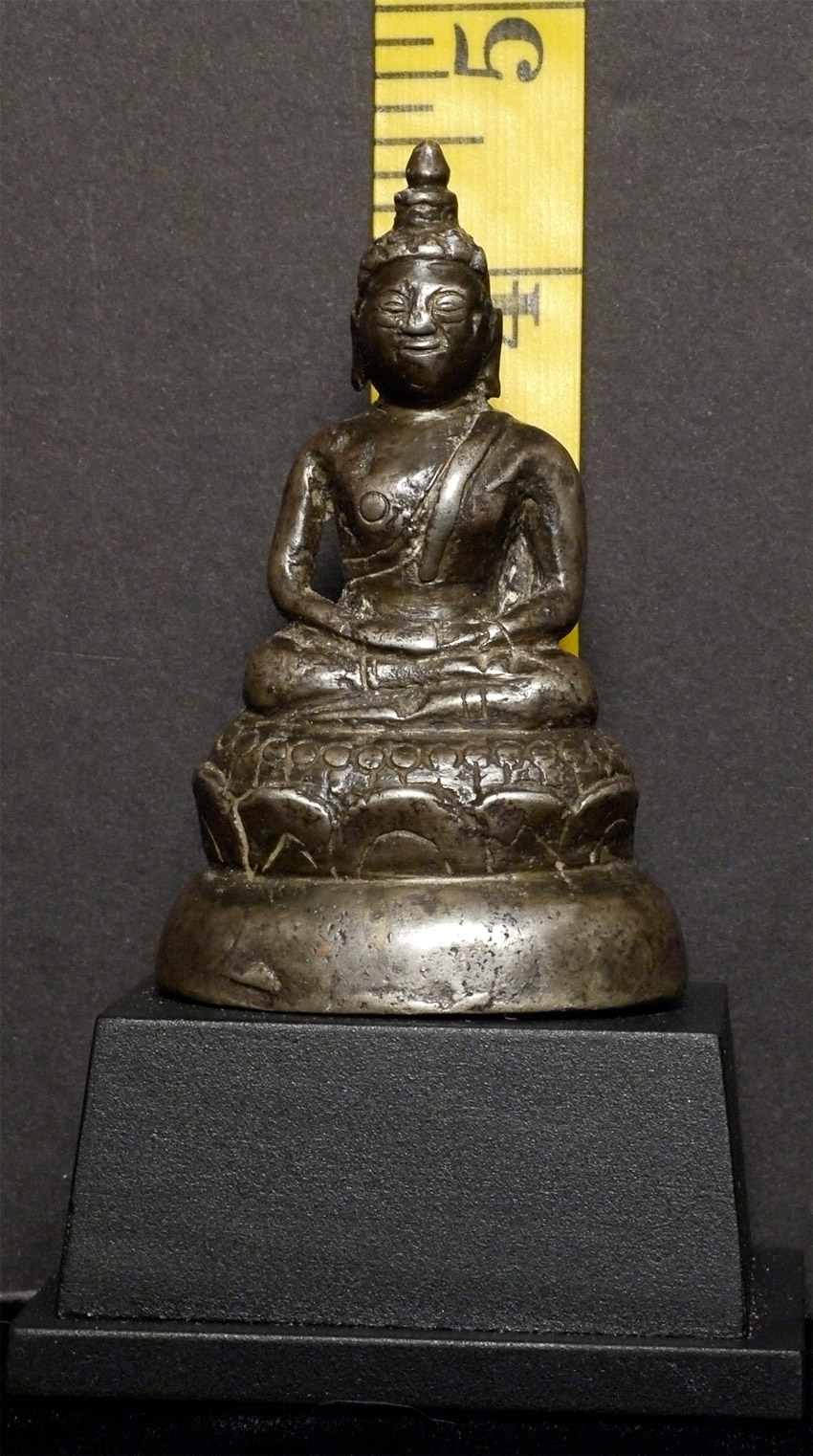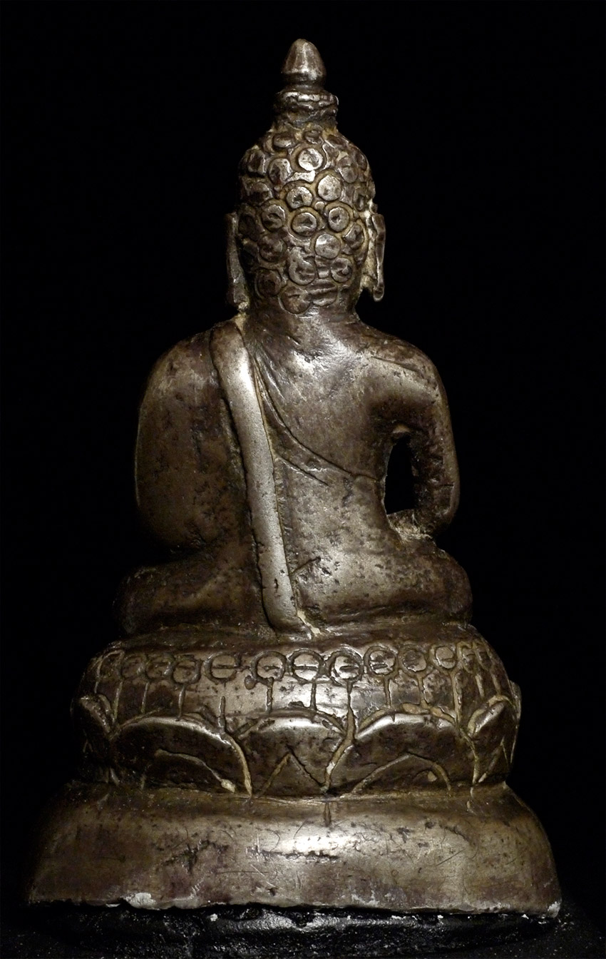 Very unusual thickly cast 18thC Laos silver Buddha. Sits 3 inches tall.