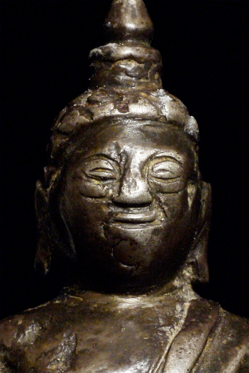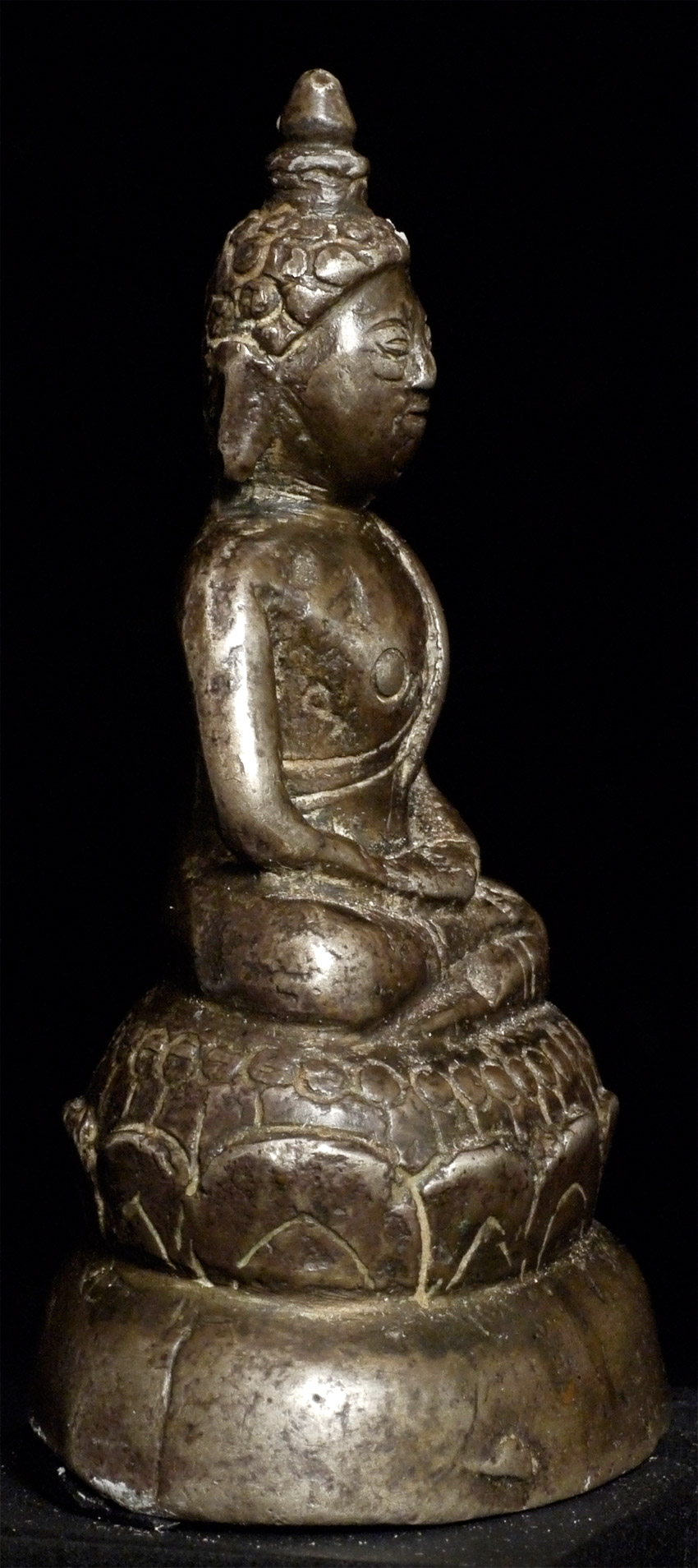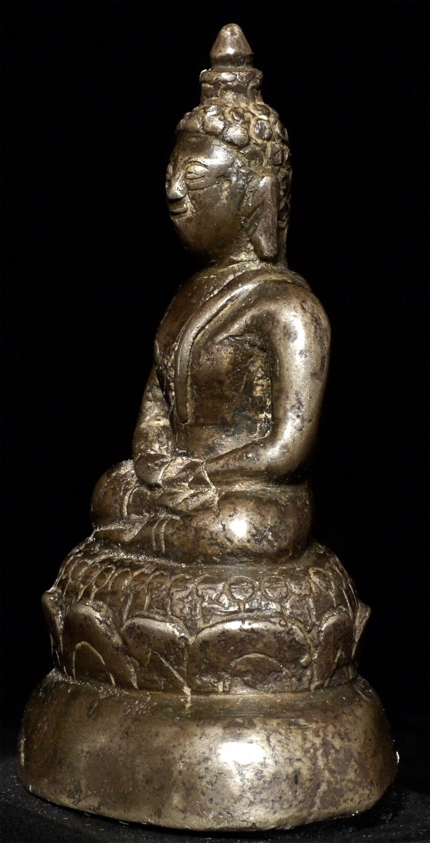 Very unusual thickly cast 18thC Laos silver Buddha. Sits 3 inches tall.