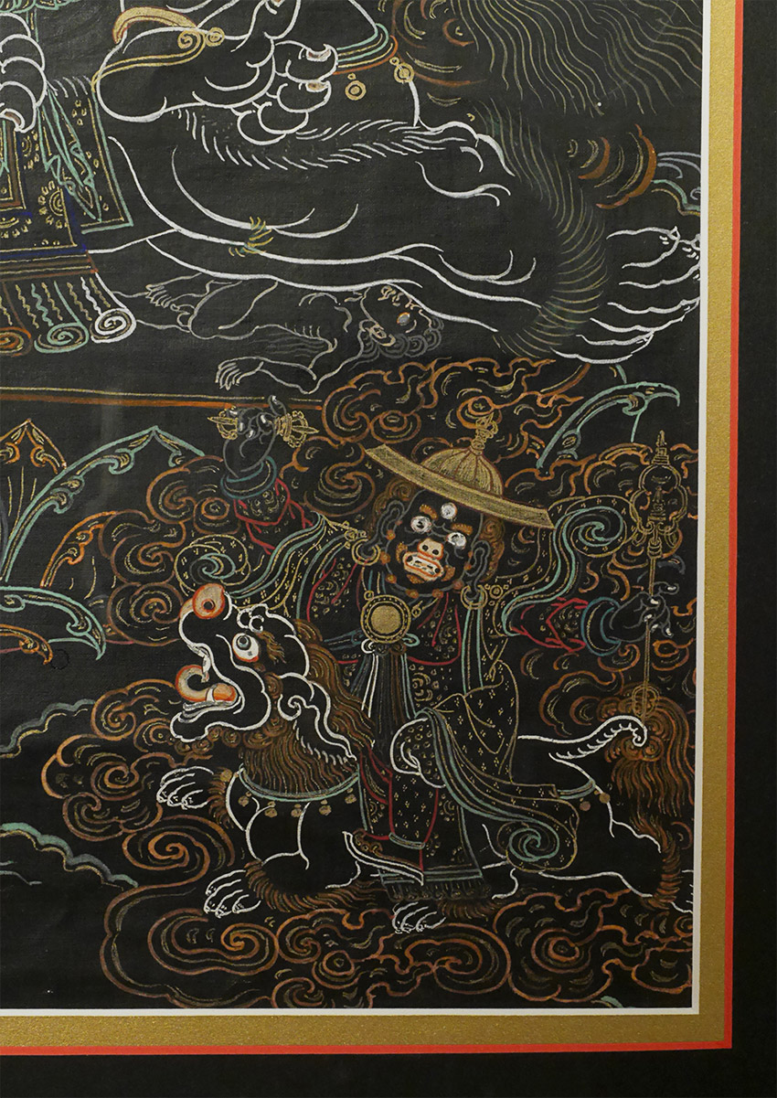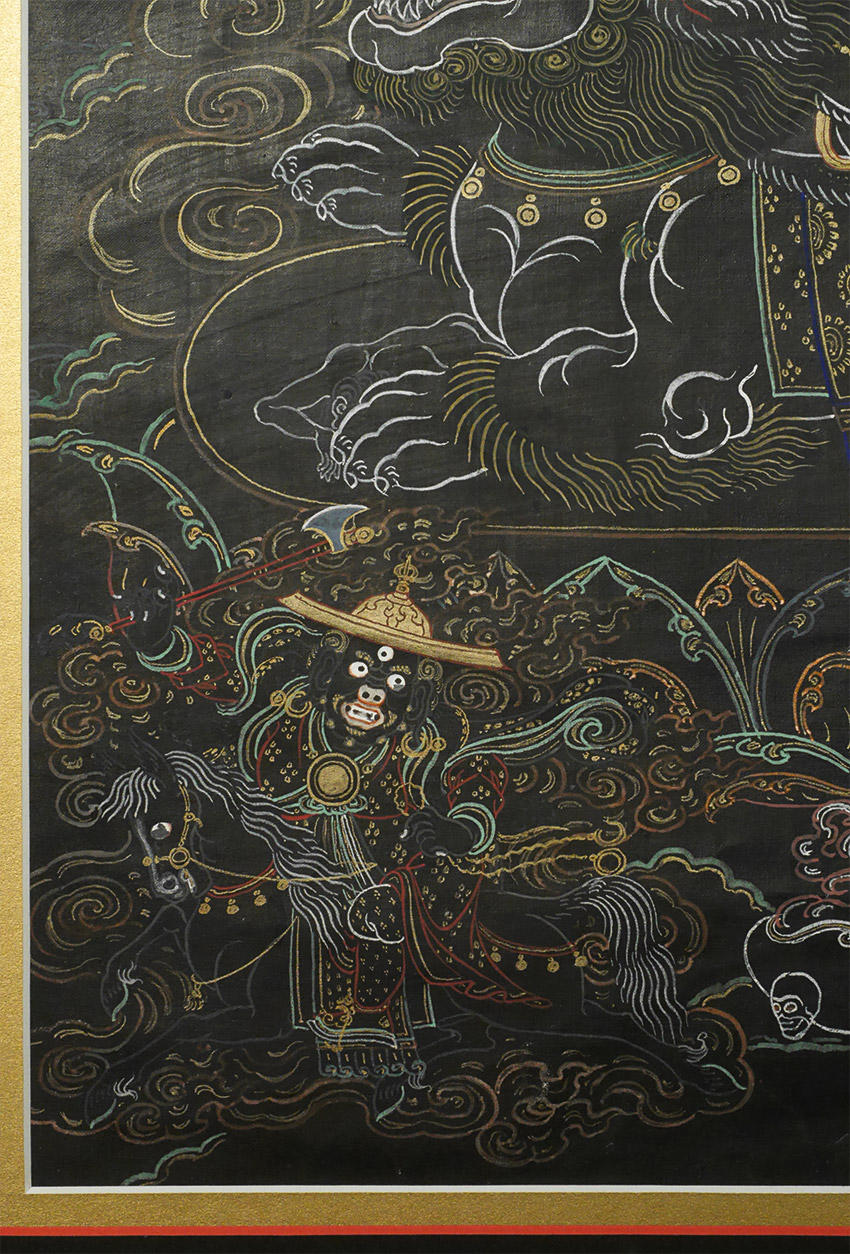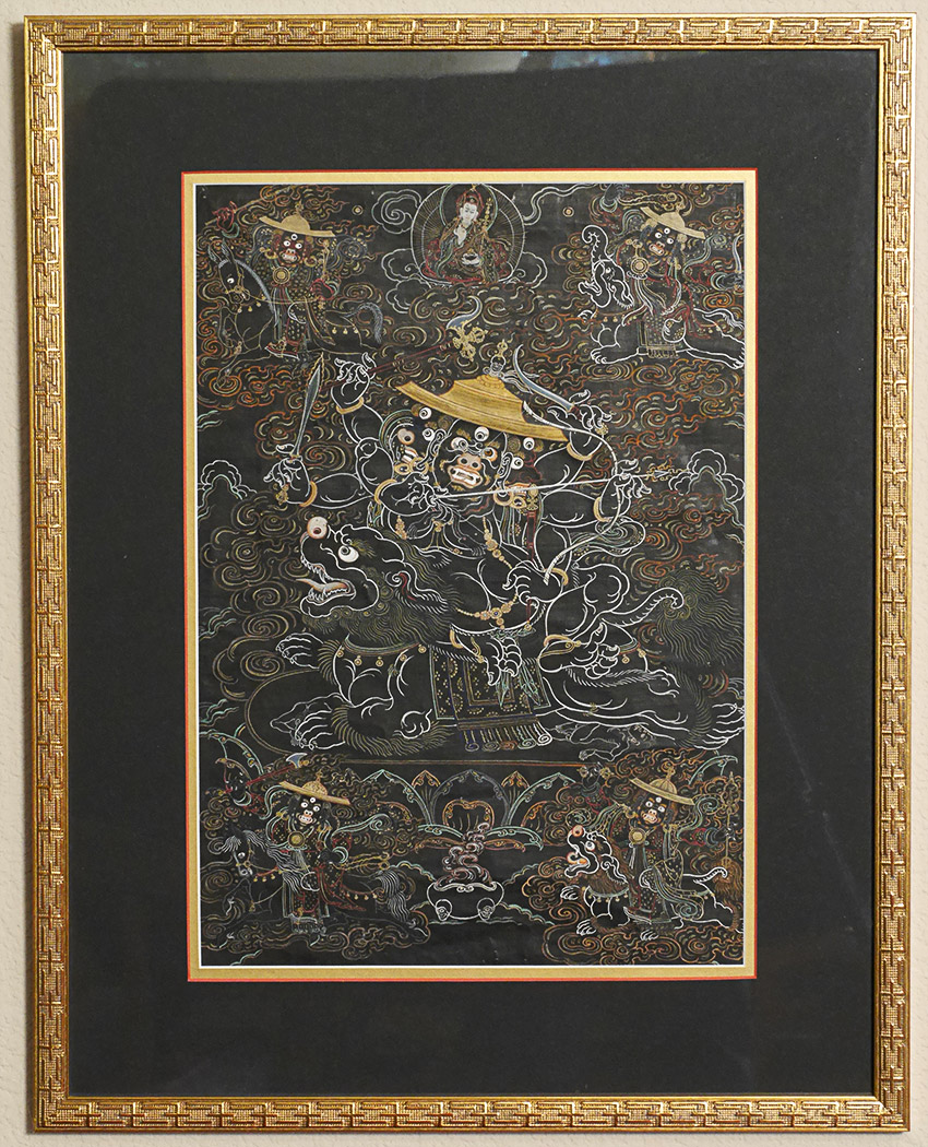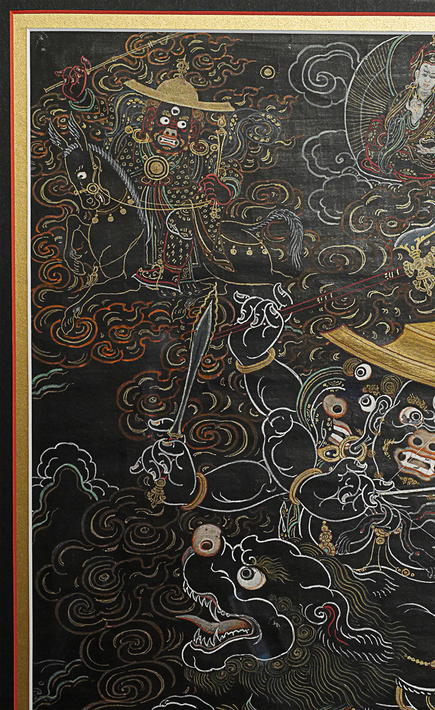 Antique Mongolian black ground Thangka. Beautiful and precise example in extremely clean condition. Examined before framing and does look to have age, though many of these sold as 19thC are really early (and even sometimes mid) 20th C. The ones in such clean condition typically spent their lives in large Gau boxes or behind glass. This one was on special thick black paper that was not made to roll up. The most important thing is that they were made for practice in the traditional way before exposure to the west, and not as a tourist item or decoration- with this piece there is no doubt it is a true tantric Thangka made for practice. Came from the collection of a well known dealer/appraiser in San Francisco who sometimes does work for US customs, and who has vetted a number of high end Asian antique shows for the Tibetan, Chinese, and Mongolian items for accuracy and authenticity. He purchased a large number of Mongolian items in the 1990's when Mongolia was first opening to the West. He claimed that he purchased this along with a group of fine Thangkas out of a small private Mongolian museum that was closing down. Inner dimensions: 12.5" x 18". Outer dimensions 20 3/8" x 26". This has been in my private collection for 15 years and is just being offered for sale for the first time. Expensively framed, with museum glass so that every detail shows clearly. This is as fine as they get.