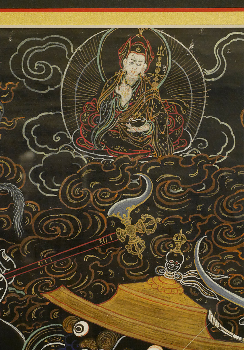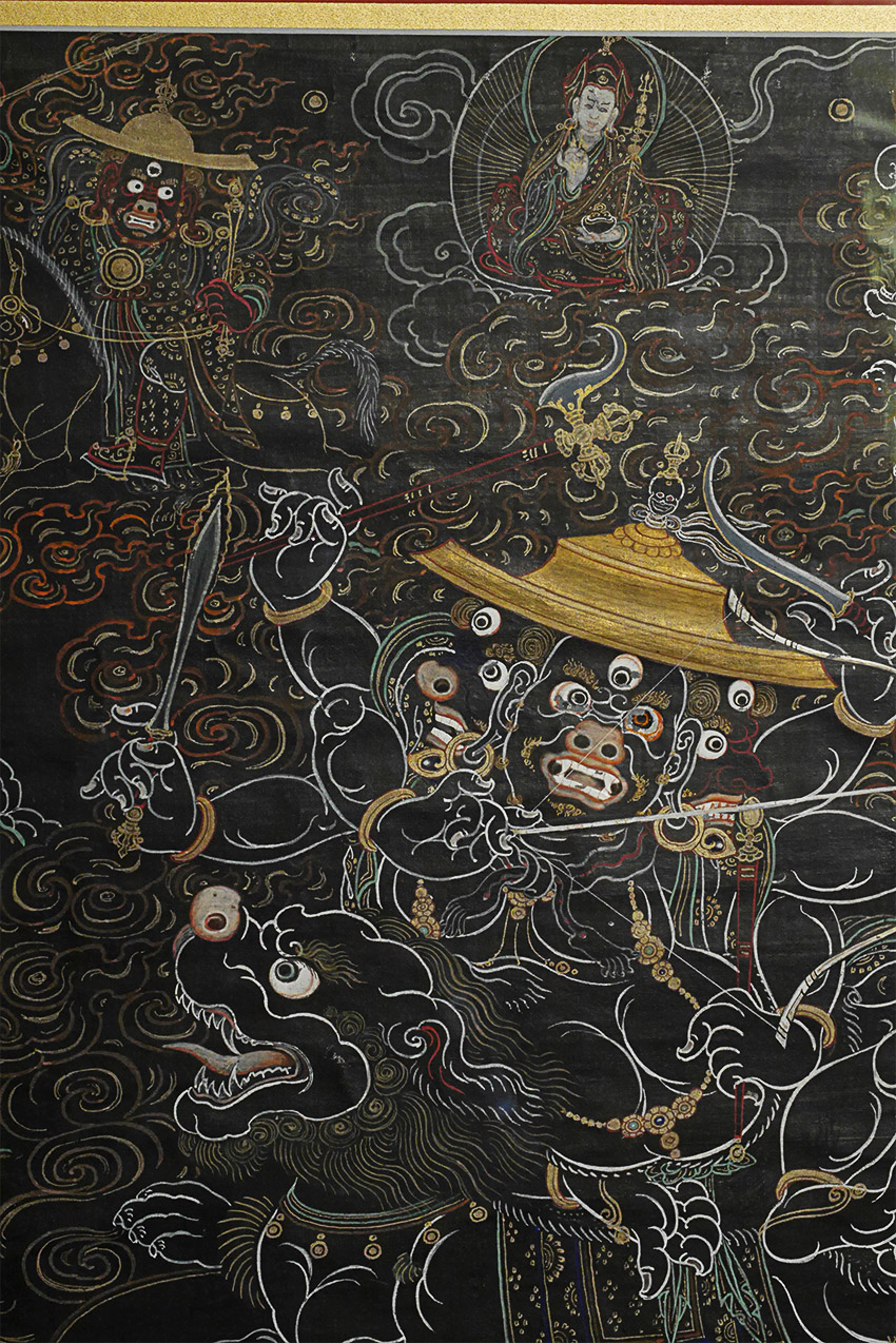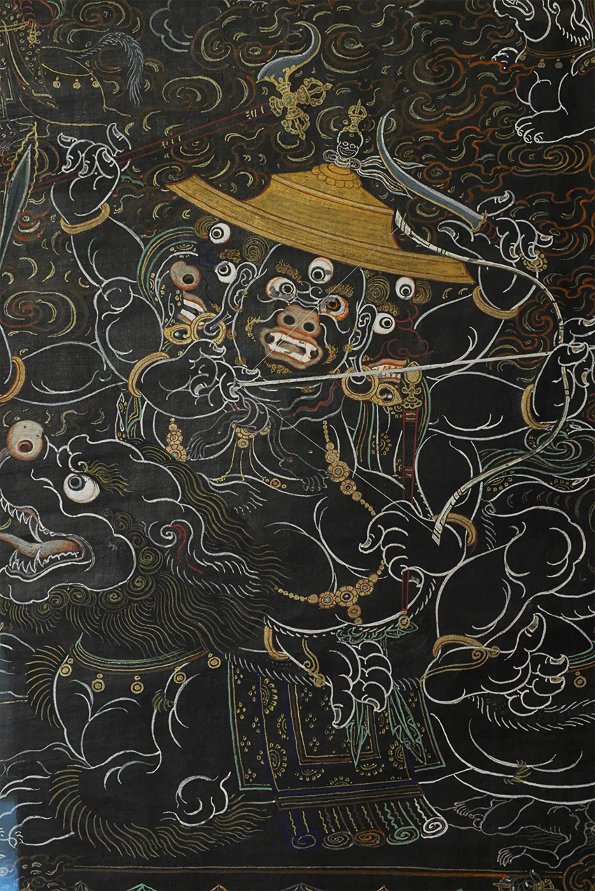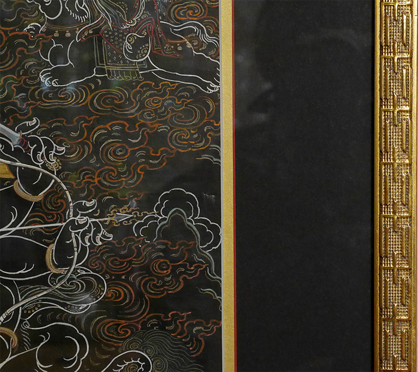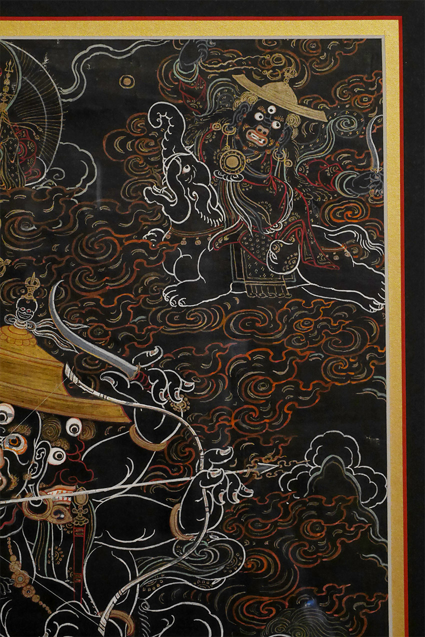 Antique Mongolian black ground Thangka. Beautiful and precise example in extremely clean condition. Examined before framing and does look to have age, though many of these sold as 19thC are really early (and even sometimes mid) 20th C. The ones in such clean condition typically spent their lives in large Gau boxes or behind glass. This one was on special thick black paper that was not made to roll up. The most important thing is that they were made for practice in the traditional way before exposure to the west, and not as a tourist item or decoration- with this piece there is no doubt it is a true tantric Thangka made for practice. Came from the collection of a well known dealer/appraiser in San Francisco who sometimes does work for US customs, and who has vetted a number of high end Asian antique shows for the Tibetan, Chinese, and Mongolian items for accuracy and authenticity. He purchased a large number of Mongolian items in the 1990's when Mongolia was first opening to the West. He claimed that he purchased this along with a group of fine Thangkas out of a small private Mongolian museum that was closing down. Inner dimensions: 12.5" x 18". Outer dimensions 20 3/8" x 26". This has been in my private collection for 15 years and is just being offered for sale for the first time. Expensively framed, with museum glass so that every detail shows clearly. This is as fine as they get.