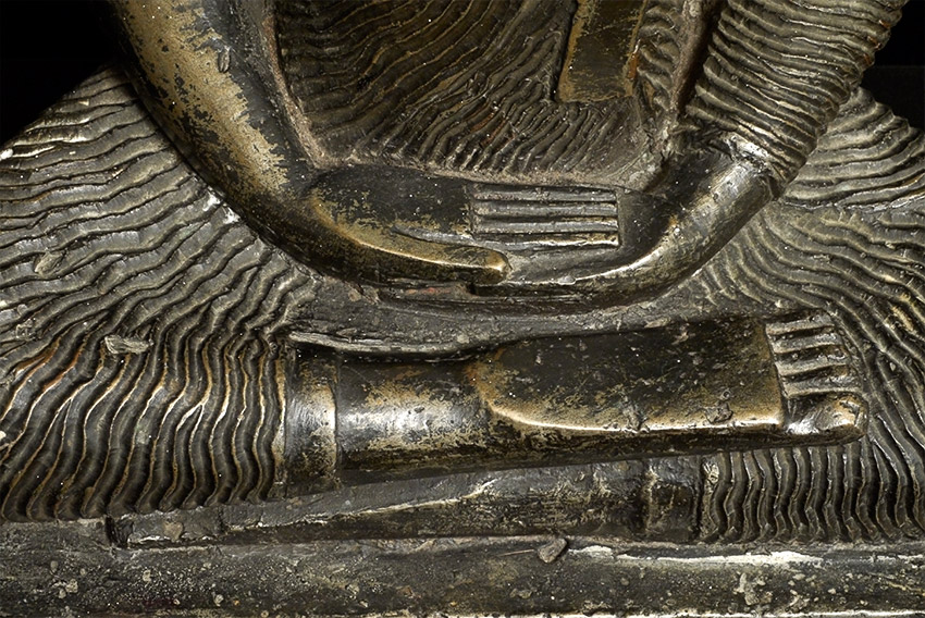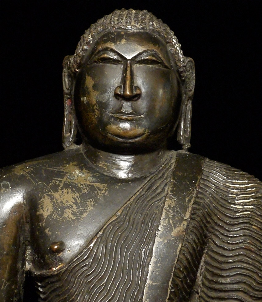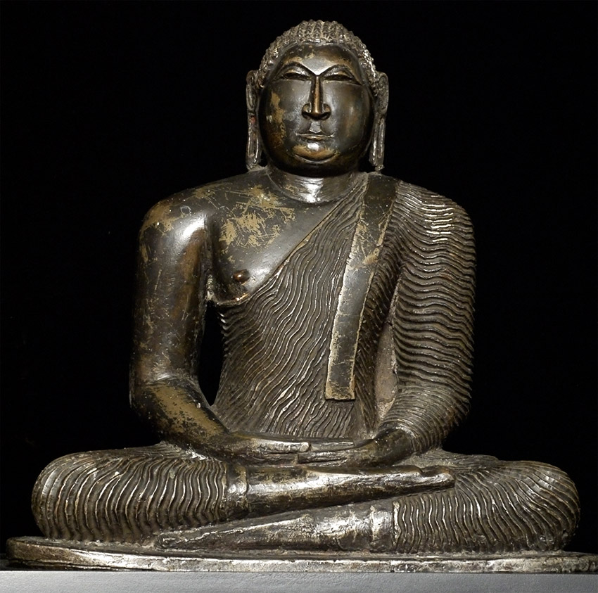Several stylistic elements—particularly the face, ears, and body proportions—clearly relate to Lankan Buddhas from 500–800 years earlier, giving this work a distinctive character unusual for the Kandy period. Unlike typical Kandy Buddhas with ears that flare outward, this example shows flatter, pulled-back ears in line with earlier Sinhala forms. Likewise, instead of the slender, androgynous bodies typical of later Kandy sculpture, this figure displays broad shoulders and thick, powerful arms, conveying a distinctly masculine presence reminiscent of early Sri Lankan bronzes. Should the dating prove significantly earlier than the 18th century, the value would increase substantially. A rare, monumental, and culturally important piece—striking in both form and physical presence.
