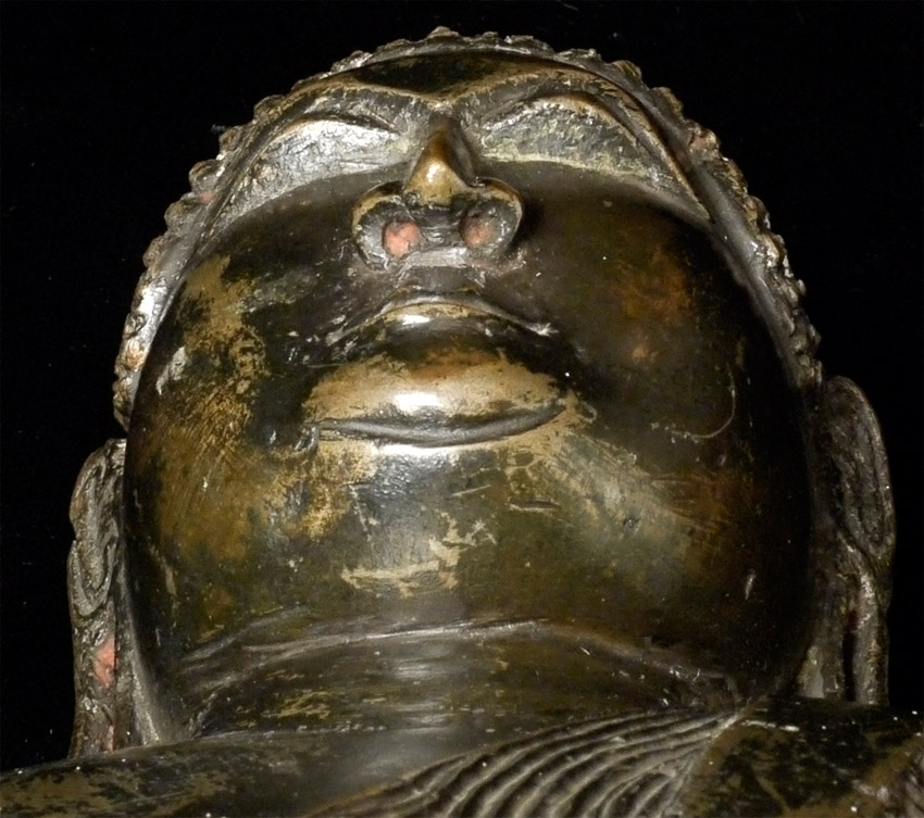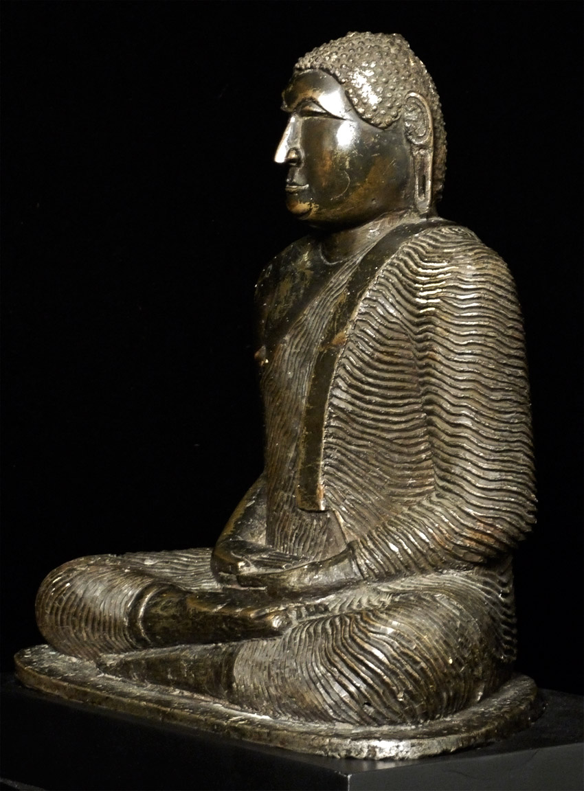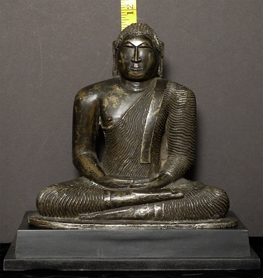 18th Century, Possibly Earlier — Very Large and Exceptionally Heavy Sri Lankan Kandy-Style Buddha. With echoes of much earlier Lankan styles, this is an unusually massive and powerful example of the Kandy tradition. The figure measures 9.75 inches tall without finial or base (which would bring it to 15+ inches), 11.5 inches on its custom stand, and nearly 10 inches wide at the knees. Because Sri Lankan Buddhas have been required to be solid-cast for nearly a millennium, this is close to the maximum size seated bronzes could realistically reach during the period—making its scale and weight especially impressive. It is incredibly heavy, far more so than the photographs suggest; at 61 years old, I cannot lift it alone.