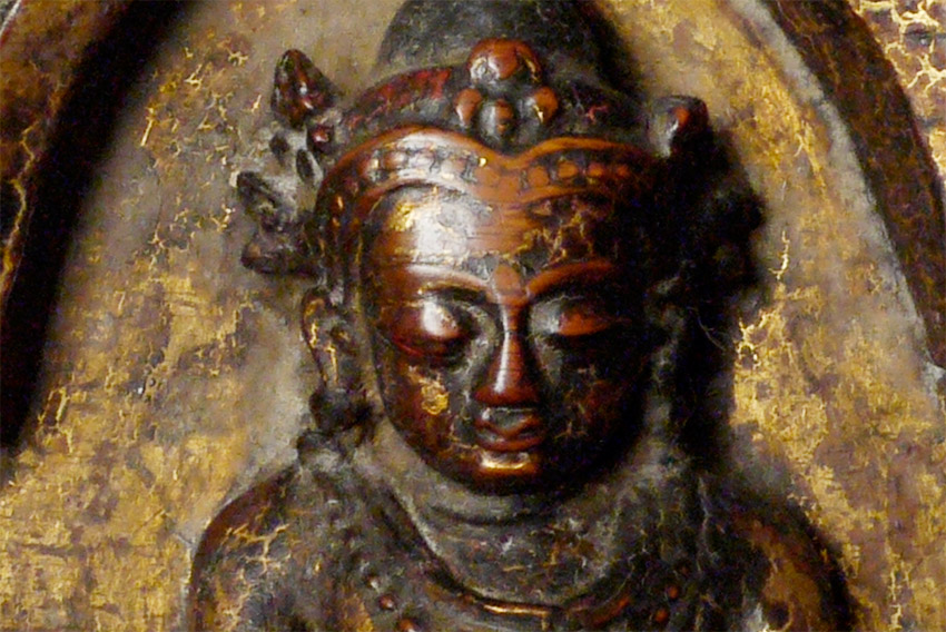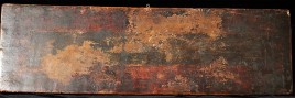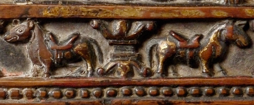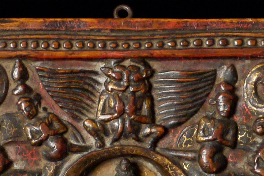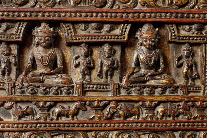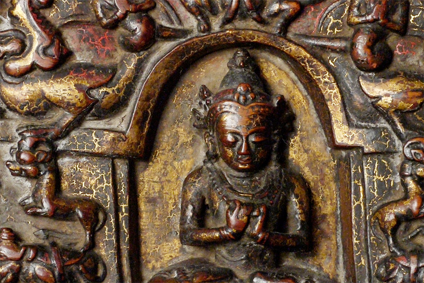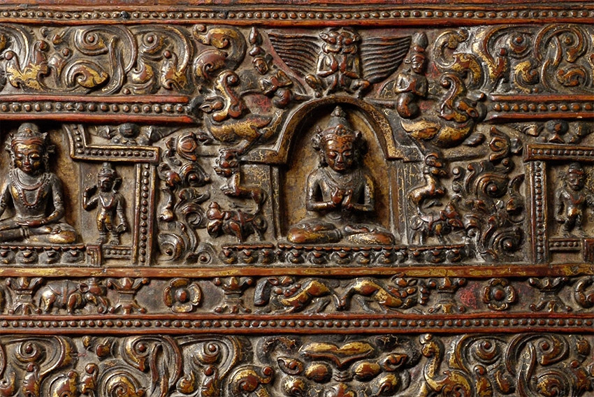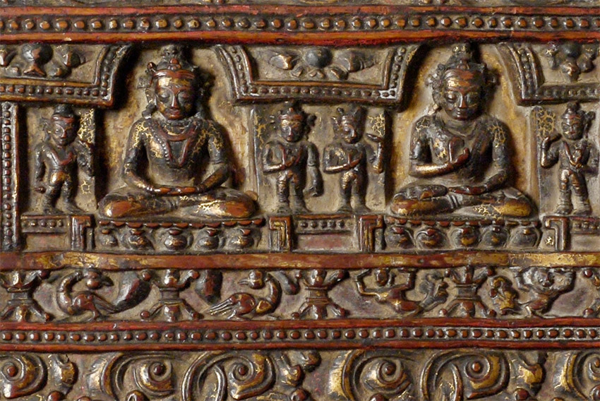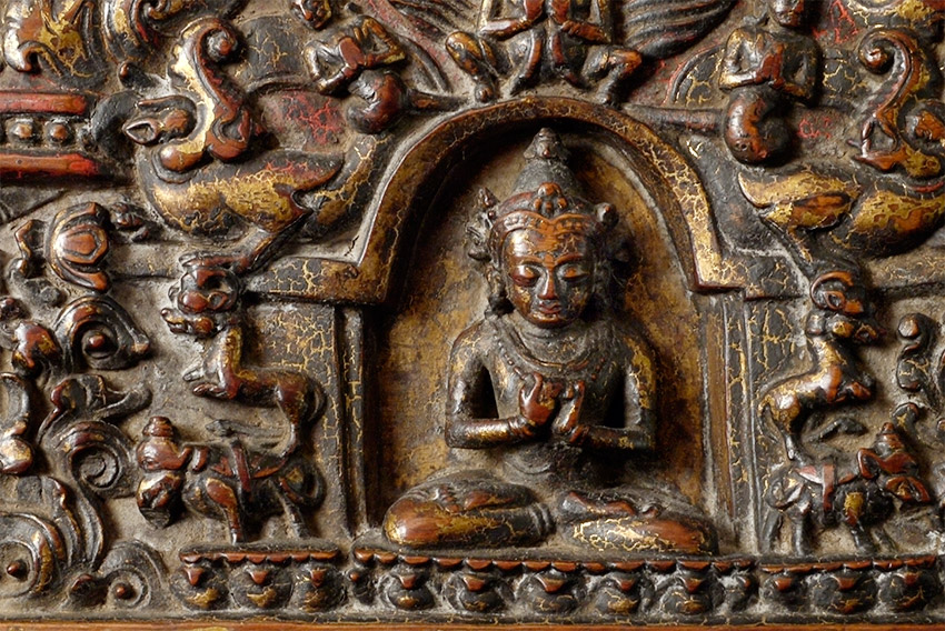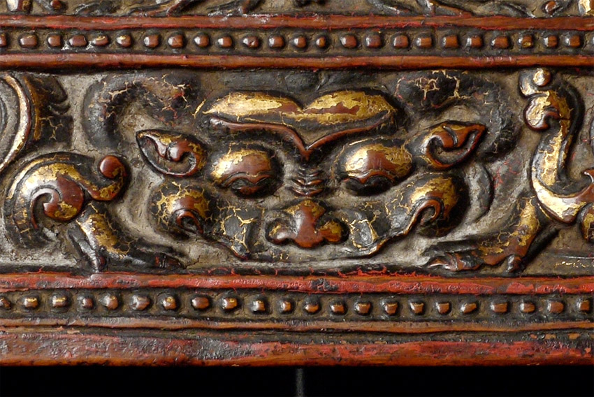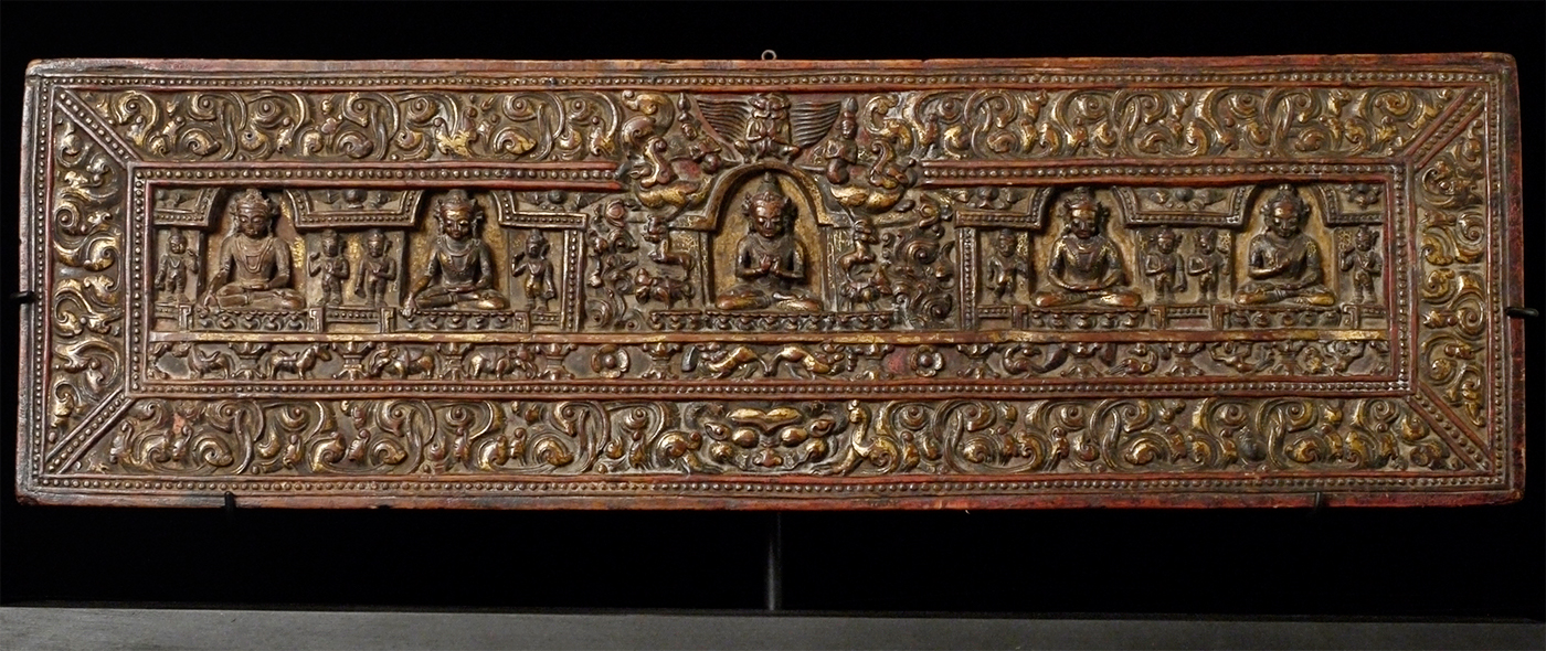 14/15thC Tibetan book cover with 5 Primordial Buddhas. The very finest of its type you will find anywhere, including museums or the best auction houses. This piece was carved and finished more than 500 years ago with great care and attention to detail down to the smallest detail. Note the photo of the 2 horses. They are so small they cannot even be seen in the photo of the entire cover, and they stand only 1/4 inch high. The faces of all 5 Buddhas are sensitively modeled, and each hold deep spiritual energy. The entire piece has worn as perfect as a piece of this type can wear (refer to the fantastic patina in photos). We acurately took photos to reflect its exact colors and details. One of my best items items on my entire website overall, in that it is a perfect example of its type. Expensive for a book cover, but for good reason. 27.25" x 8.25" x 1", not including the modern custom base which was just made to display this piece at its best. This piece has it all, and is so beautiful to look at.