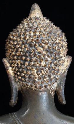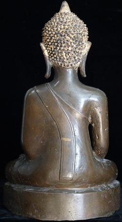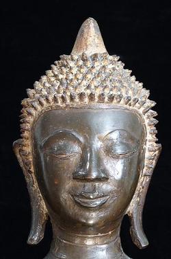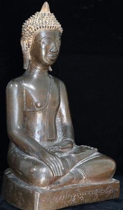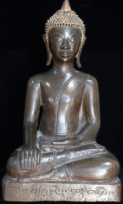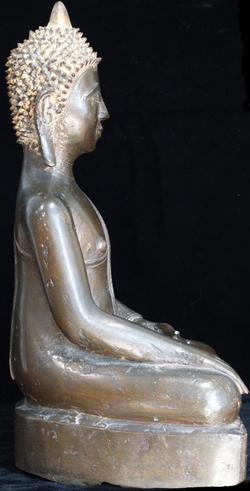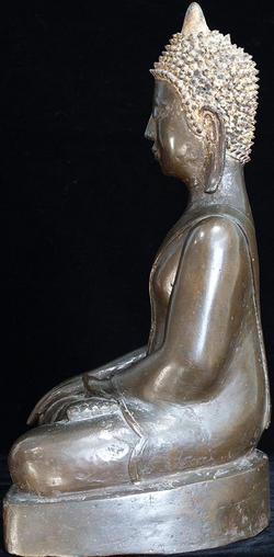 This is a fine 19thC Laos Bronze Buddha. It has all of the qualities you want to see in a high quality antique Buddha- a serene and beautiful face, a fine patina, good sculpting, well done casting and finishing, excellent condition, and good size. It sits a bit over 13 inches high by a bit over 7.5inches wide by 6 inches deep. The dimensions are a bit deceiving on this piece however due to the extremely short base, the very short finial, and the shape of the Buddha's body. The actual Buddha is closer to the size of most typical Thai and Laos Buddhas which sit 16-18 inches tall.