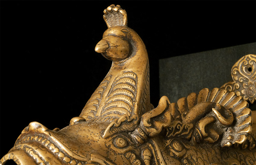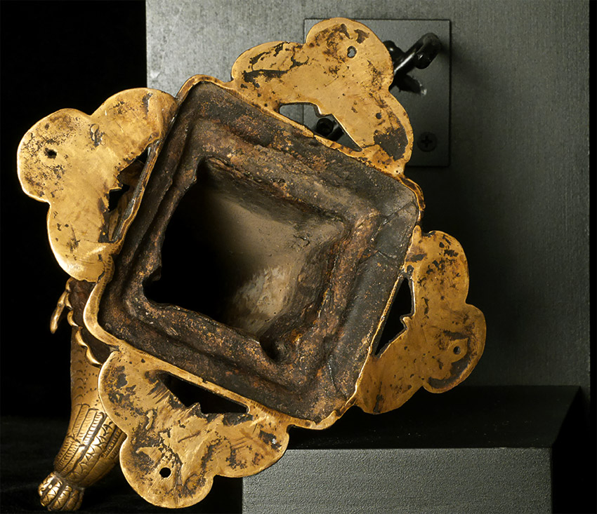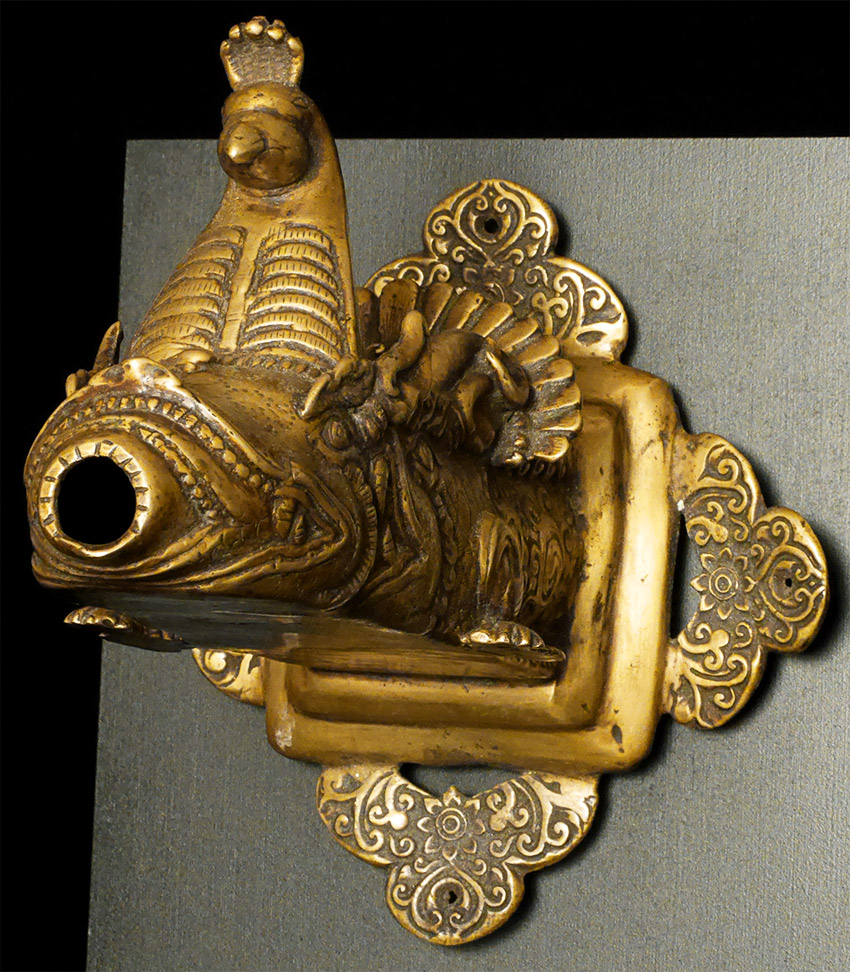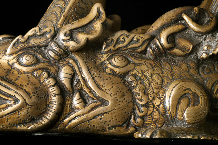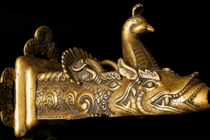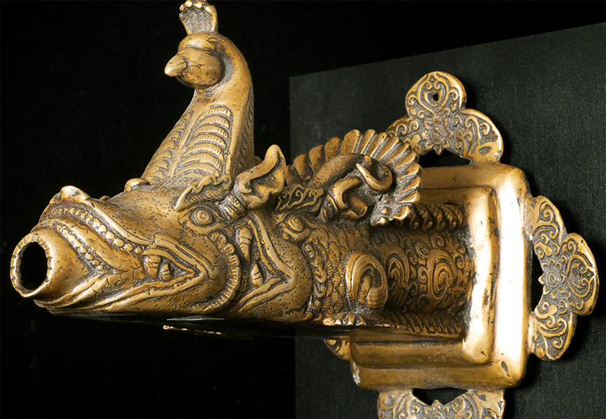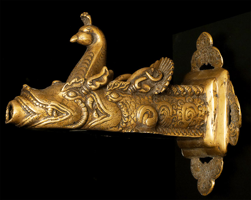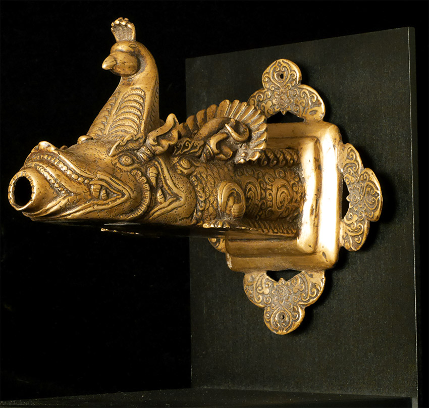 19thC or earlier Nepalese or Tibetan Bronze Water Spout. Elaborately cast. On carefully thought out custom base. Large at 9 inches long by 7 inches tall at the part that attached to the base. The stand is a little over 10 inches tall by a little over 9.5 inches long. Truly a one of a kind item. Great personality.