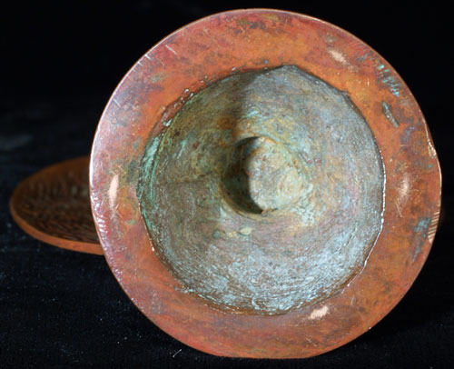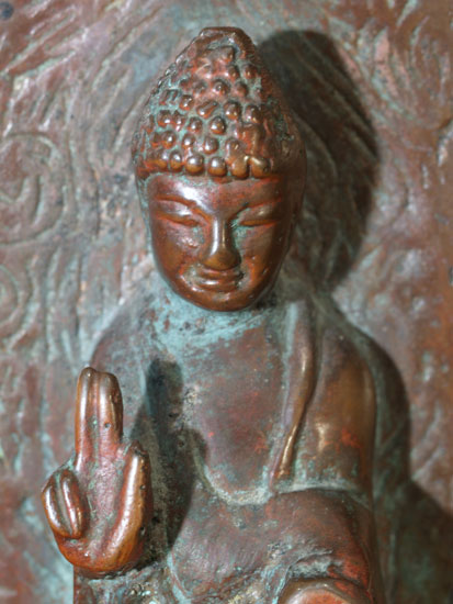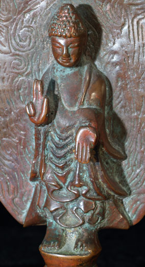 Korean Bronze Buddha- I’ve owned this one a long time- bought from a gentleman who lived in Korea 35 years ago, and who collected early Korean pottery while living there. He bought this one early Buddha from a reputable dealer. I was both deeply attracted to it as well as reluctant to purchase it due to the obvious powerful red/brown patina. Everything about it (from the wear pattern where a right handed person would have picked it up, to the type of finishing tools used, to how it would have been put down etc) was correct. Over the years I have examined a number of other Silla bronzes of this type, and the undersides and overall feel are consistent. I showed it to one expert Chinese dealer who believed it to be authentic- he believed that the red had leached out of the alloy over the last 1200 years. The overall impact of this piece is quite impressive. A very nice size at close to 7 inches tall