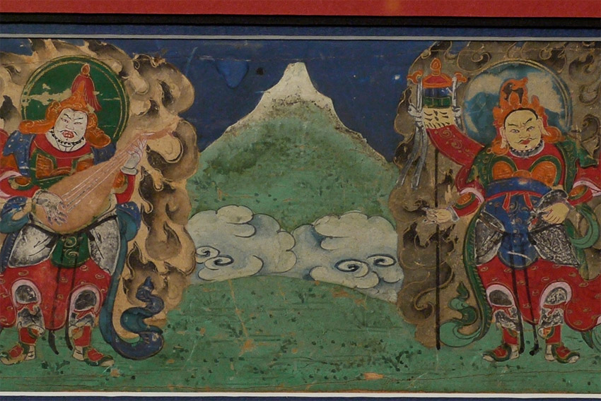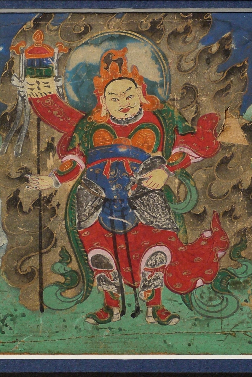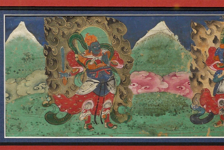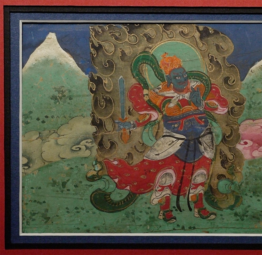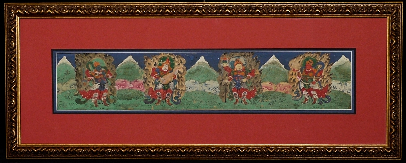 18/19c Tibetan painting from the inside of a Tibetan book cover. In unusually fine condition for a piece of this type. Depicts the four guardian kings or kings of the four directions. Image only 19.25 x 4 inches, outer frame 10.5 x 26 inches