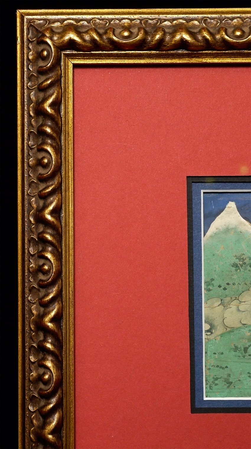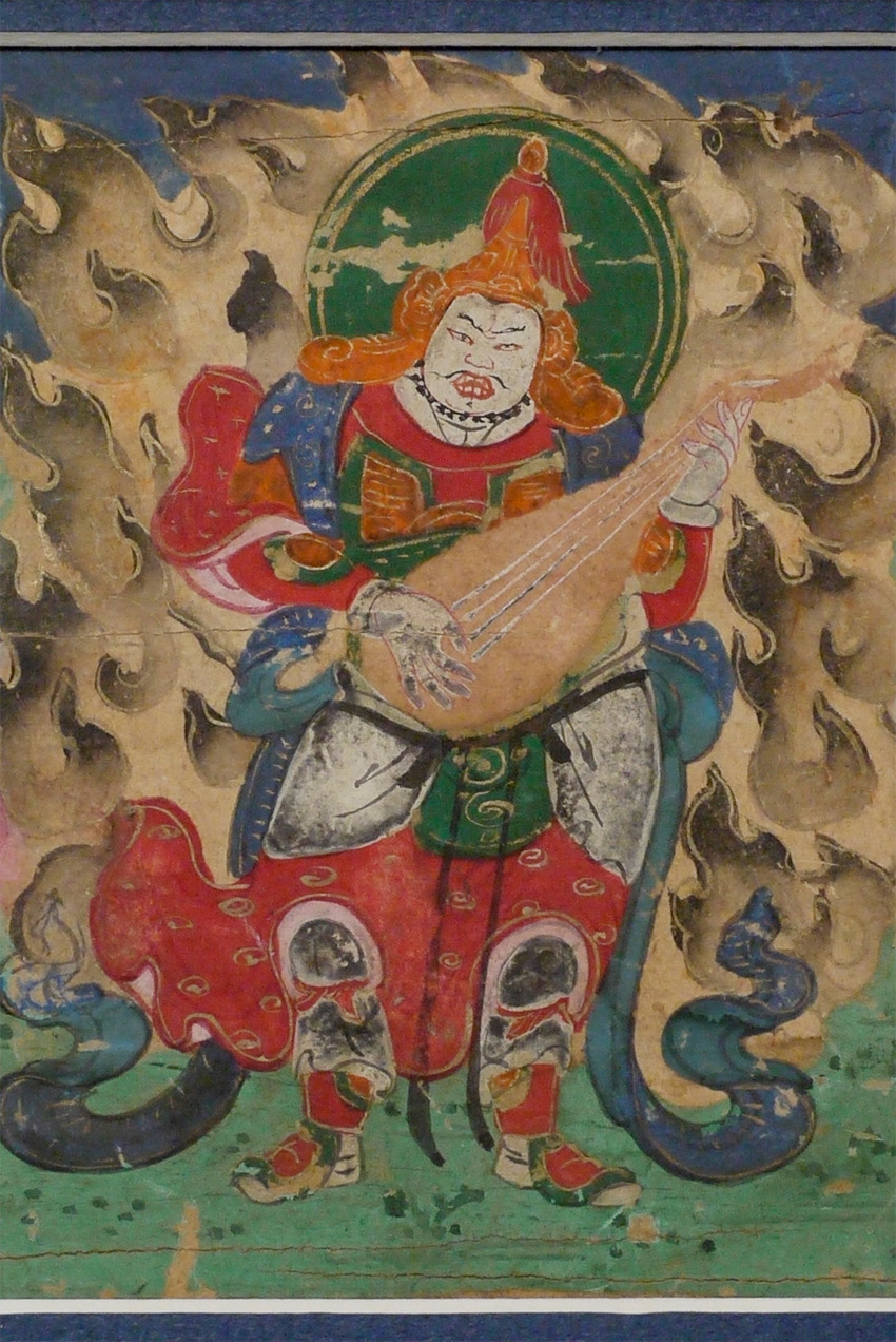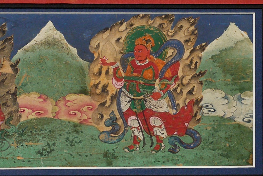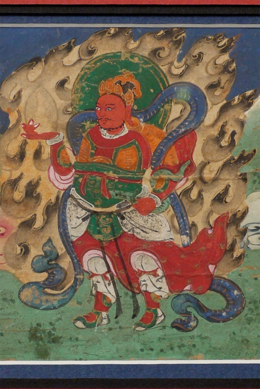 18/19c Tibetan painting from the inside of a Tibetan book cover. In unusually fine condition for a piece of this type. Depicts the four guardian kings or kings of the four directions. Image only 19.25 x 4 inches, outer frame 10.5 x 26 inches