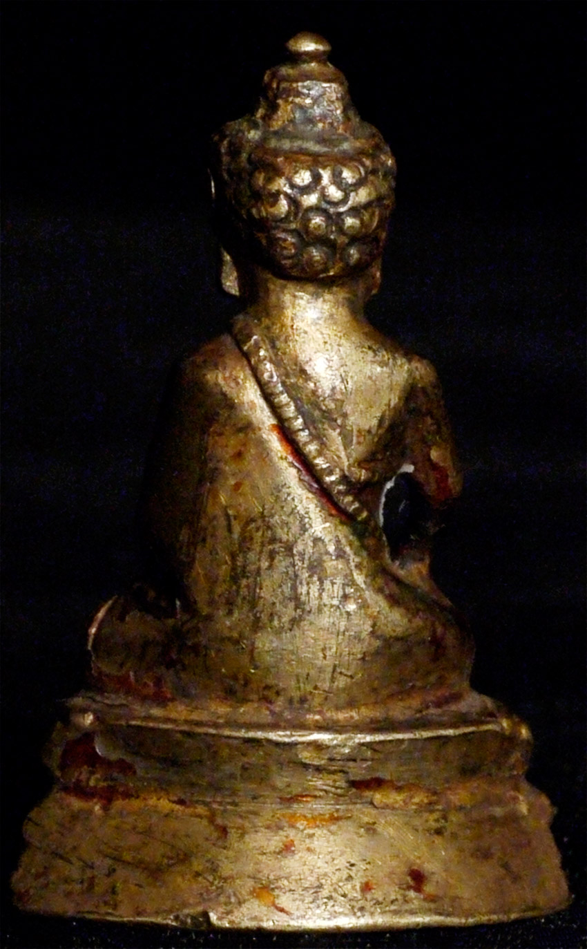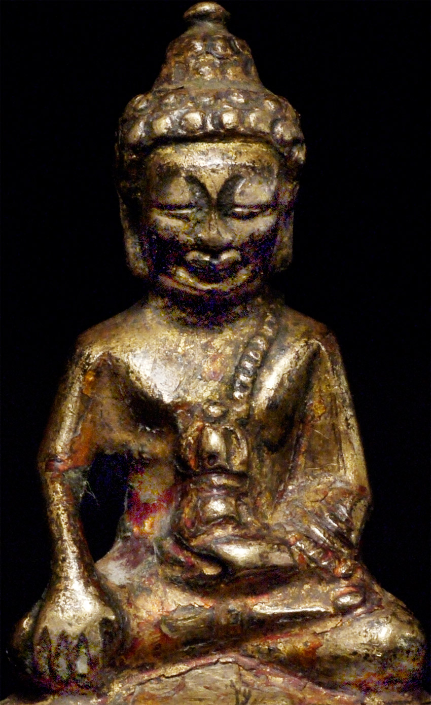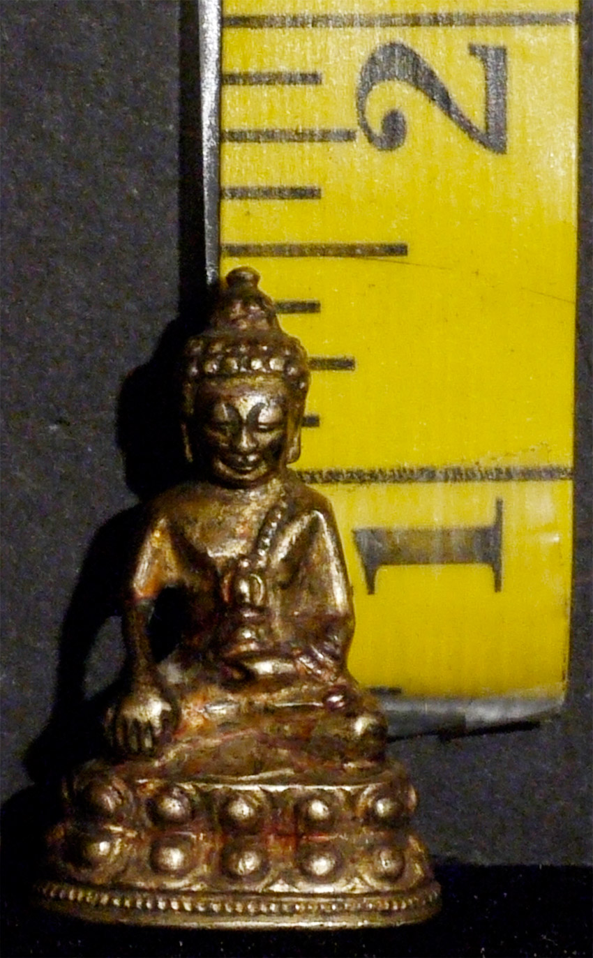 16-18thC Chinese Miniature Bronze Buddha. This is an authentic late Ming (possibly Early Ching) miniature Buddha- the vast majority that look like this are from Thailand, and are mid/late 20th C. Authentic antique Chinese ones are quite rare, and very few of those have the age of this one. They are the prototypes for the Pra-Ging from Thailand. Sits only 1 and 7/16ths inches tall and 2 3/4 inches with its custom base. This is one of the first Buddhas I collected- I received it as a gift over 35 years ago. It has not been visible on my website until this year. Very special face that radiates compassion, equanimity, and deep serenity. The original consecration is long lost. It likely, when originally made, made a soft rattling sound when shaken. A piece of this age, quality, condition, with this superb patina, and with this level of powerful spiritual energy is extremely rare to find. Note the traces of red lacquer and gilding -they appear to be of the type found on certain types of Ming era Buddhas. The price is set higher than on other Buddhas of this very small size on my website, but it is a very special little Buddha.