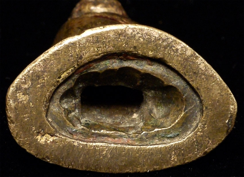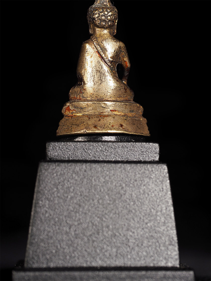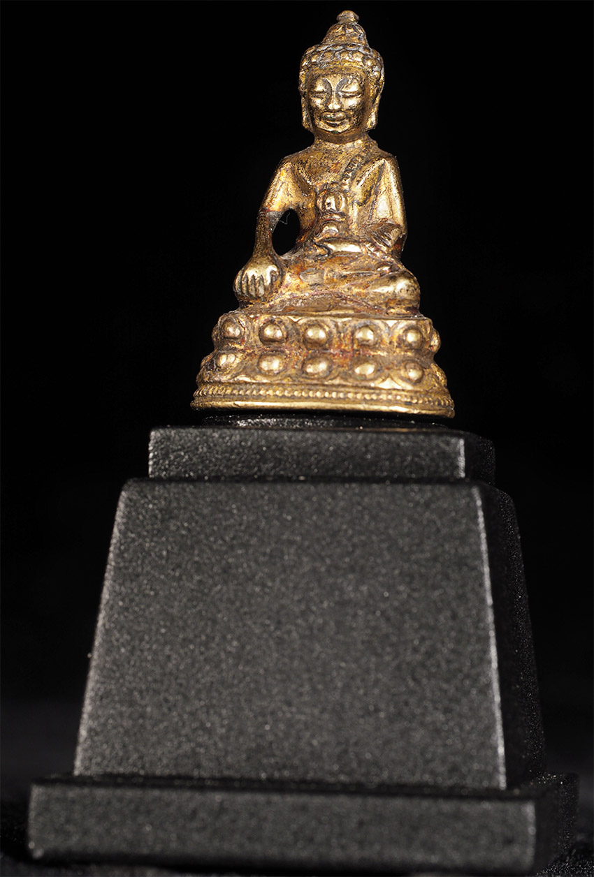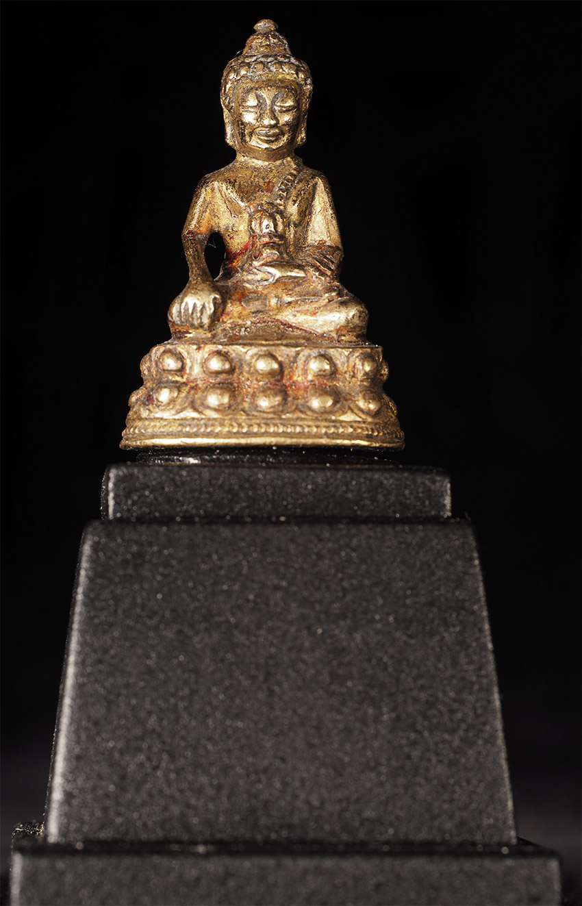 16-18thC Chinese Miniature Bronze Buddha. This is an authentic late Ming (possibly Early Ching) miniature Buddha- the vast majority that look like this are from Thailand, and are mid/late 20th C. Authentic antique Chinese ones are quite rare, and very few of those have the age of this one. They are the prototypes for the Pra-Ging from Thailand. Sits only 1 and 7/16ths inches tall and 2 3/4 inches with its custom base. This is one of the first Buddhas I collected- I received it as a gift over 35 years ago. It has not been visible on my website until this year. Very special face that radiates compassion, equanimity, and deep serenity. The original consecration is long lost. It likely, when originally made, made a soft rattling sound when shaken. A piece of this age, quality, condition, with this superb patina, and with this level of powerful spiritual energy is extremely rare to find. Note the traces of red lacquer and gilding -they appear to be of the type found on certain types of Ming era Buddhas. The price is set higher than on other Buddhas of this very small size on my website, but it is a very special little Buddha.