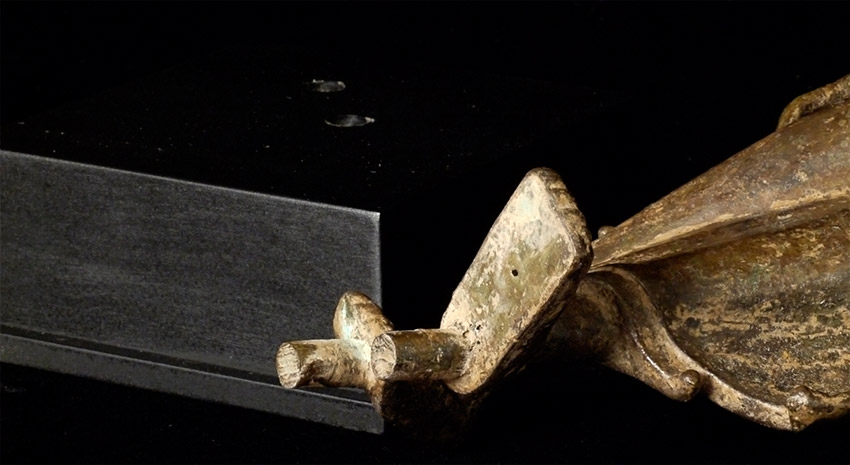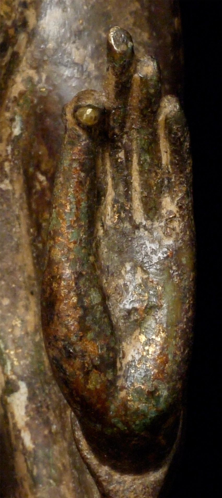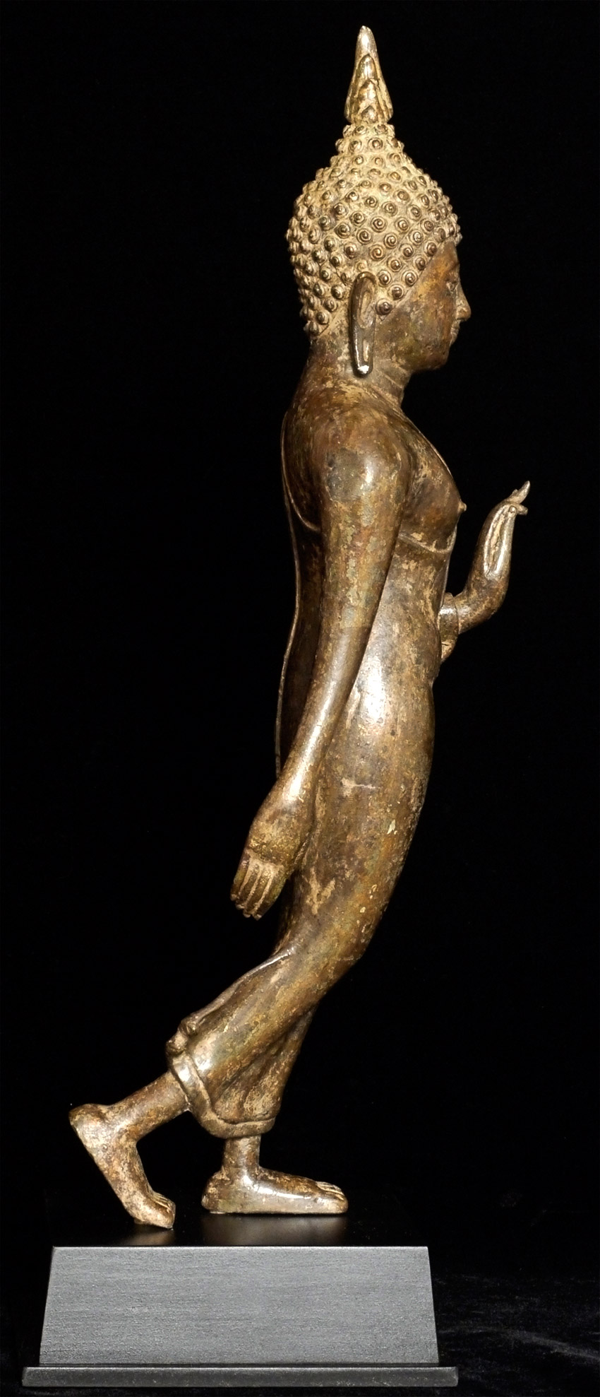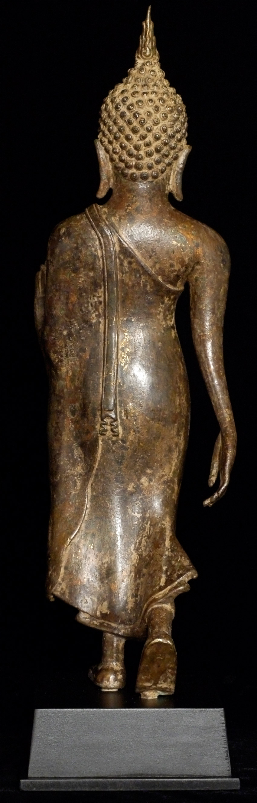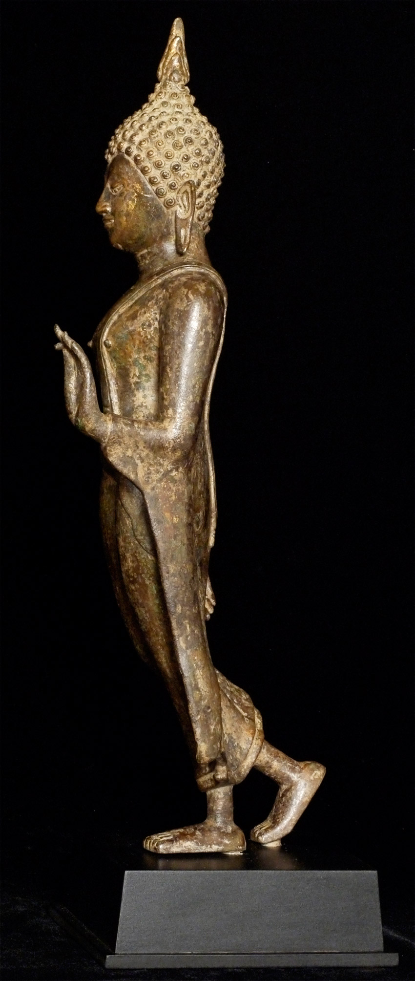 18/19thC Walking Thai Buddha. Probably Northern Thai, and not one of the late 19thC examples made in large numbers under Rama V(the "King and I" King). The style is different and the quality suggests that it is probably early than those examples (those usually have the feet connected with a bronze piece, are thinner in form, and attempt to emulate the 14thC tprotoypes more closely). Stands 15 inches (bronze only not including post sticking into base) and almost 17 inches including the base.
