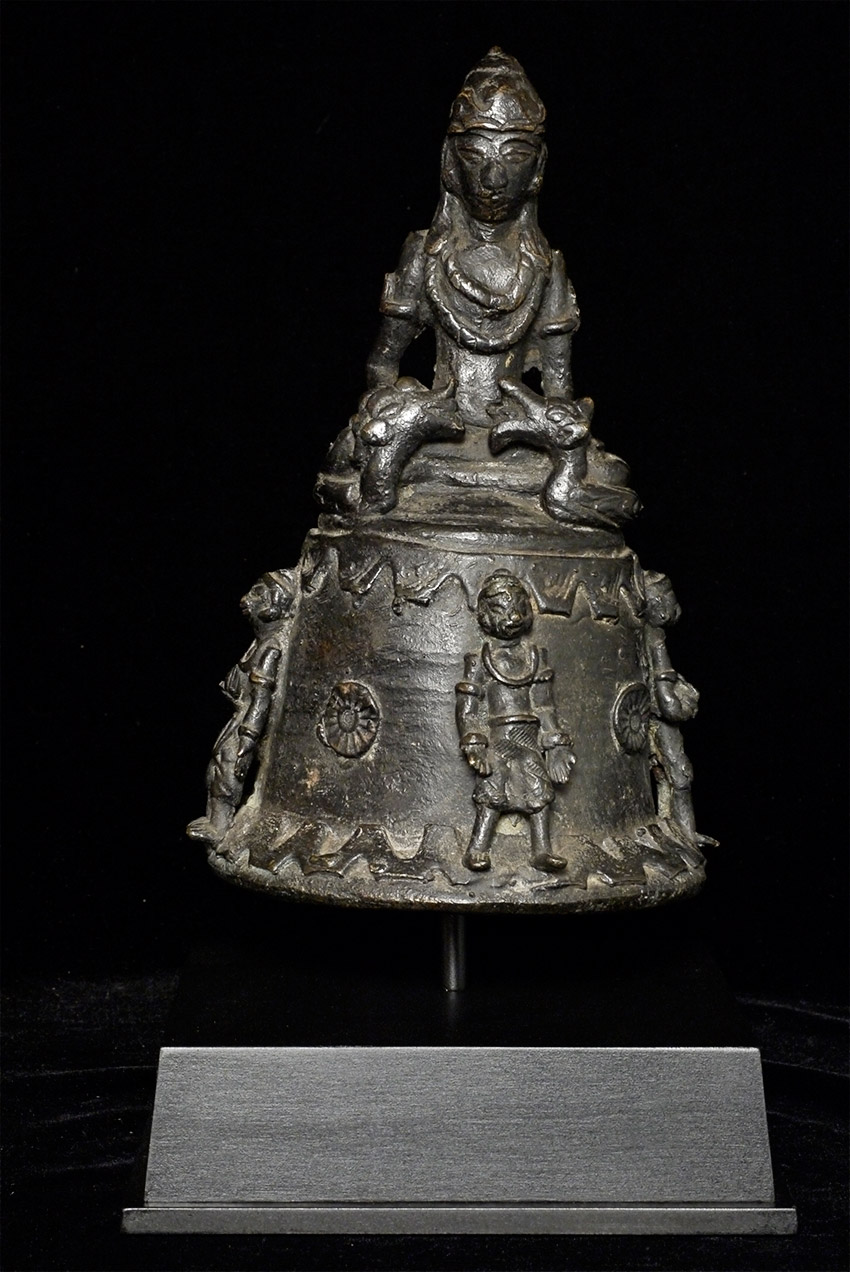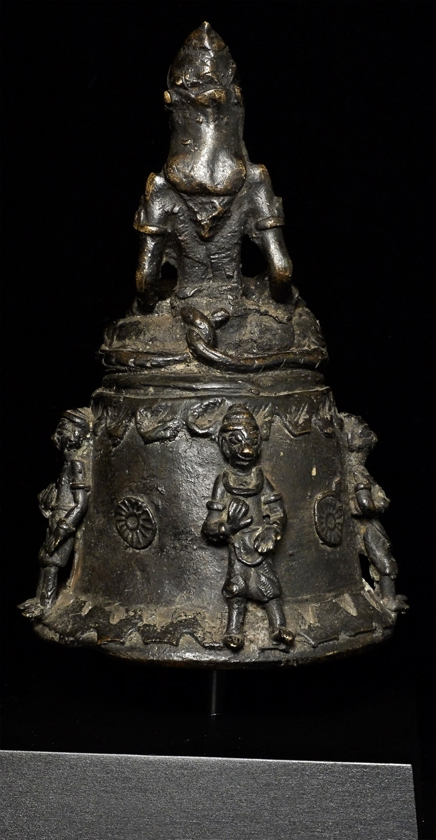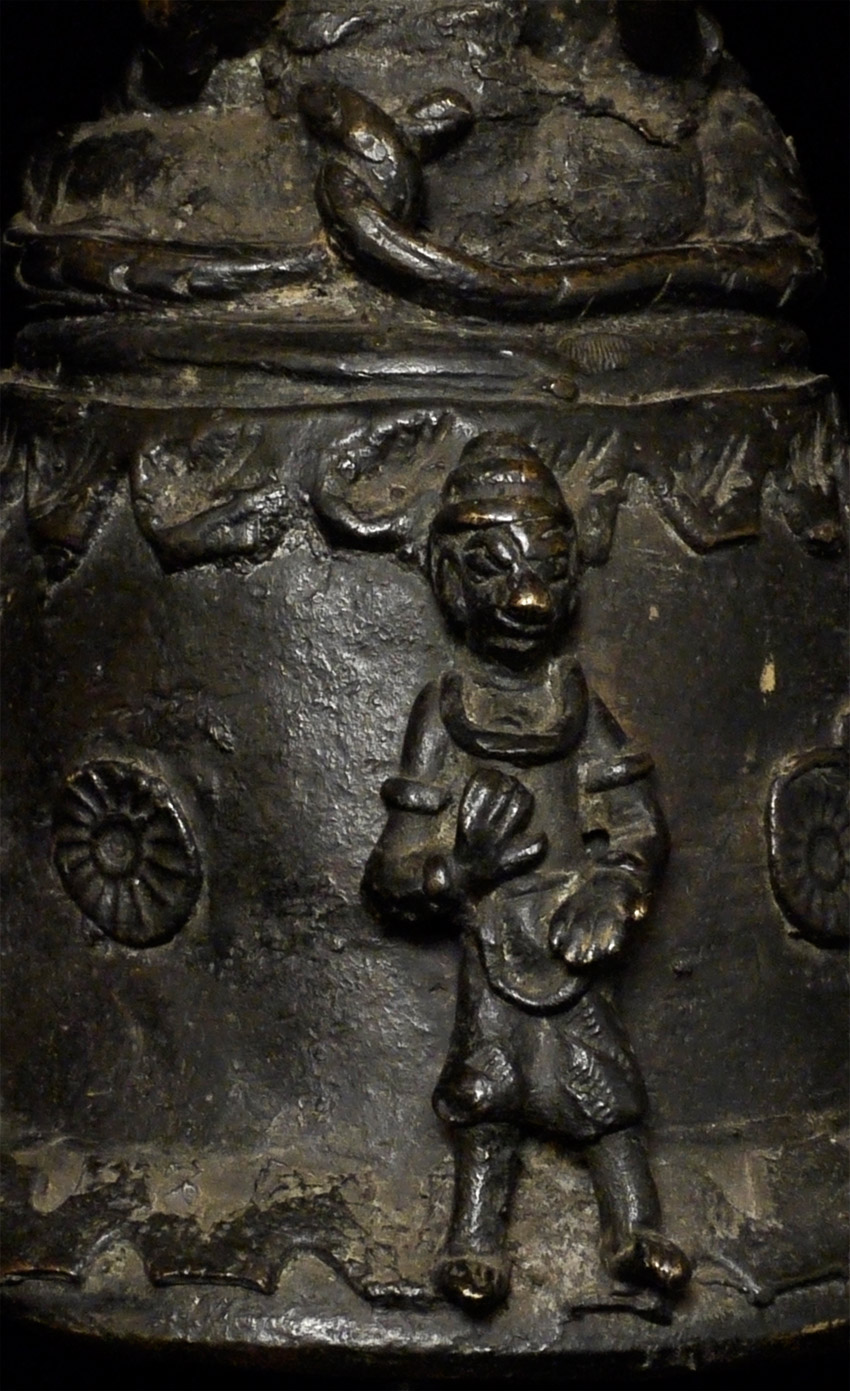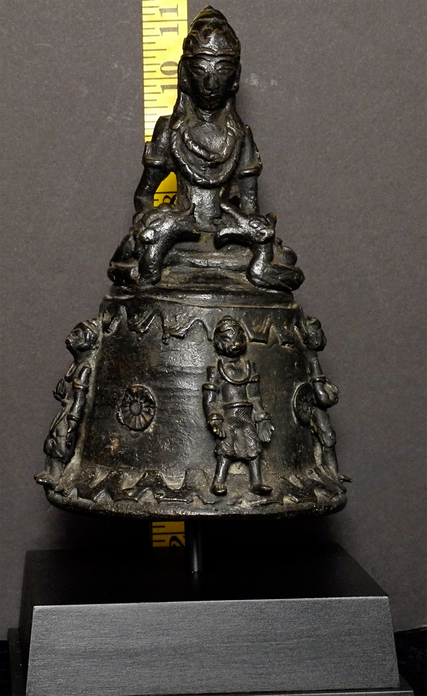 Rare 17/18thC Javanese Bell in a delightful folk style. No clapper inside, but has a nice tone when struck. Great old patina. Great folk art! Original ringer missing, though loop inside remains. Multiple figures on the bell (and 2 dragons with entwined tails and with heads in the central figure's lap) all look to be wax cast. This piece took significant time, care, and talent to make. , Large at 8 inches tall, and quite heavy, 11 inches tall on custom stand.
