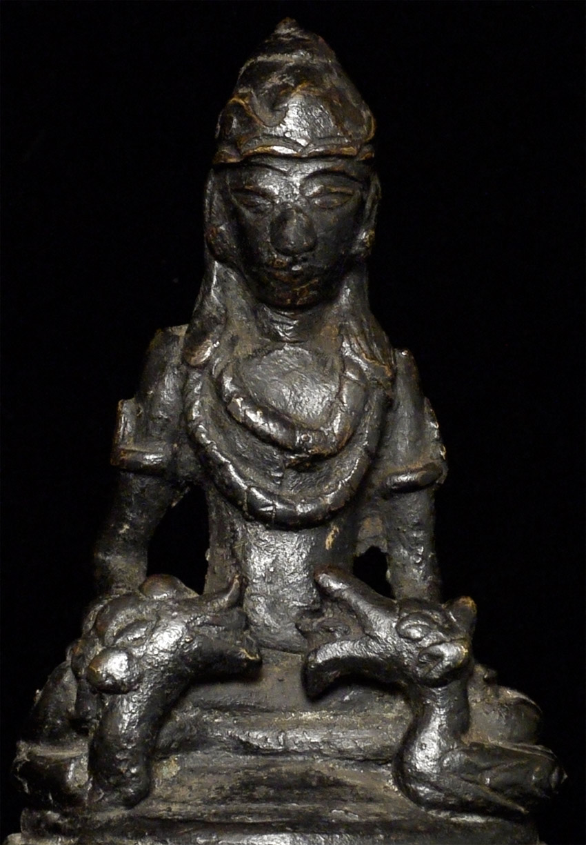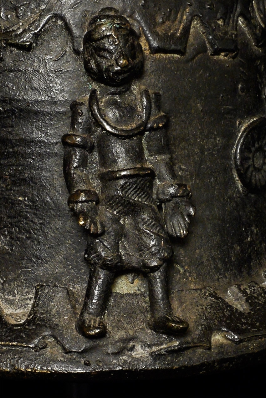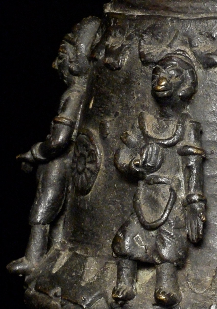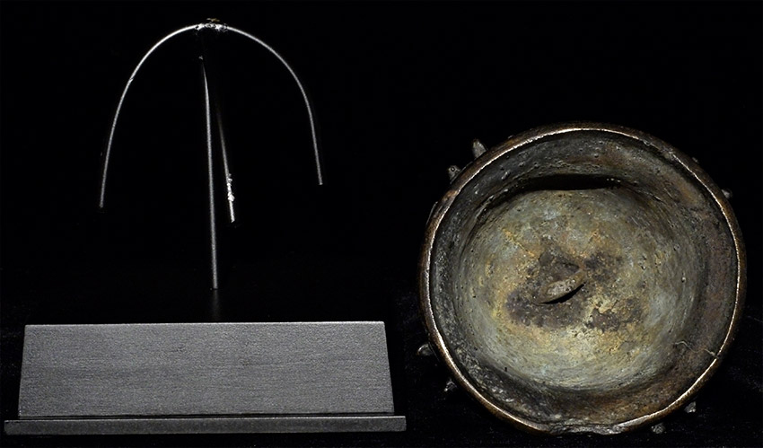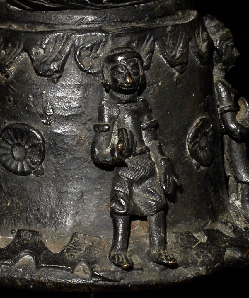 Rare 17/18thC Javanese Bell in a delightful folk style. No clapper inside, but has a nice tone when struck. Great old patina. Great folk art! Original ringer missing, though loop inside remains. Multiple figures on the bell (and 2 dragons with entwined tails and with heads in the central figure's lap) all look to be wax cast. This piece took significant time, care, and talent to make. , Large at 8 inches tall, and quite heavy, 11 inches tall on custom stand.