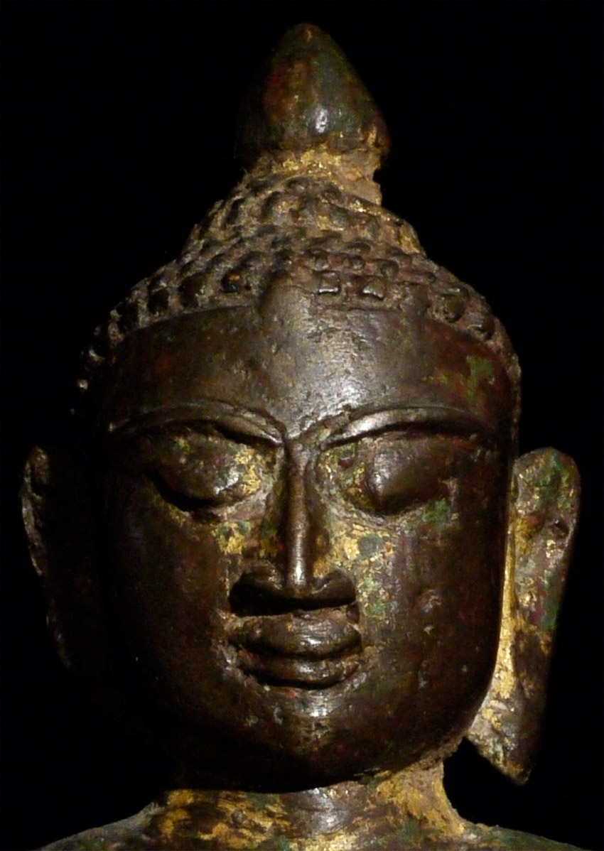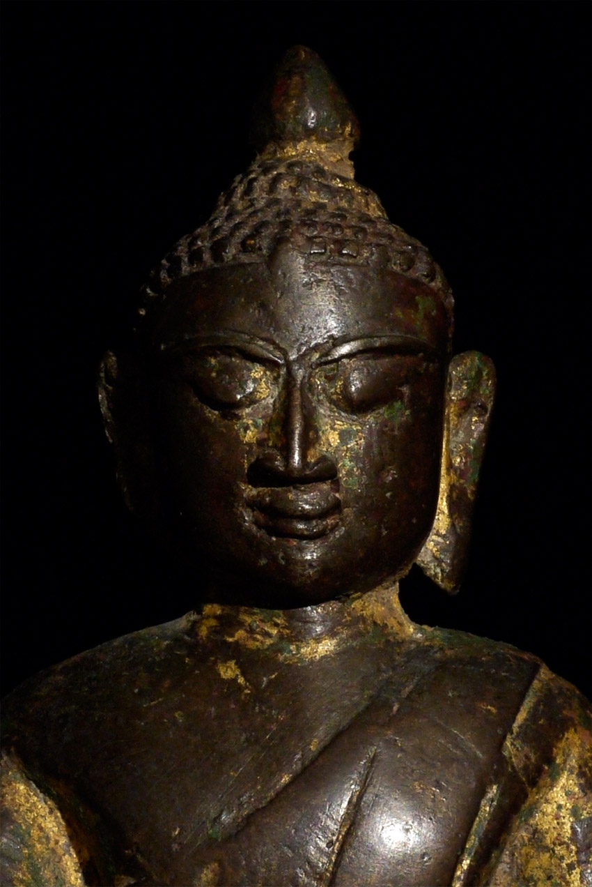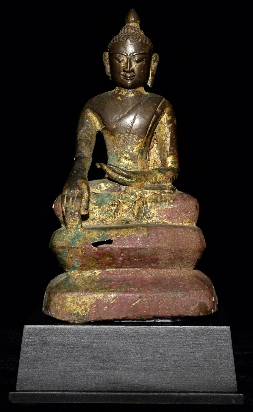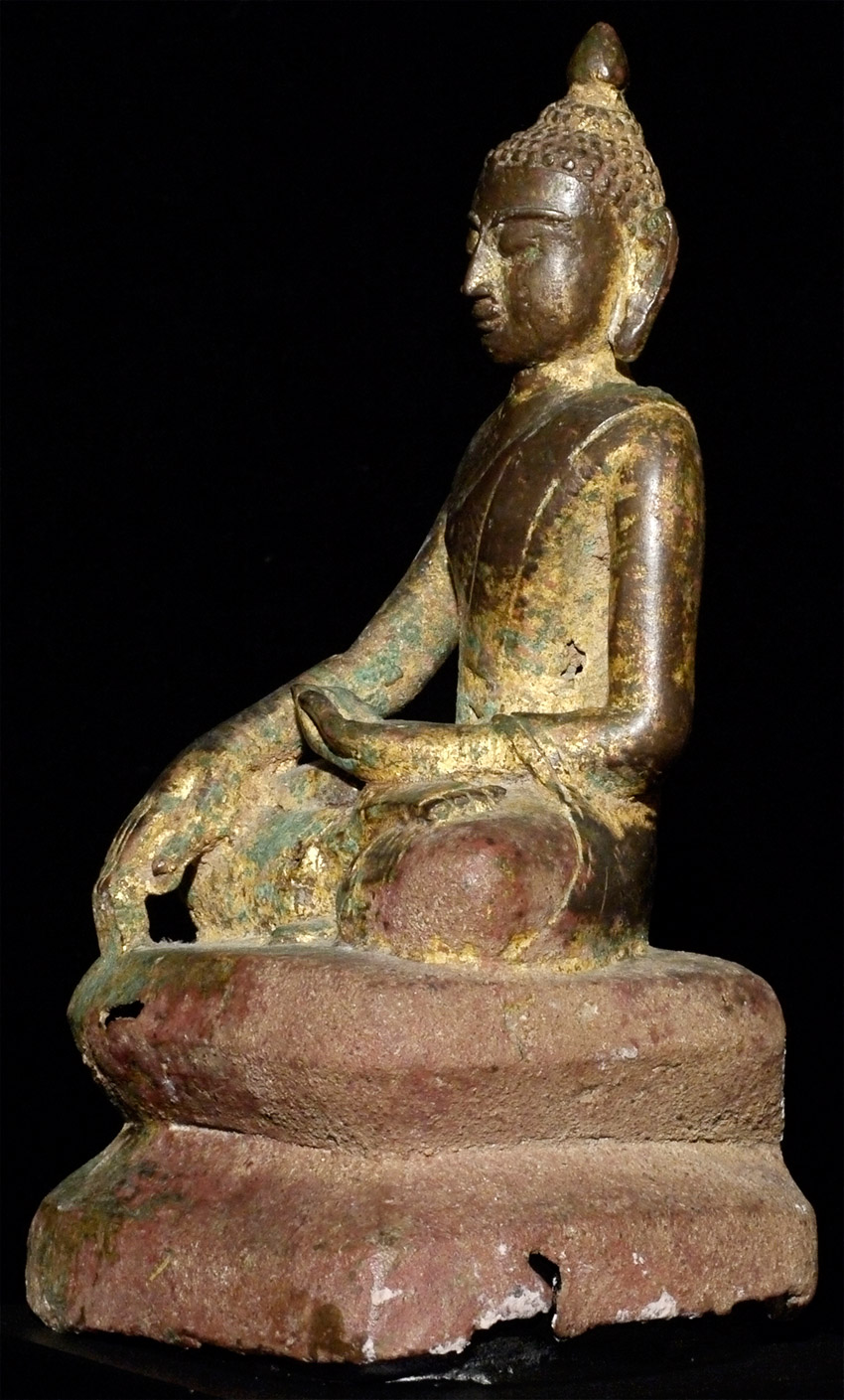 14/15thC Late Pagan/ Toungoo bronze Buddha. Missing one earlobe. This is one of the many rare and interesting Burmese Buddha variations found in Burmese Buddhist art. The interplay of the variety of ethnic groups and kingdoms over the centuries produced literally dozens of sub-types- many of which are rarely referenced in books. This one- with the distinctive pinched Pagan face, though softened by the rounder face found in the influence of the(14th/15thC) Ava period, and the simple square base that is typically found on early Shan and mid-period Mon pieces. Sits 7 and 1/8 inches tall, and 9 inches on the custom base (quite large for this type). Sometimes these different types were being made simultaneously in different parts of what is now modern Burma, separated by a mountain range or other natural or political barrier. Wonderful that he still retains much of his original gilding. A real collector's piece. Start Price lowered by $1000
