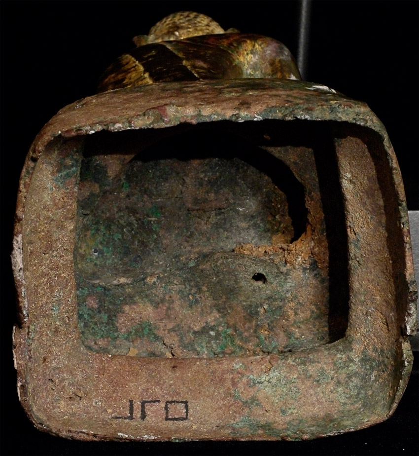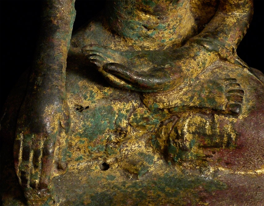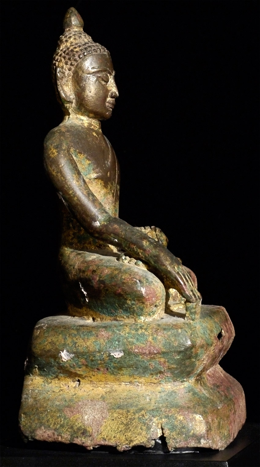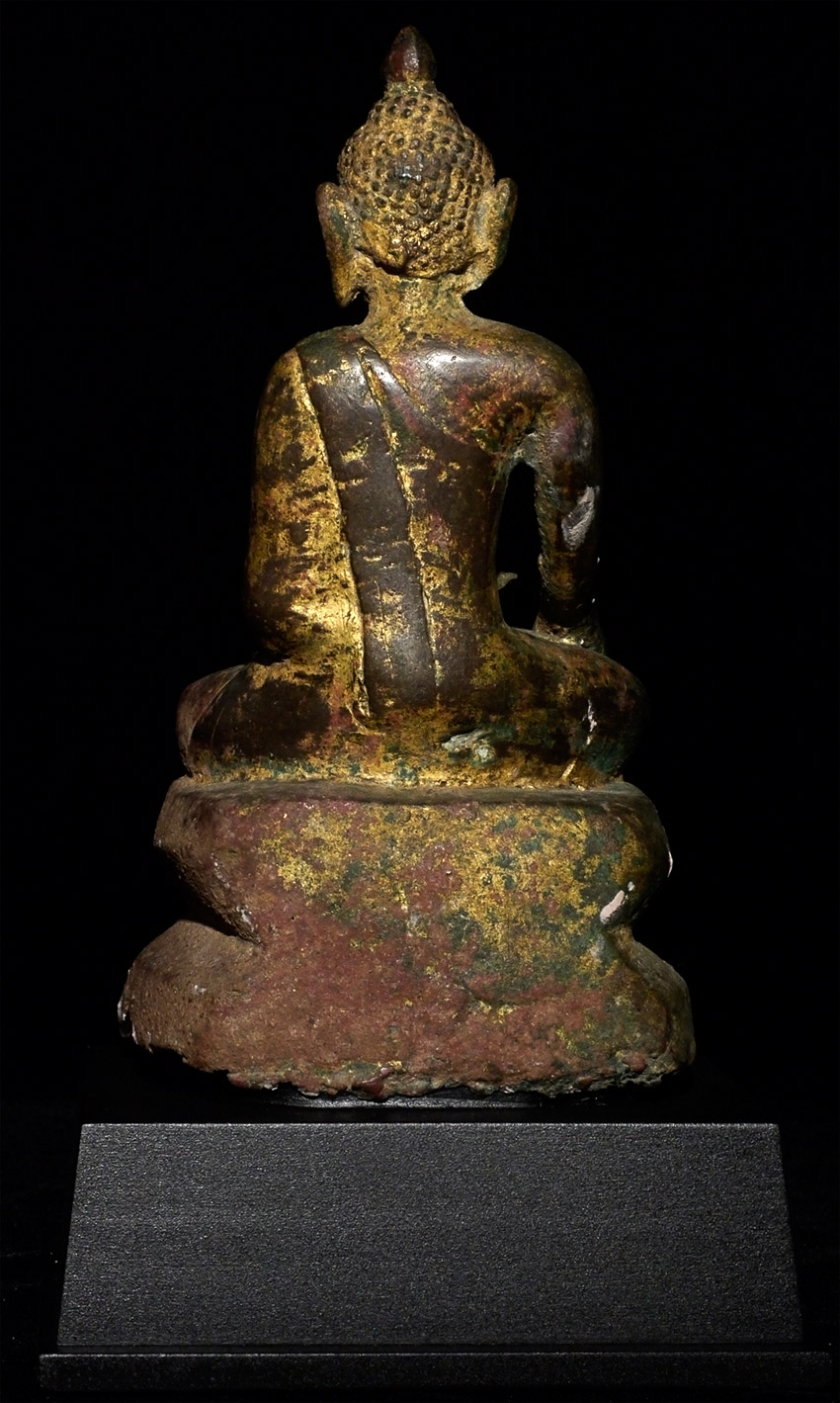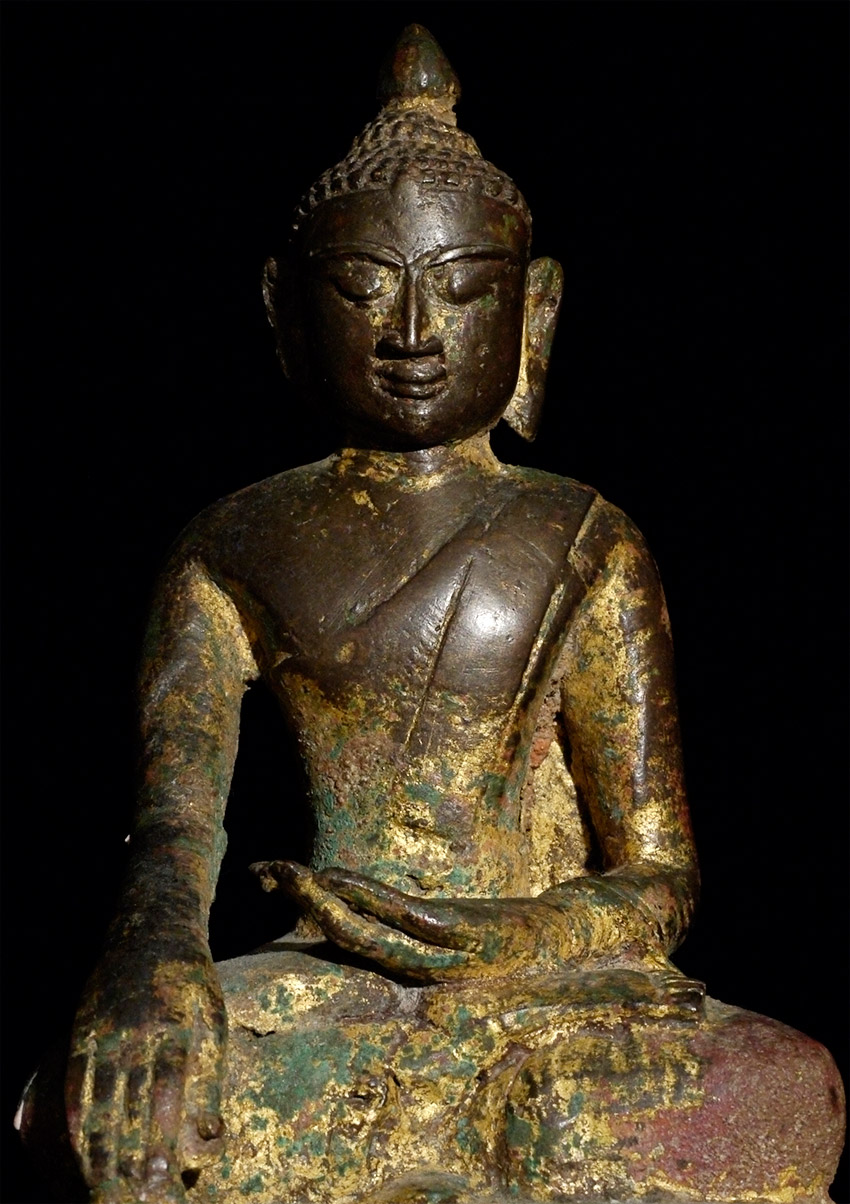 14/15thC Late Pagan/ Toungoo bronze Buddha. Missing one earlobe. This is one of the many rare and interesting Burmese Buddha variations found in Burmese Buddhist art. The interplay of the variety of ethnic groups and kingdoms over the centuries produced literally dozens of sub-types- many of which are rarely referenced in books. This one- with the distinctive pinched Pagan face, though softened by the rounder face found in the influence of the(14th/15thC) Ava period, and the simple square base that is typically found on early Shan and mid-period Mon pieces. Sits 7 and 1/8 inches tall, and 9 inches on the custom base (quite large for this type). Sometimes these different types were being made simultaneously in different parts of what is now modern Burma, separated by a mountain range or other natural or political barrier. Wonderful that he still retains much of his original gilding. A real collector's piece. Start Price lowered by $1000