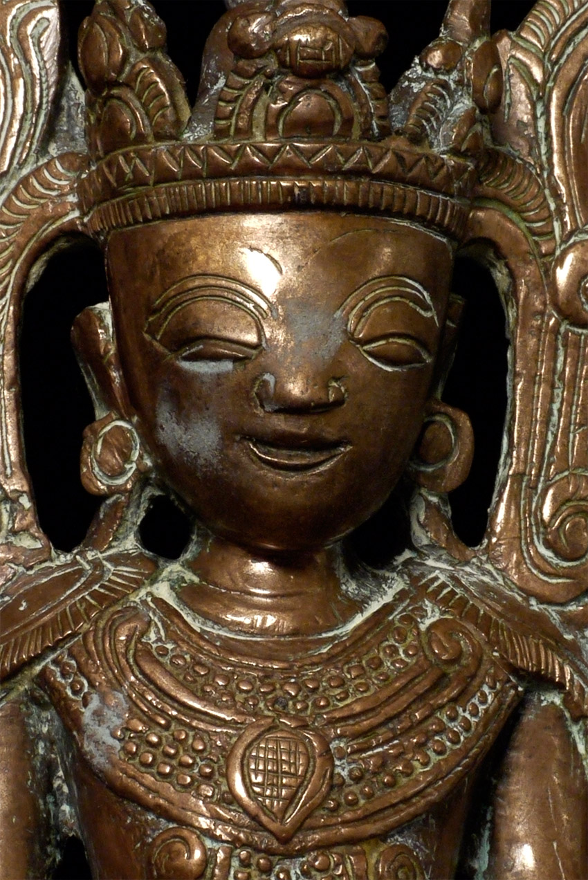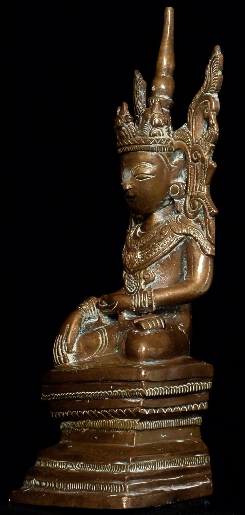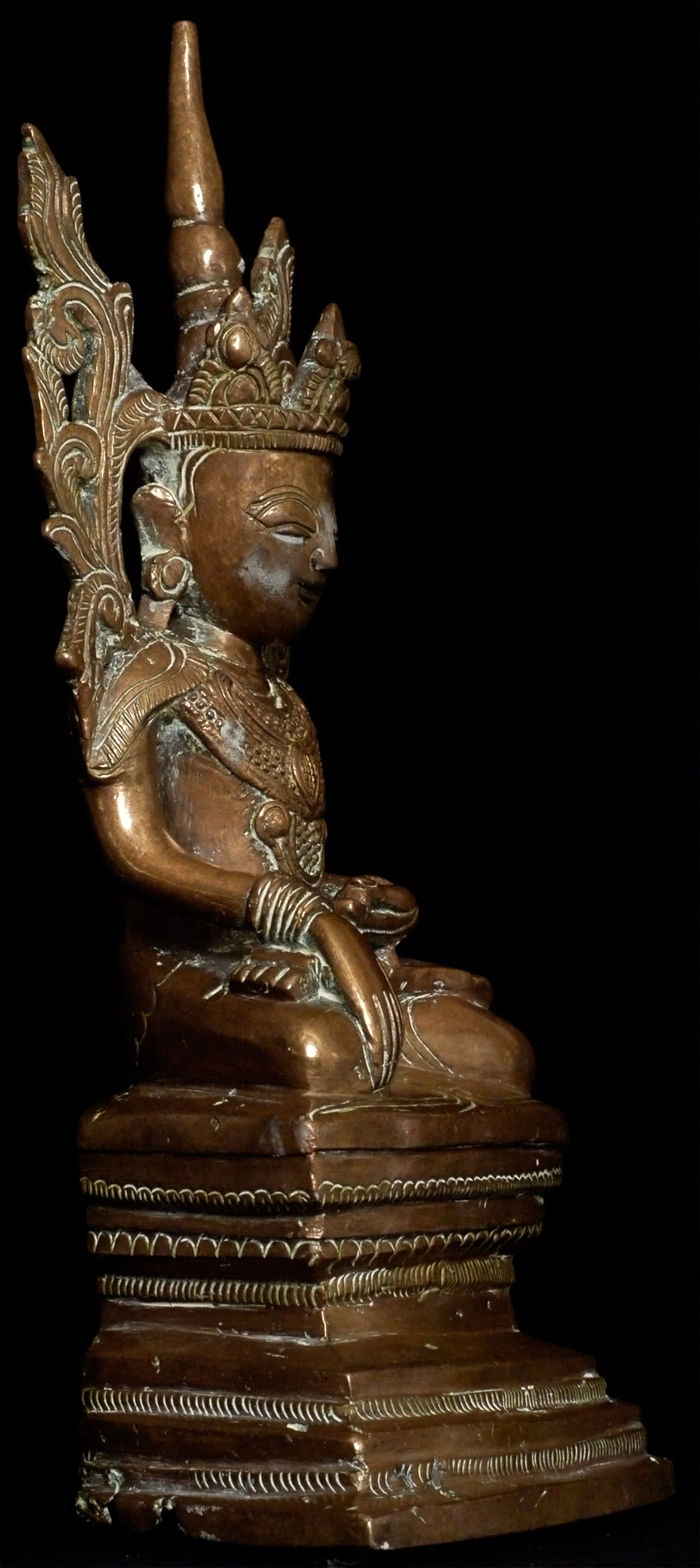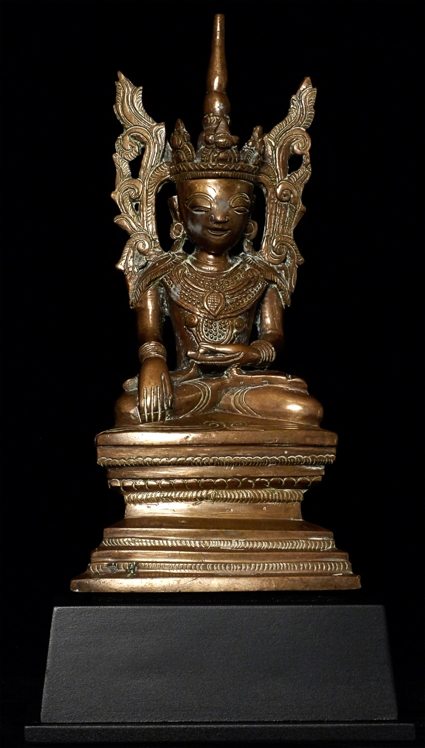 Delightful circa 1900 "Jambupati" style Burmese Buddha. The wide-set eyes and distinctive ornamentation suggest a strong Mon influence. Sits 8.5" tall, bottom measures 4" x 2.5"