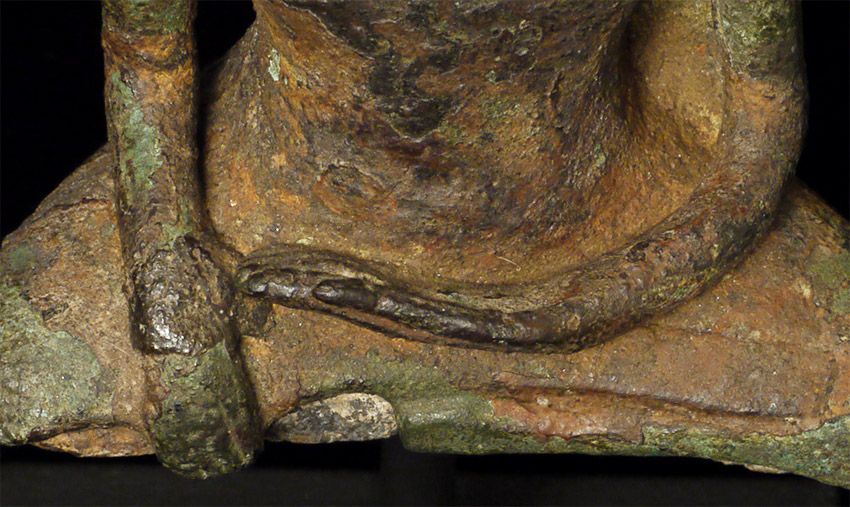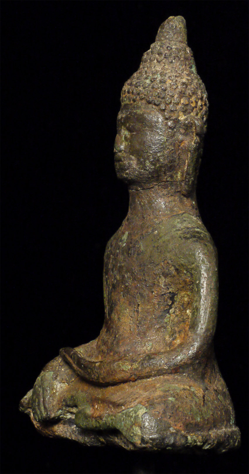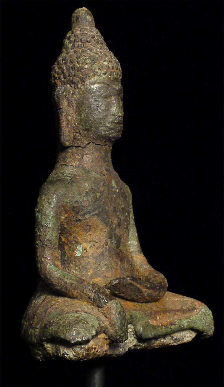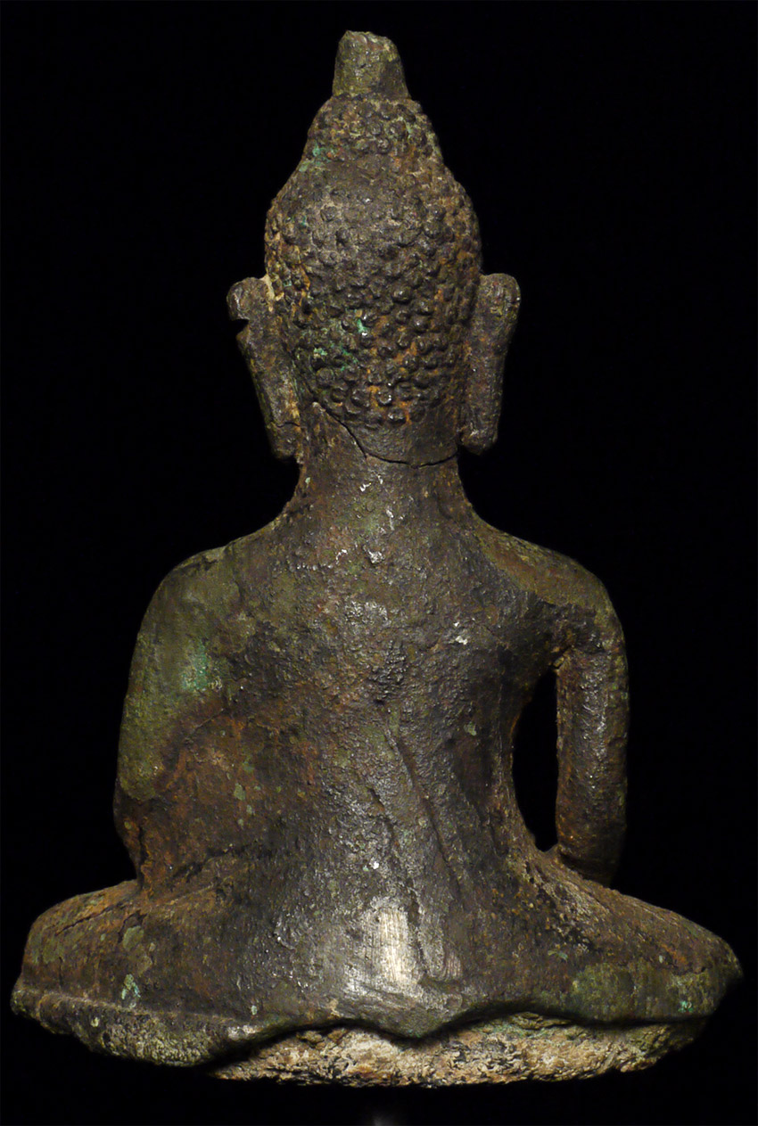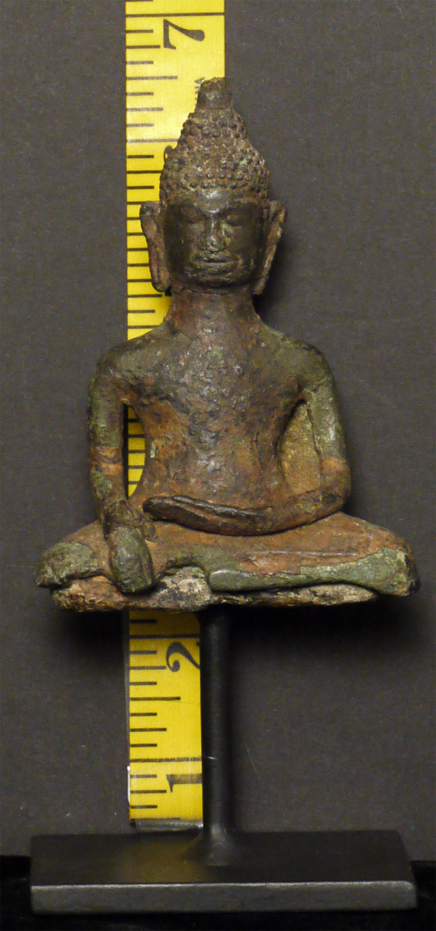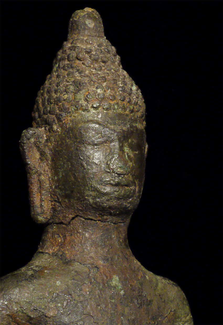 Rare 9/10th Century Cambodian bronze Buddha. Unusually serene countenance for this period. The head was almost certainly cast separately and then attached when originally made- it also looks to have been reattached. Some of the lower legs are absent- this may be an original casting flaw. Still, he is in good condition for such an early piece, with a beautiful face and a fantastic feel. 4 1/8 inches tall by 3 inches wide at the knees and 6.5 inches tall on the custom base. Domestic shipping is included on this item, and international shipping is $50, including packing and insurance.