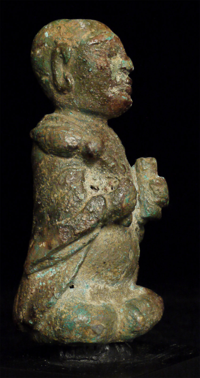 Very old Chinese Buddhist monk. Appears quite early. Lots of personality. Sits 3 3/8 inches tall, 4.75 on custom stand, Domestic shipping with careful packing and insurance is included. International shipping to anywhere in the world is $50.