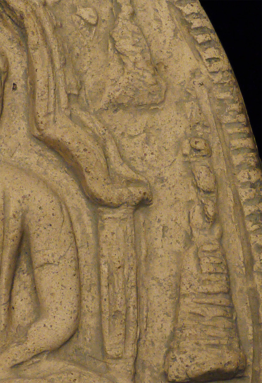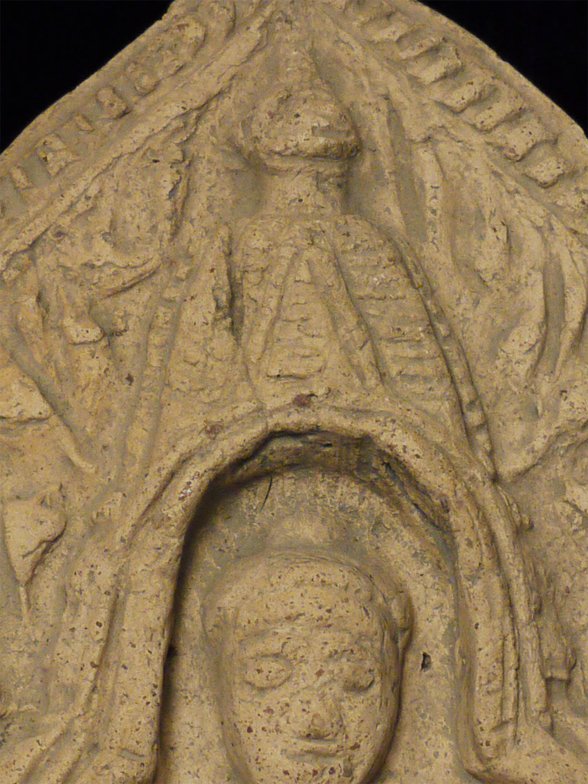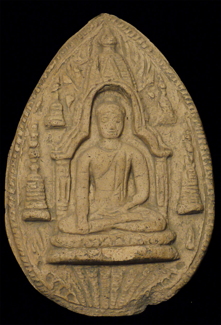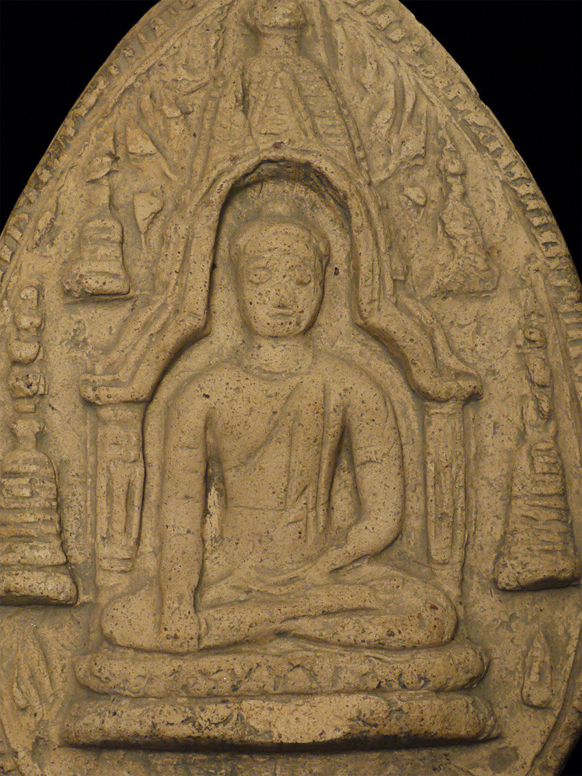 Authentic Dvarati or other early Buddha tablet. Approaching 1000 years old, this piece has influences of different styles, but is probably from Burma, and possibly from Thailand. The prototypes for this style come from the Pala style in India Years ago there were a number of these in the market place, but the authentic ones have mostly disappeared. I bought a group of early tablets about 20 years ago and kept a few of the best examples for myself, of which this is one. Large at almost 5 inches tall. Most of the others I purchased were found in multiples- this type was only this one found.