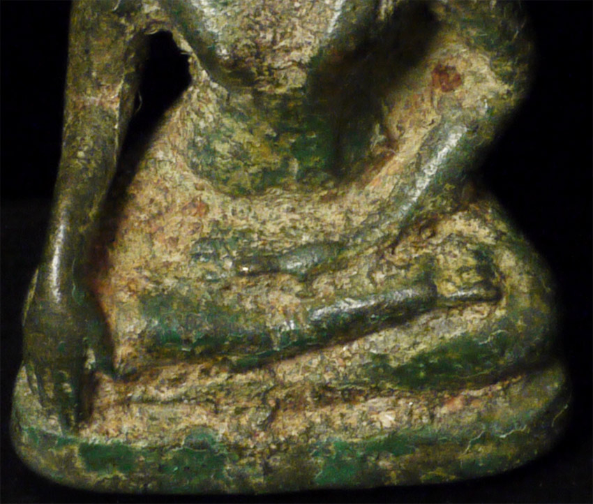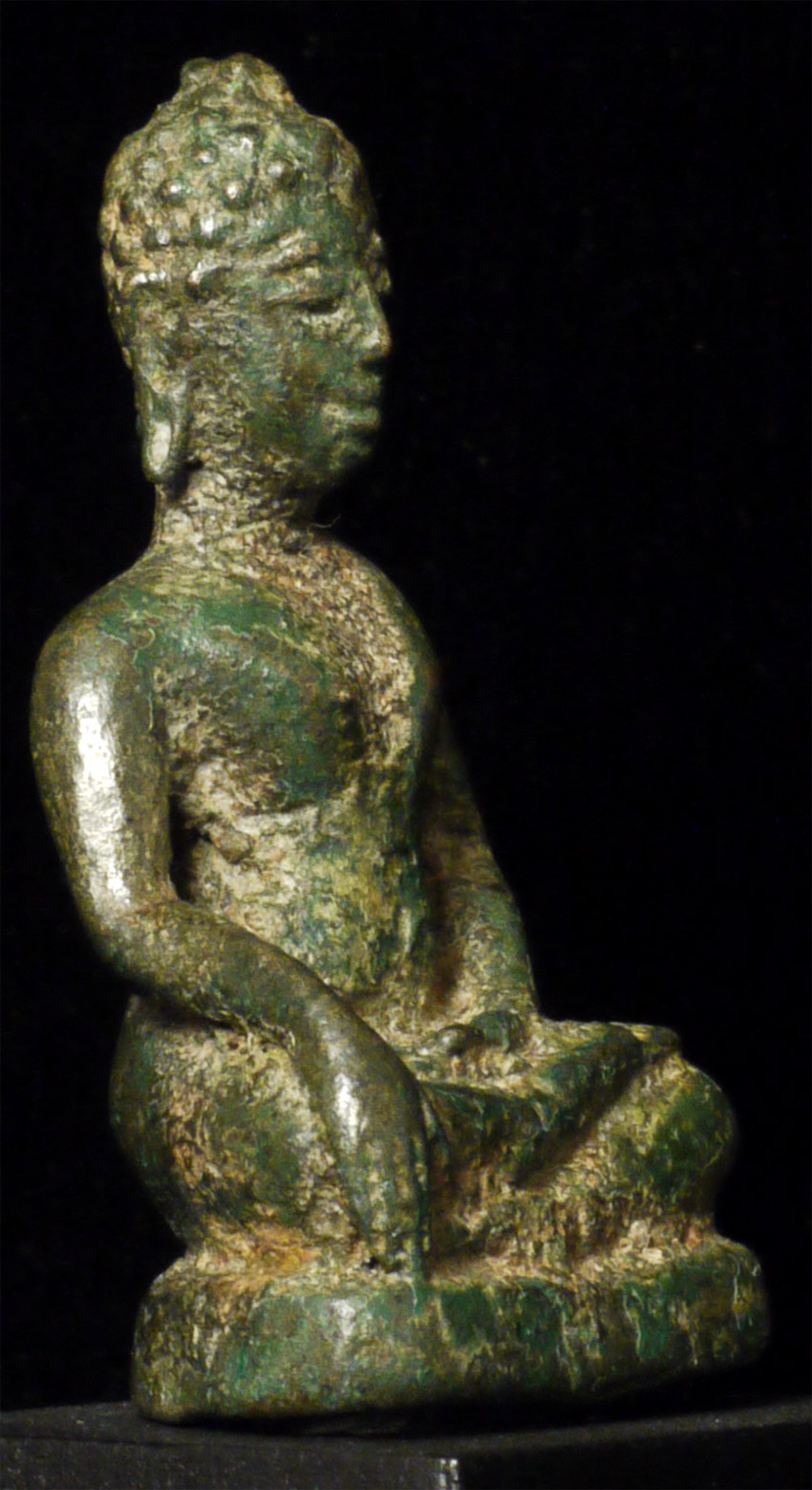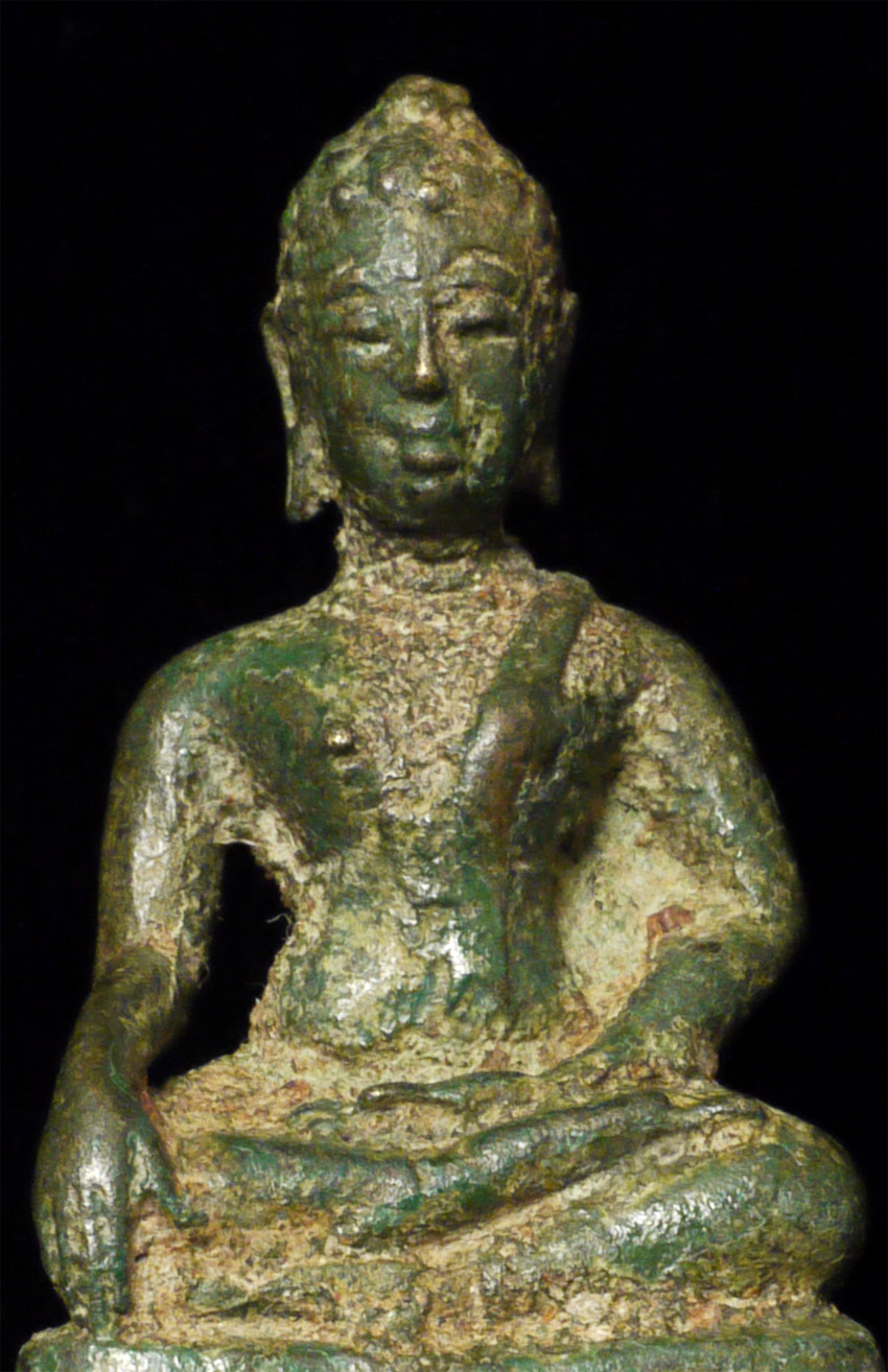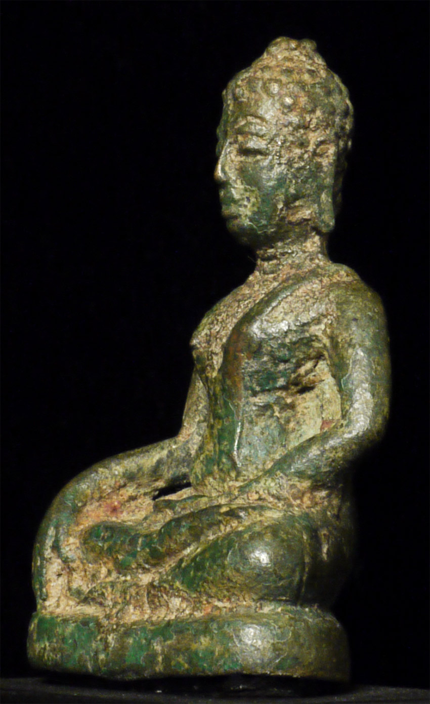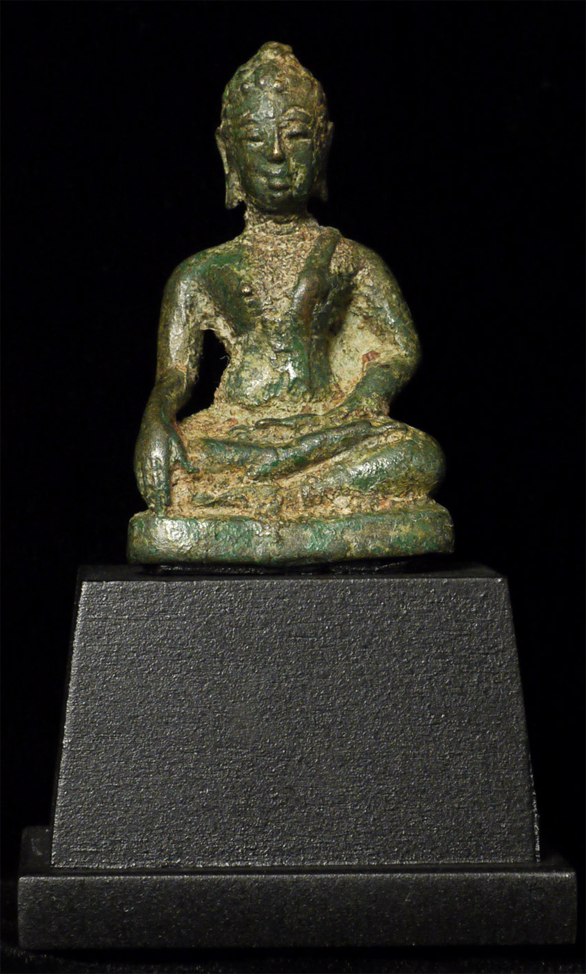 Rare 14/15thC true miniature Thai bronze Buddha. Remains of deeply encrusted soil which indicates long burial. Sits 1.75 inches tall, 3 inches on a custom base. There are many emulations and 19th/early 20th century miniature Thai bronze Buddhas- this is a true 500+ year old very fine early one. Very special. Domestic shipping with careful packing and insurance is included. International shipping to anywhere in the world is $50.