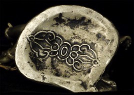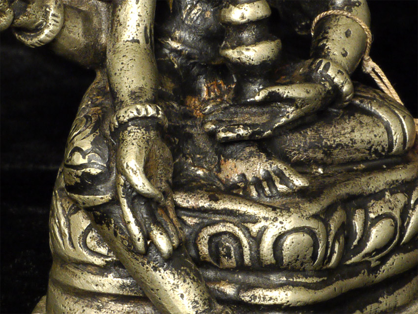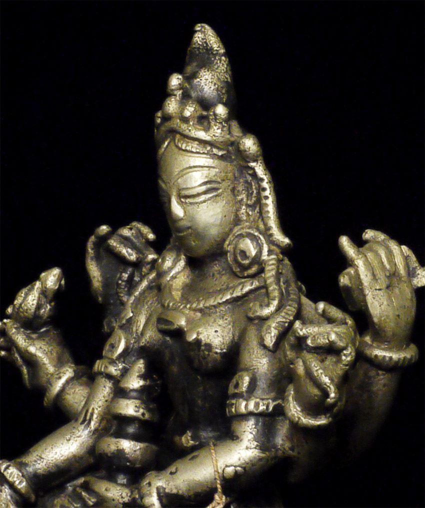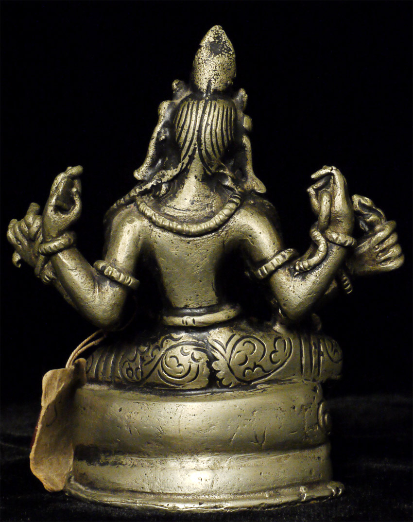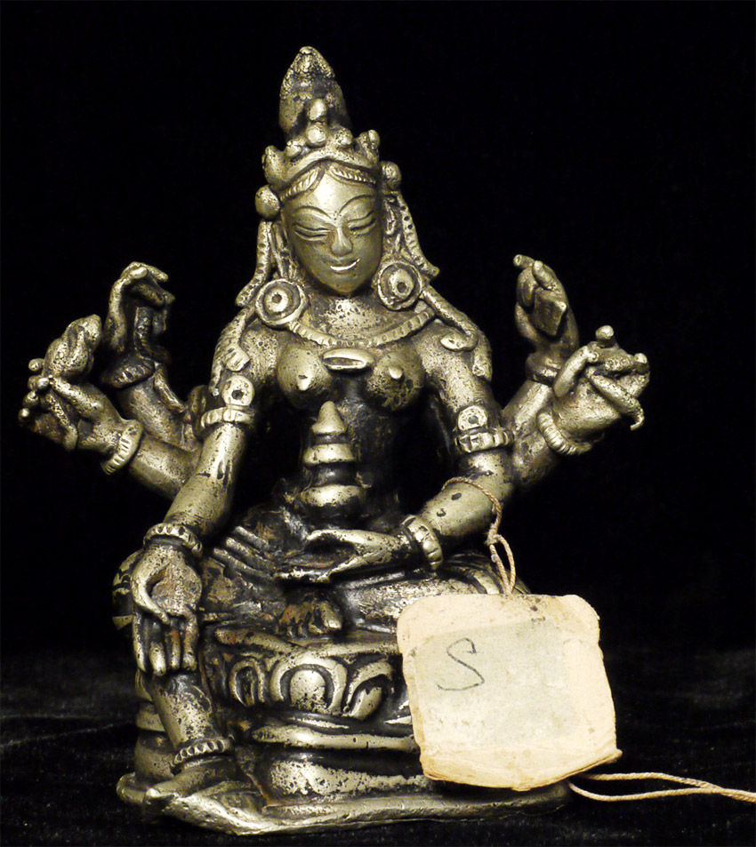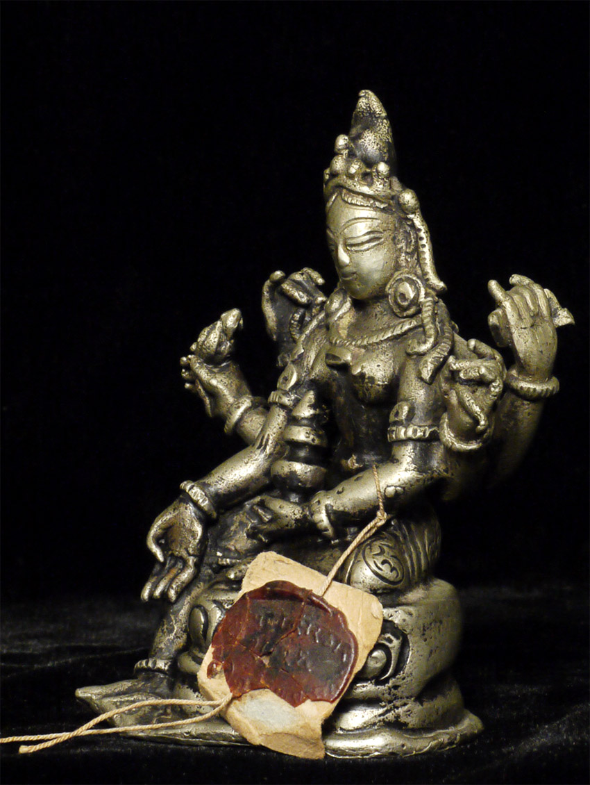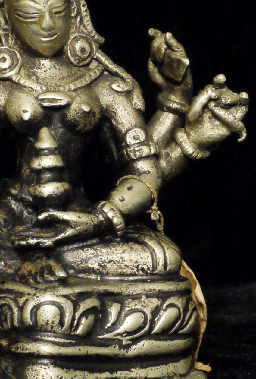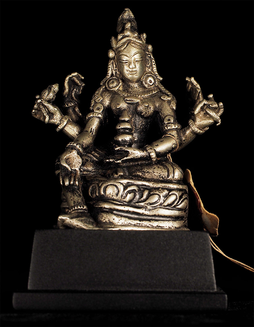Rare and unique "Tibetan silver" or Bronze Bodhisattva. This piece measures 3 inches tall and 4 1/8 inches with its custom base. Despite its small size, it has a big presence. There may be a loss to one or more implements in her hands. Domestic shipping with careful packing and insurance is included. International shipping to anywhere in the world is $50.