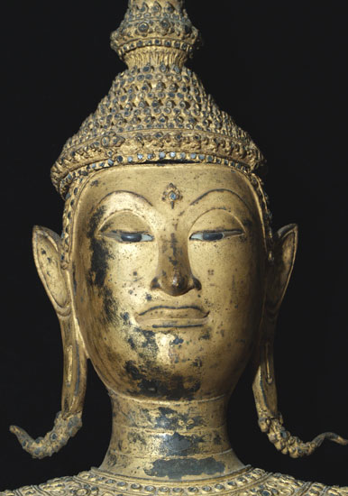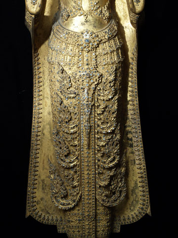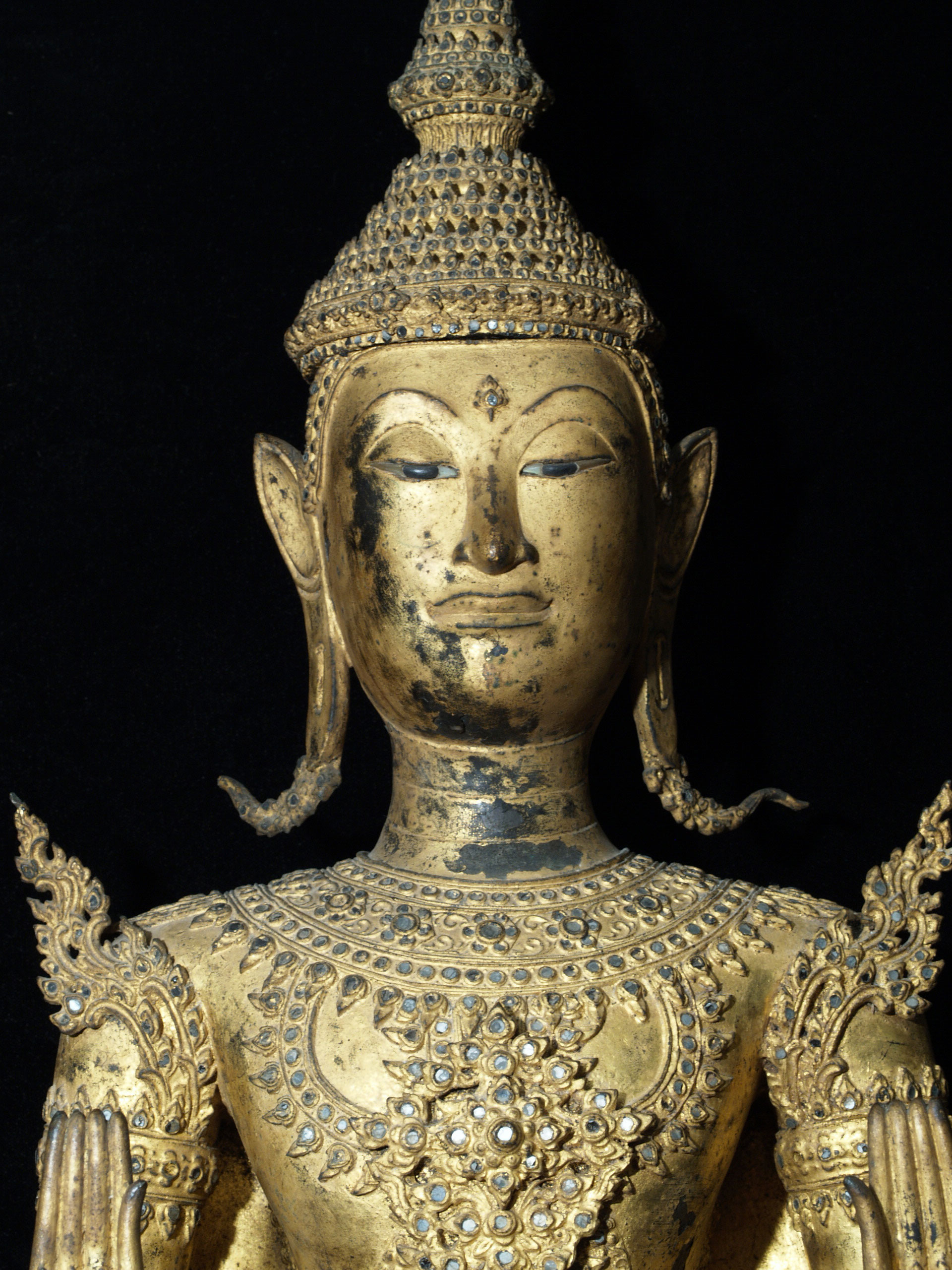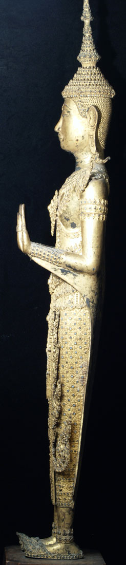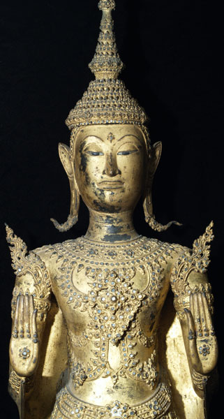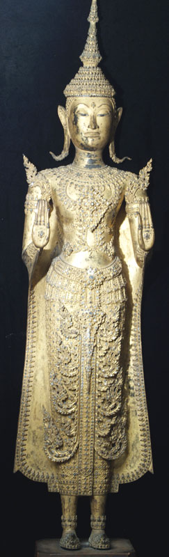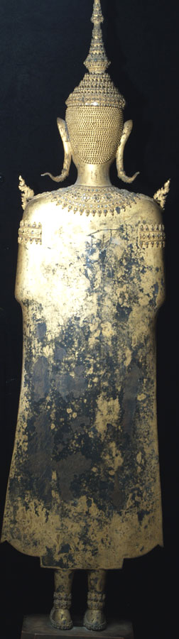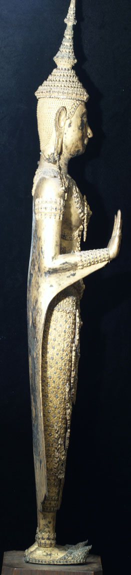 Price significantly reduced! Extremely fine and very large Early Rattanakosin Royal Standing Buddha in the Calming the Waters, or Stopping Fear Mudra. This was cast during sometime during the reign of either Rama 11 or Rama 111 (roughly 1825 to 1850). It stands a very impressive 37 inches without the modern wooden base, and 44 inches tall with the base. It is extremely heavy- It is too heavy for my postal. Remarkably, there is no loss or damage or repair other than typical wear to the gilding as seen in the photos. On Buddhas of this size and complexity, this is extremely rare. There are obviously many levels of quality in the castings of Buddhas- on Royal Rattanakosin Buddhas, as they grow larger, the importance of the casting quality increases , as the beauty of these Buddhas is focused on the splendor of their fantastic detail. Many other Thai style focus on more on simplicity. other Buddha styles. As they get larger, it becomes increasingly difficult to keep the small detail as finely cast as it is on this Buddha. Click on the photo of the face, upper chest and finger tips, as it gives the best large photo of the detail (the other photos are a little washed out). The tip of the head and the finial are a thickly cast separate piece- in a few photos this piece is not set on completely evenly-this is not a flaw- it can be shifted in place easily. The inlaid eyes look to be original, and remarkably many of the tiny mirror like “jewels” are still in place after over 150 years. Spent time looking at the awesome composition of this royal beauty- these earlier Rattanakosin Buddhas are less common than the late ones, and are generally more finely made. This size is also especially difficult to find from this early period (larger than the small to medium ones, but smaller than the near life sized ones) This is certainly the finest one of this size I have owned, and is one of the best I have ever seen outside of temple. It was purchased out of a mid-west estate which had a number of Buddhas of high quality and beauty and size. I bought two from the collection, as I had no more space, and I also couldn’t be sure they were real, as they were so large, beautiful, and perfect. They both turned out to be authentic, and I deeply wished I had gone back for them all. This piece will need to be crated and sent by truck.