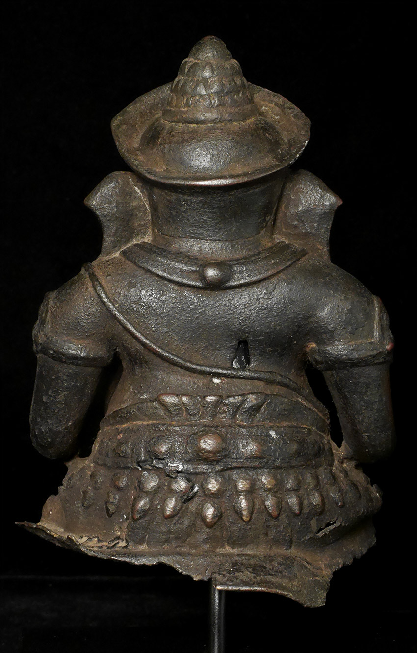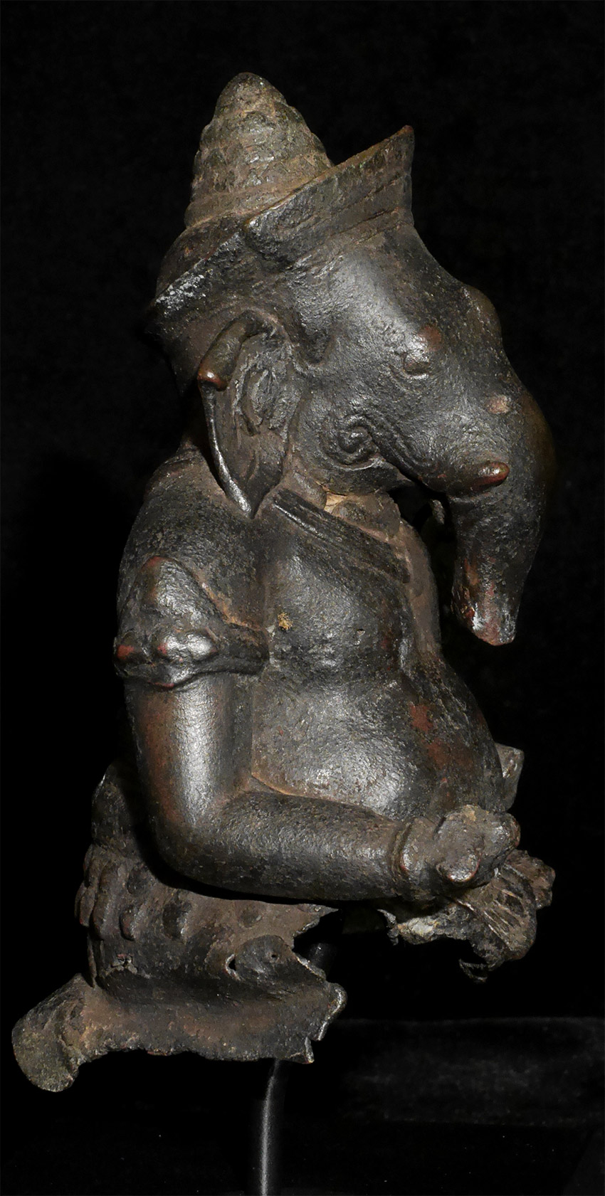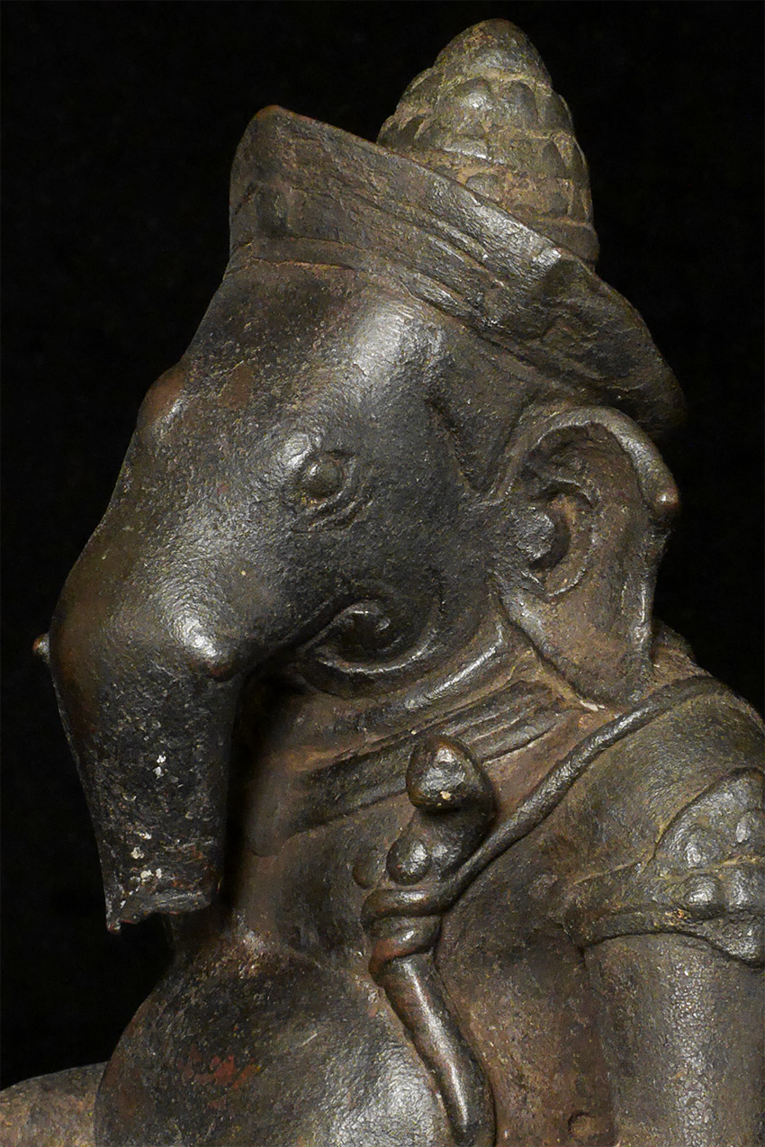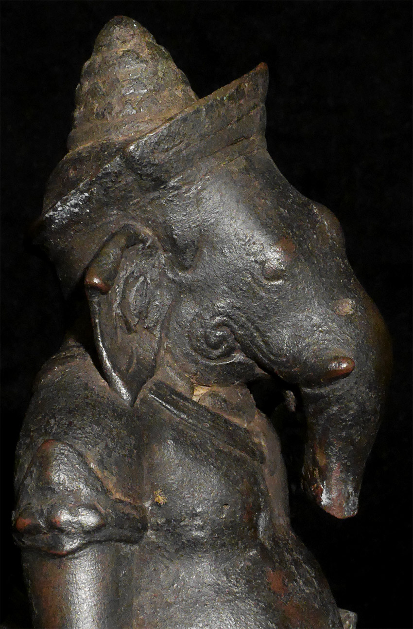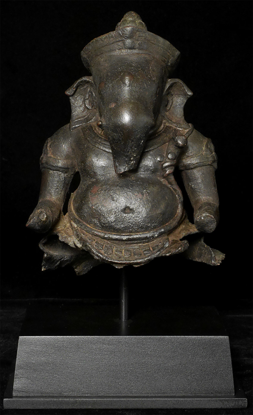 Cambodian Ganesh bust- likely 15thC or earlier, and no later than 16/17thC. Bronze is 6.5". Nine inches including the custom base. Very rare to find an early Cambodian bronze Ganesh of any size, but especially rare to find a relatively large one with such a good face and so much personality. Probably Post-Khmer, and made in the centuries just after the decline of the great Khmer empire. I’ve shown this to one expert who believed it to be a an actual Khmer period (12/13thC) piece, but I believe it would probably be heavier and have more detail to the casting if it were that early, though it is possible. IT is a piece that makes people smile and want to touch it, and that children are drawn to. Many Ganesh images have very little of a “face”, as the large trunk eclipses the mouth and eyes. The sculptor of this piece managed to imbue this fellow with a warmth and character rarely found in a Ganesh bronze. A true personal favorite