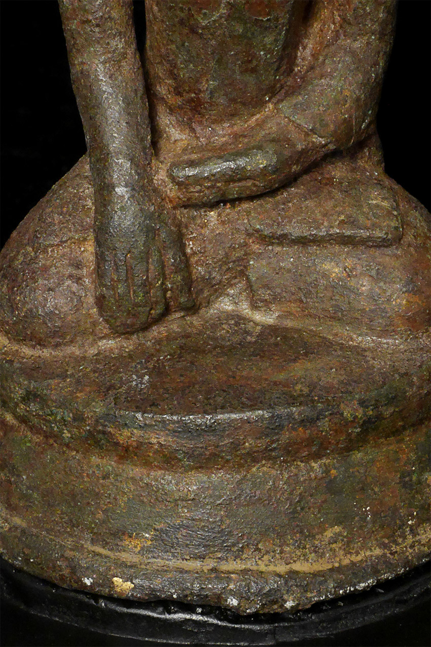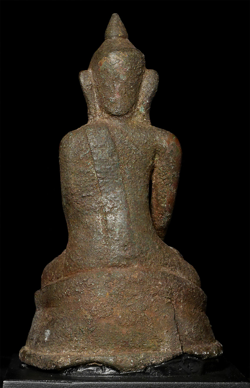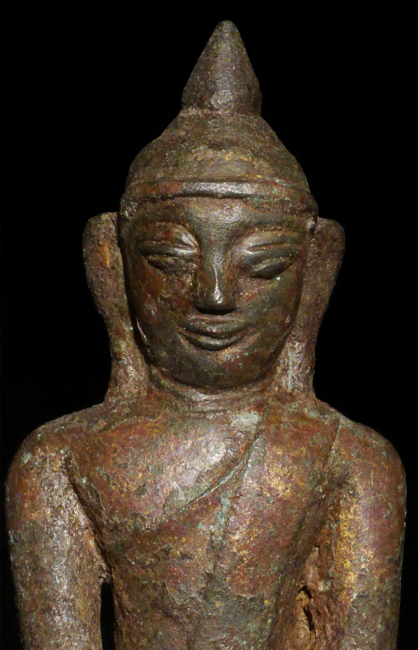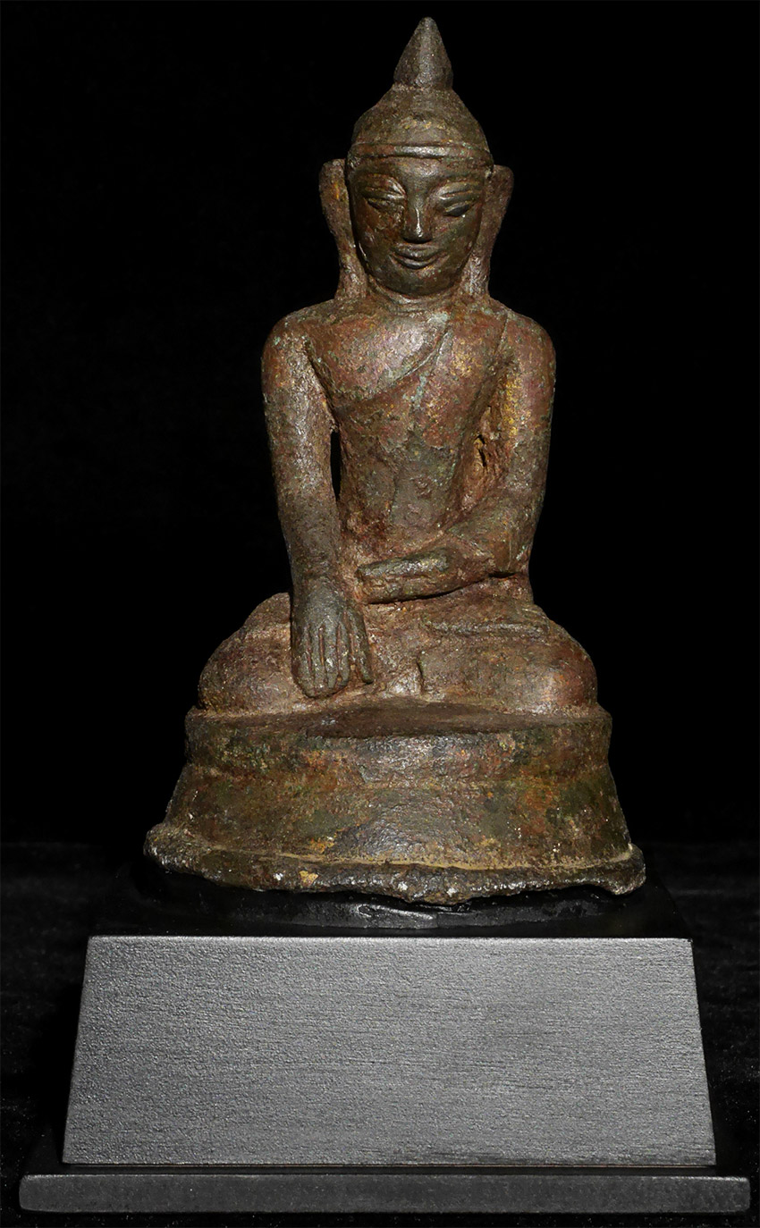 Very nice 14/15thC Mon Buddha with remains of original lacquer and gilding. Very rare type that is contemporary with Post-Pagan and early Ava types. There are so few of this type that you will rarely encounter one- even in a book or museum- the base is very distinctive in its round flat shape and is very similar to late Pagan, as is the head leaning forward and looking downward. The large flappy ears, flat face, and look of the face are very much early Mon style. Serene face and lovely overall composition. 5 7/8" tall, 7 5/8 inches on custom stand. It's a true collector's piece. Domestic shipping with careful packing and insurance is included. International shipping to anywhere in the world is $50.