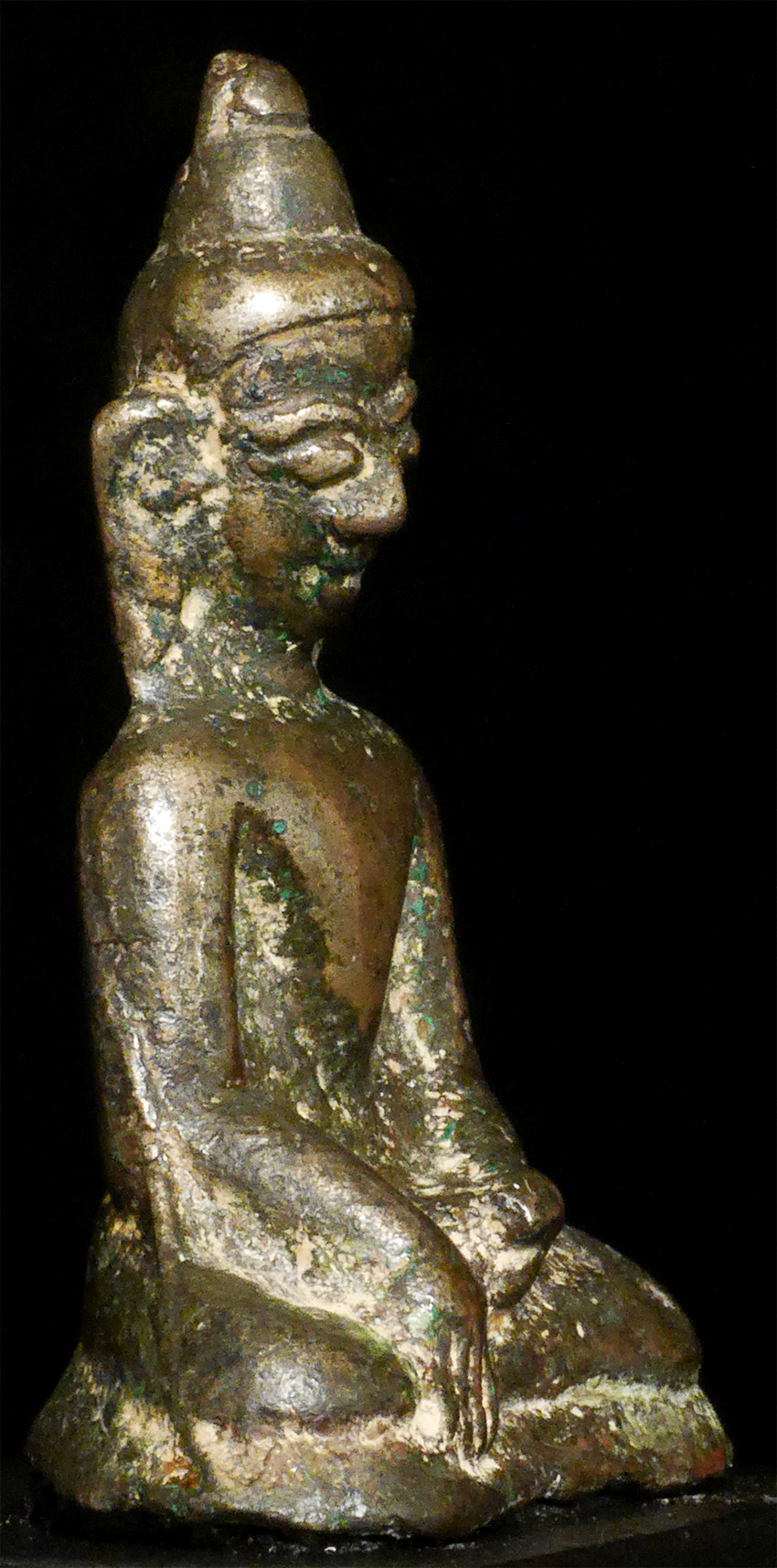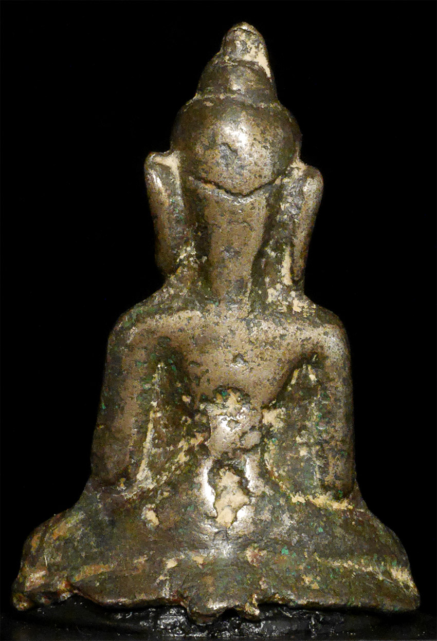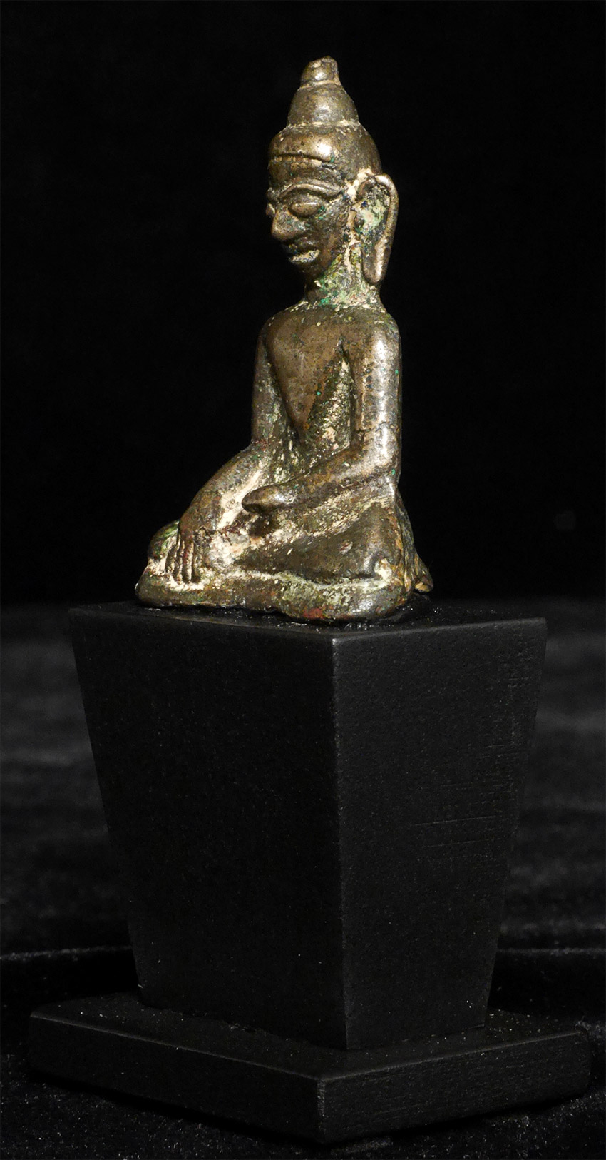 Early Burmese Mon style silver Buddha. Probably approaching 1000 years in age. This type is rare in any size, especially solid-cast in silver. Sits 2 inches tall and 3.75 inches on its custom base.