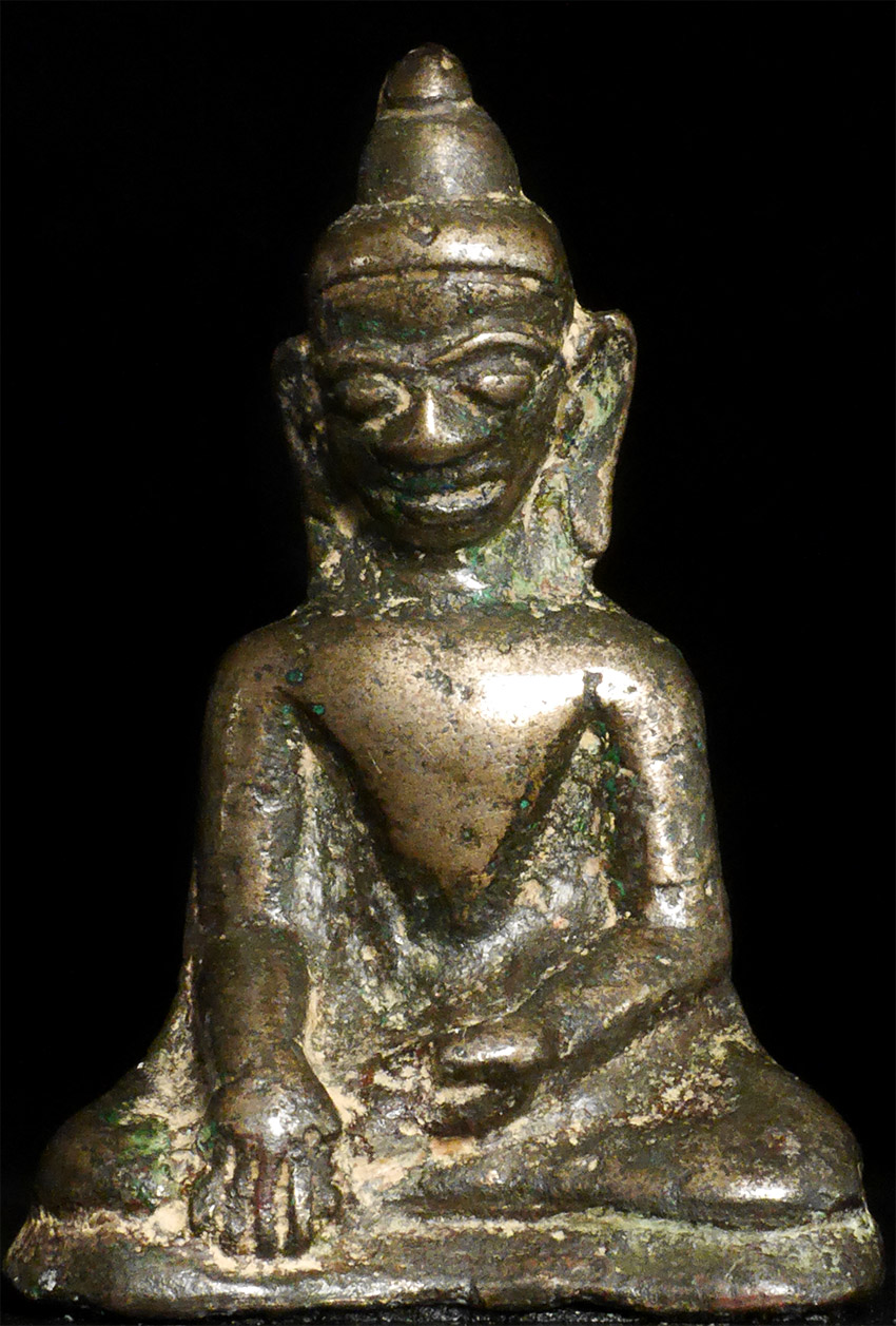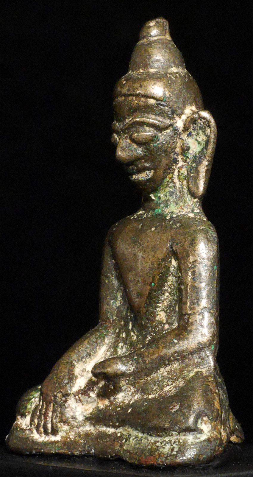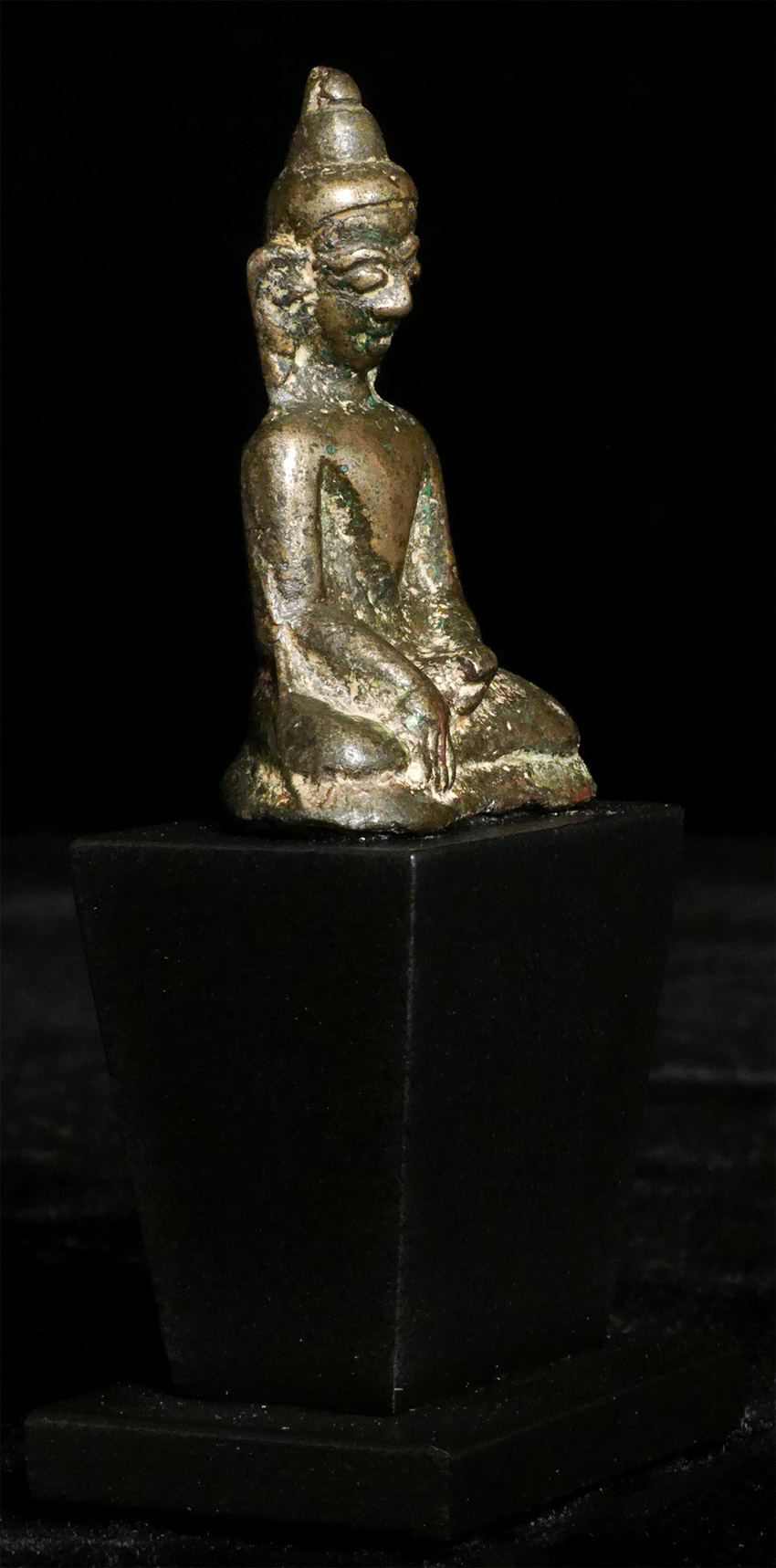 Early Burmese Mon style silver Buddha. Probably approaching 1000 years in age. This type is rare in any size, especially solid-cast in silver. Sits 2 inches tall and 3.75 inches on its custom base.