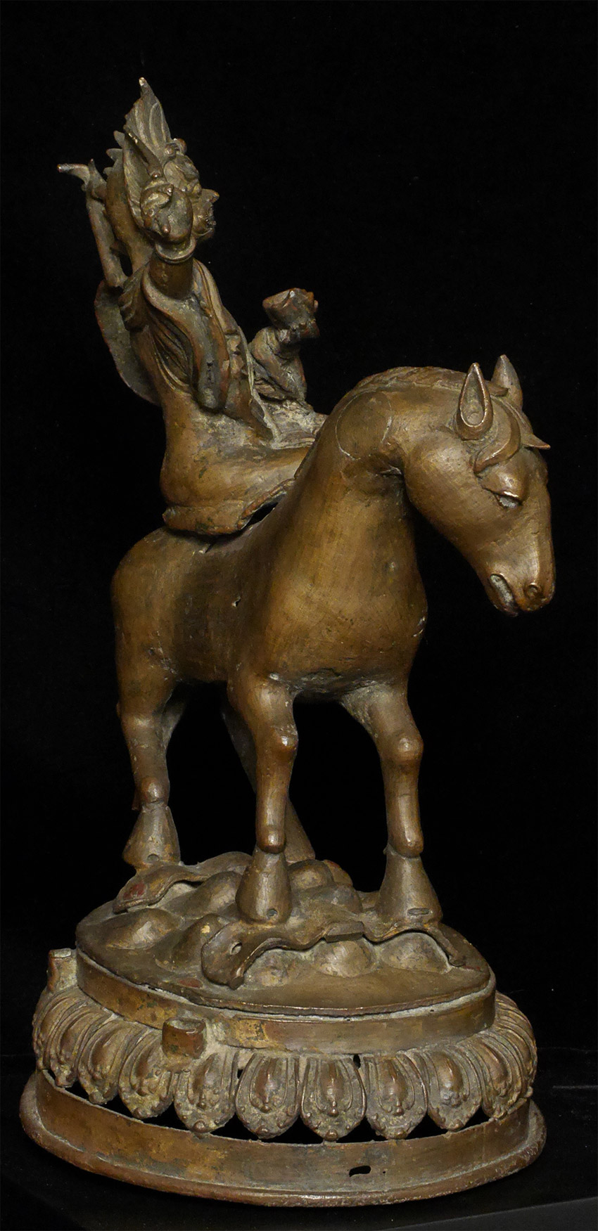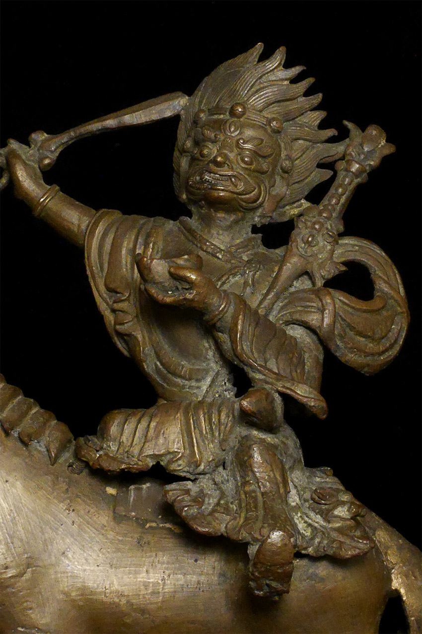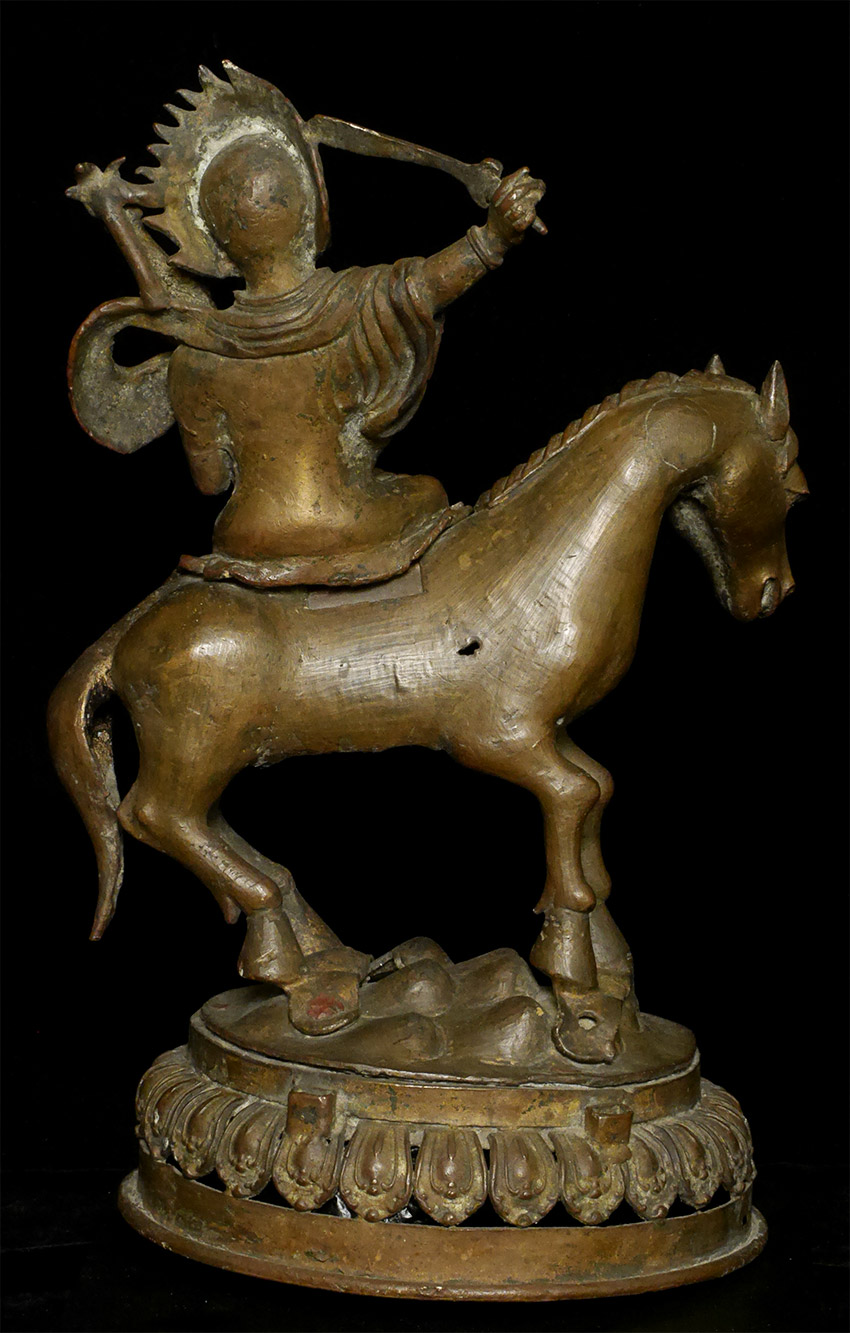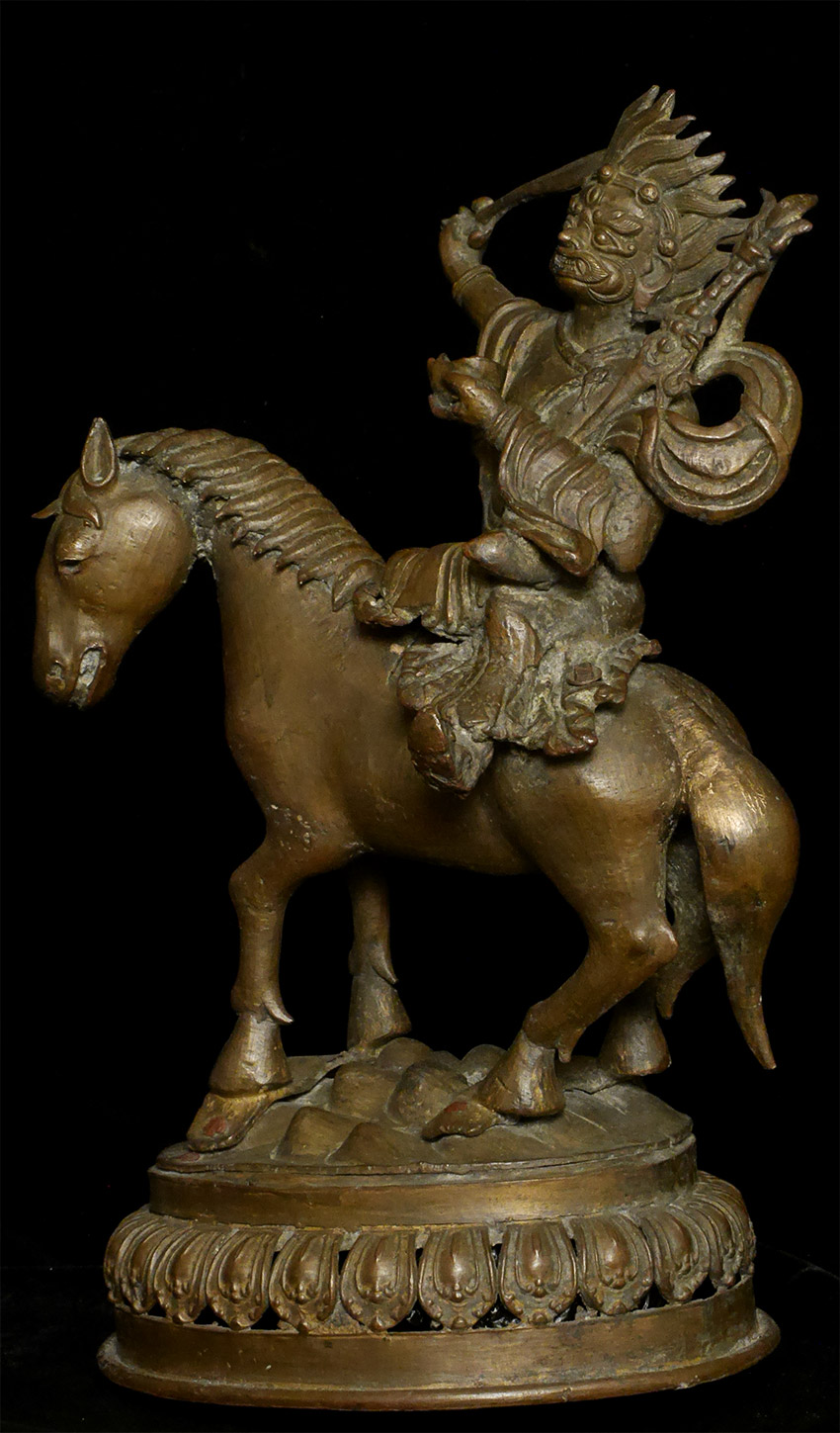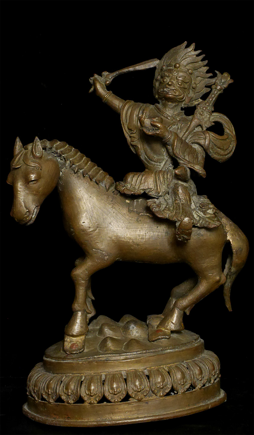 A large and dynamic 19th century Mongolian bronze fierce deity on horseback. Purchased by previous owner from famed Asian Antiquity dealer Rudi in 1961 at a time when few dealers were bring Mongolian and Tibetan bronzes to the US. Rudi was also a spiritual teacher who funded his teaching through his antique trade. By great coincidence, my very first teacher (a famed and respected teacher in his own right) studied under Rudi in the 1960's. 14.75 inches tall, 11 inches nose to tail. On its custom base it sits an impressive 16.5 inches tall. The horse has one of the most sensitively modeled hose faces I have come across on a Mongolian statue. The entire piece is a remarkable juxtaposition of provincial folk art and refined spiritual art. It is amazing the extent to which it is both naive and sophisticated at the same time- all the while conveying tremendous energy and movement. Very different than any other Mongolian statue I have offered, large or small. Figure is loosely attached to base. Tail repaired, and other small damages/repairs as seen in the photos. A one of a kind piece.