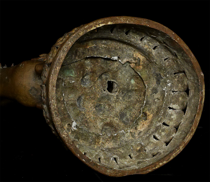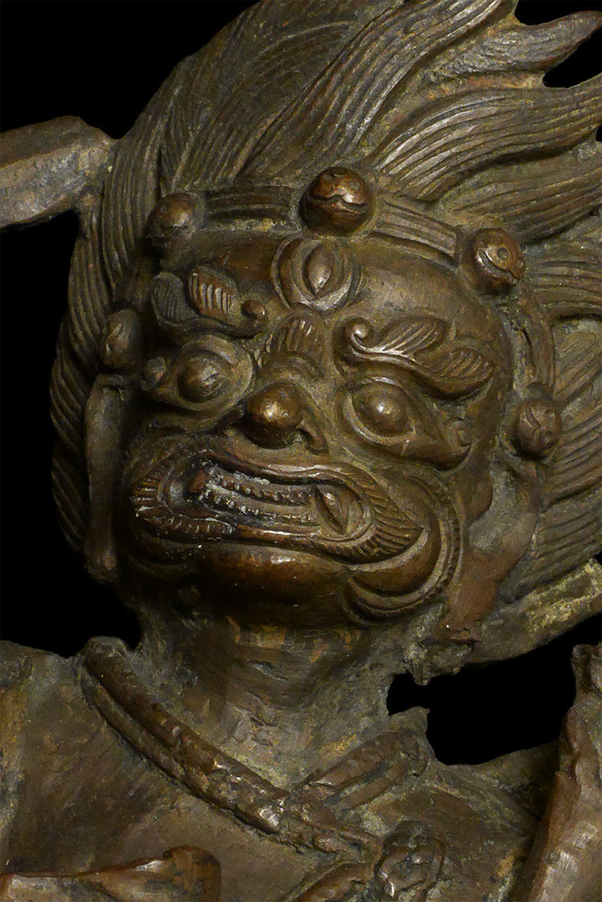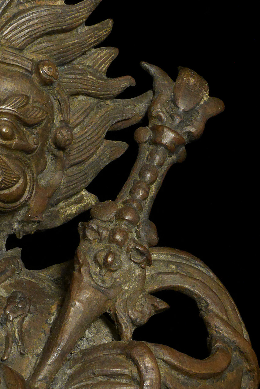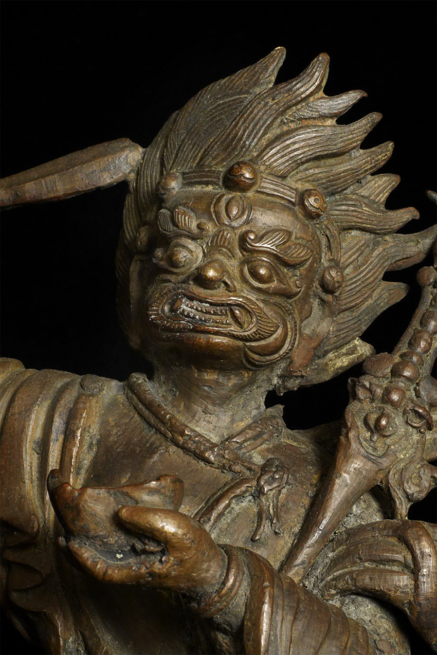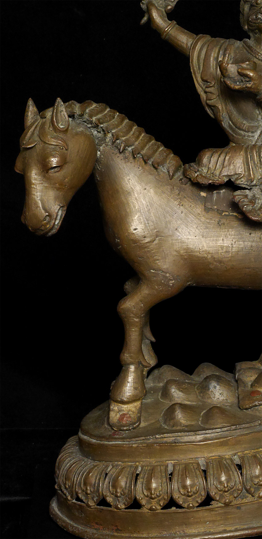 A large and dynamic 19th century Mongolian bronze fierce deity on horseback. Purchased by previous owner from famed Asian Antiquity dealer Rudi in 1961 at a time when few dealers were bring Mongolian and Tibetan bronzes to the US. Rudi was also a spiritual teacher who funded his teaching through his antique trade. By great coincidence, my very first teacher (a famed and respected teacher in his own right) studied under Rudi in the 1960's. 14.75 inches tall, 11 inches nose to tail. On its custom base it sits an impressive 16.5 inches tall. The horse has one of the most sensitively modeled hose faces I have come across on a Mongolian statue. The entire piece is a remarkable juxtaposition of provincial folk art and refined spiritual art. It is amazing the extent to which it is both naive and sophisticated at the same time- all the while conveying tremendous energy and movement. Very different than any other Mongolian statue I have offered, large or small. Figure is loosely attached to base. Tail repaired, and other small damages/repairs as seen in the photos. A one of a kind piece.