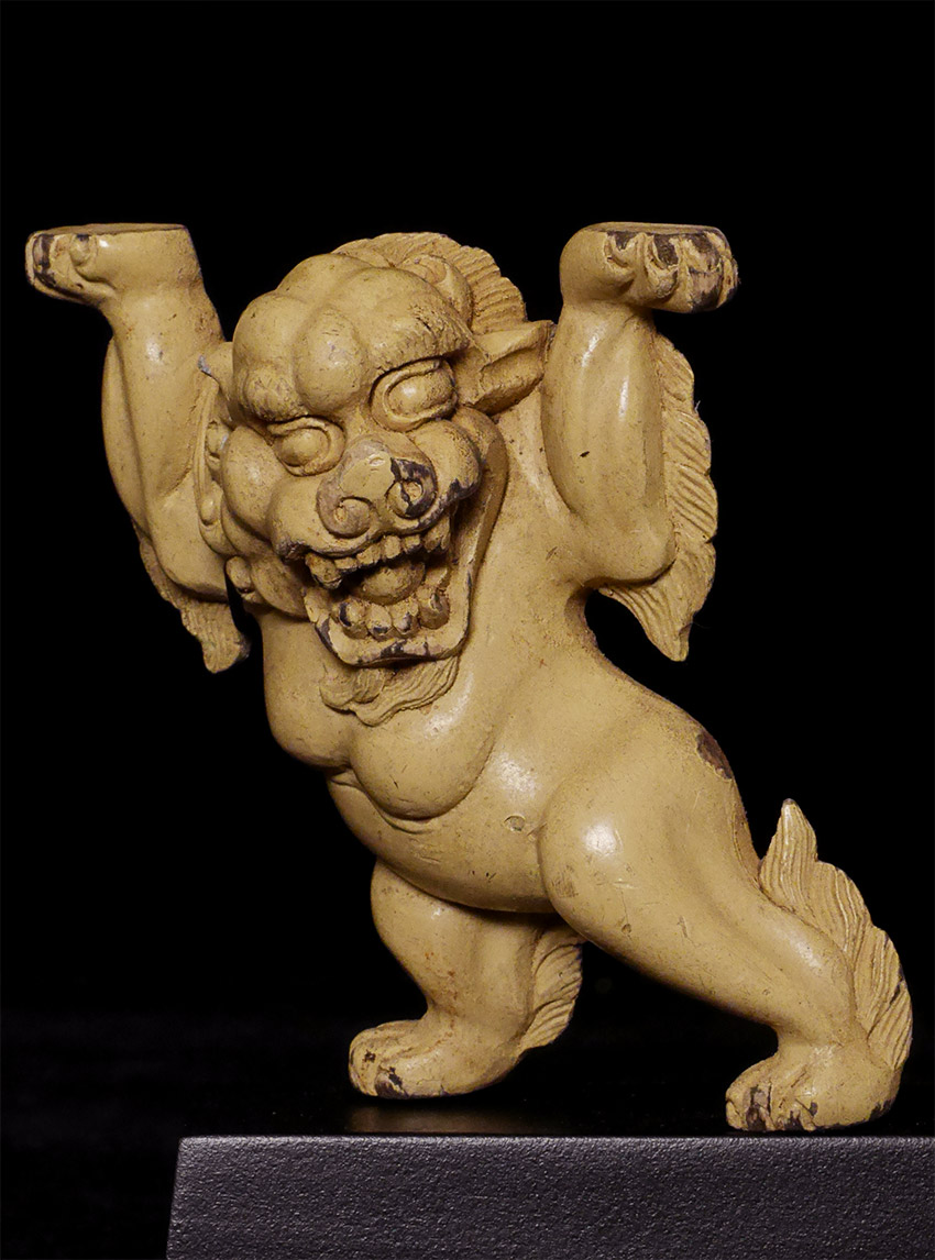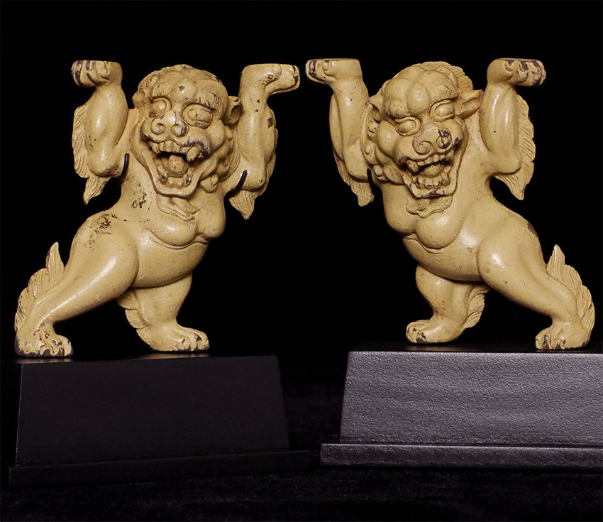 Fabulous pair of antique Snow Lions-probably originally from the base of a large Tibetan or Mongolian Stupa. Very finely carved, with what appears to be original surface. Pair is 3.25 inches tall, 4.5 inches on custom stands.