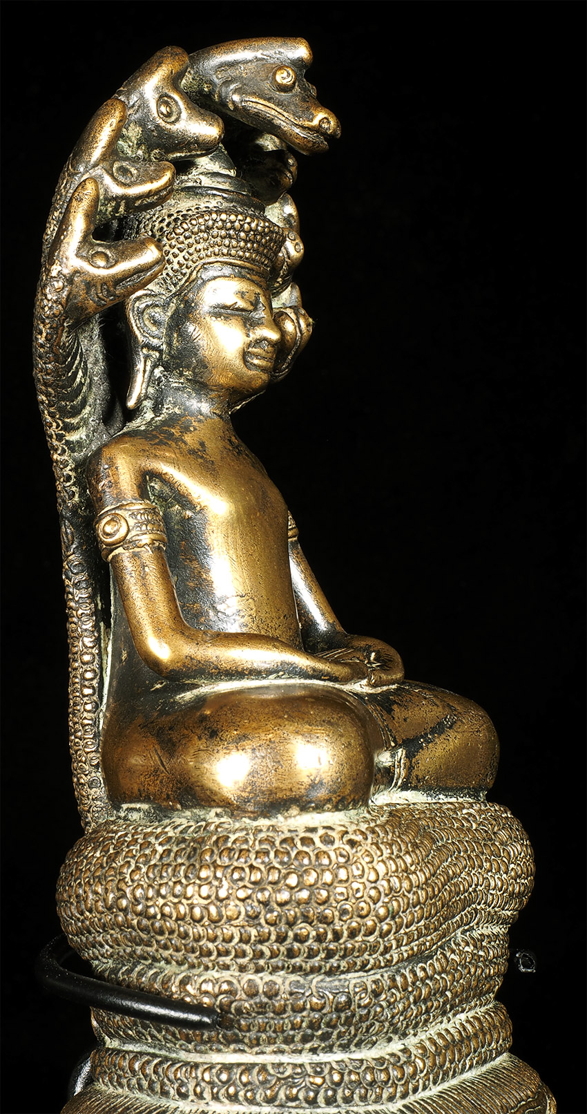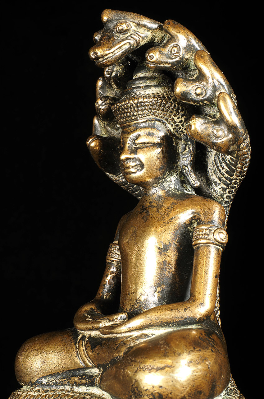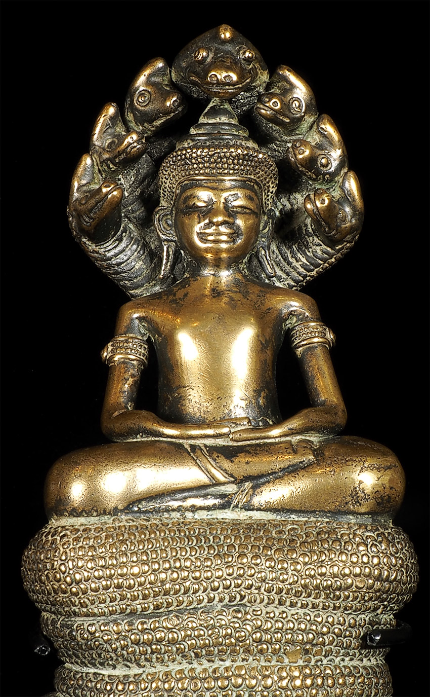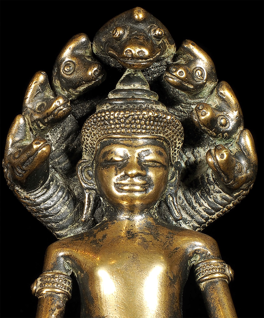 17/18thC Cambodian Bronze Naga Buddha. I've had several of this type before over the past 30 years, but never a Naga Buddha. And what a Naga Buddha it is! Each Naga head has a real face with a distinctive personality. The body and back are filled with the most intricate detail I've seen on almost any Buddha I've owned. A number of related examples on my website include: 5169, 6058, and 6376.Sits 6 7/8 inches tall. Very special.