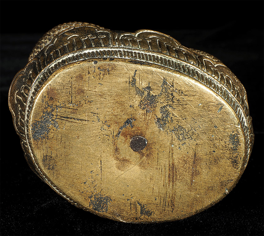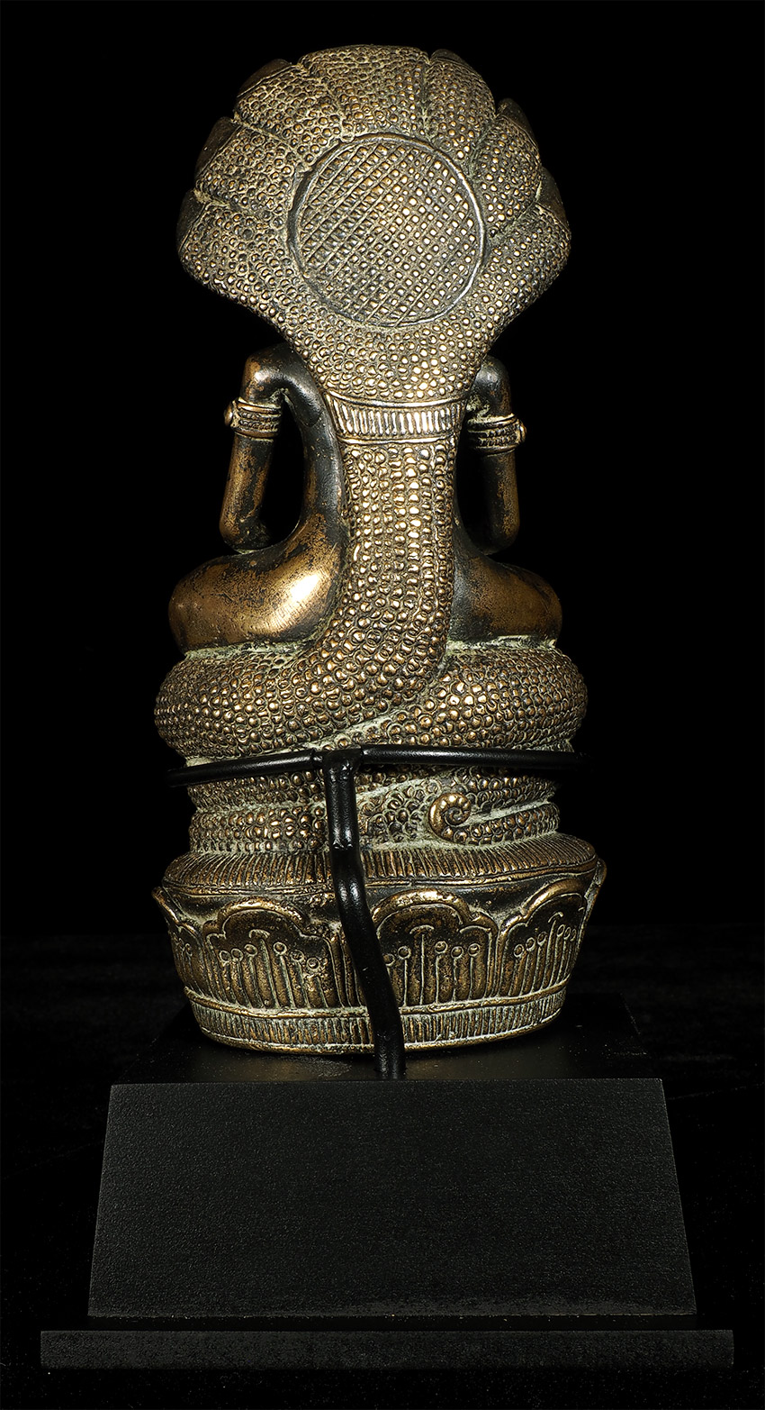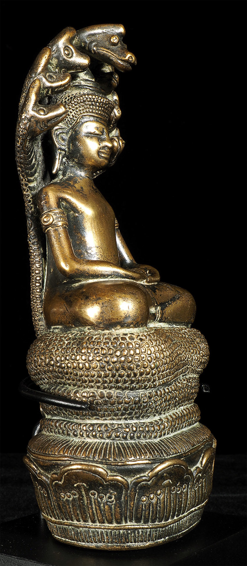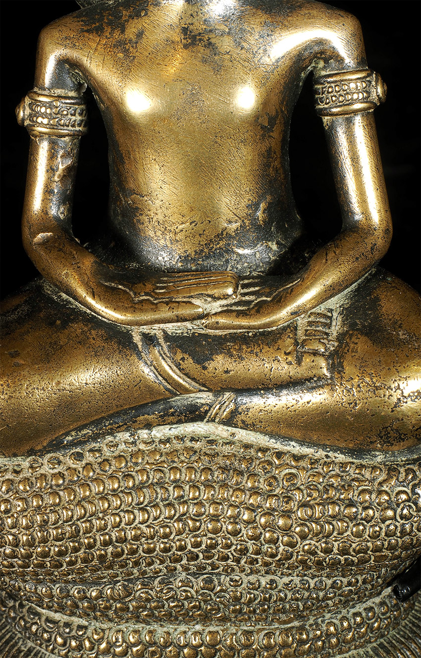 17/18thC Cambodian Bronze Naga Buddha. I've had several of this type before over the past 30 years, but never a Naga Buddha. And what a Naga Buddha it is! Each Naga head has a real face with a distinctive personality. The body and back are filled with the most intricate detail I've seen on almost any Buddha I've owned. A number of related examples on my website include: 5169, 6058, and 6376.Sits 6 7/8 inches tall. Very special.